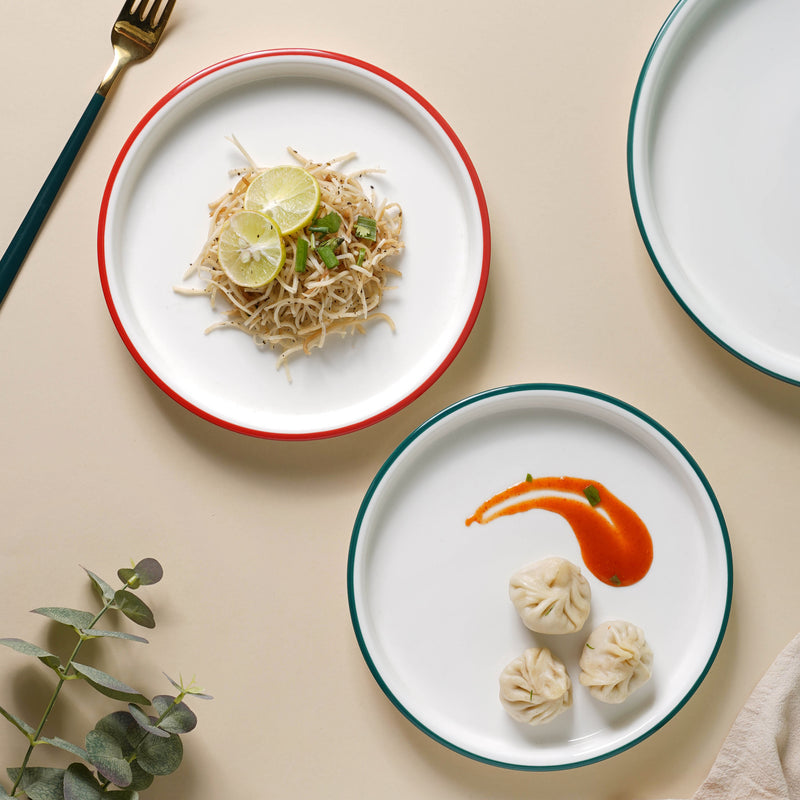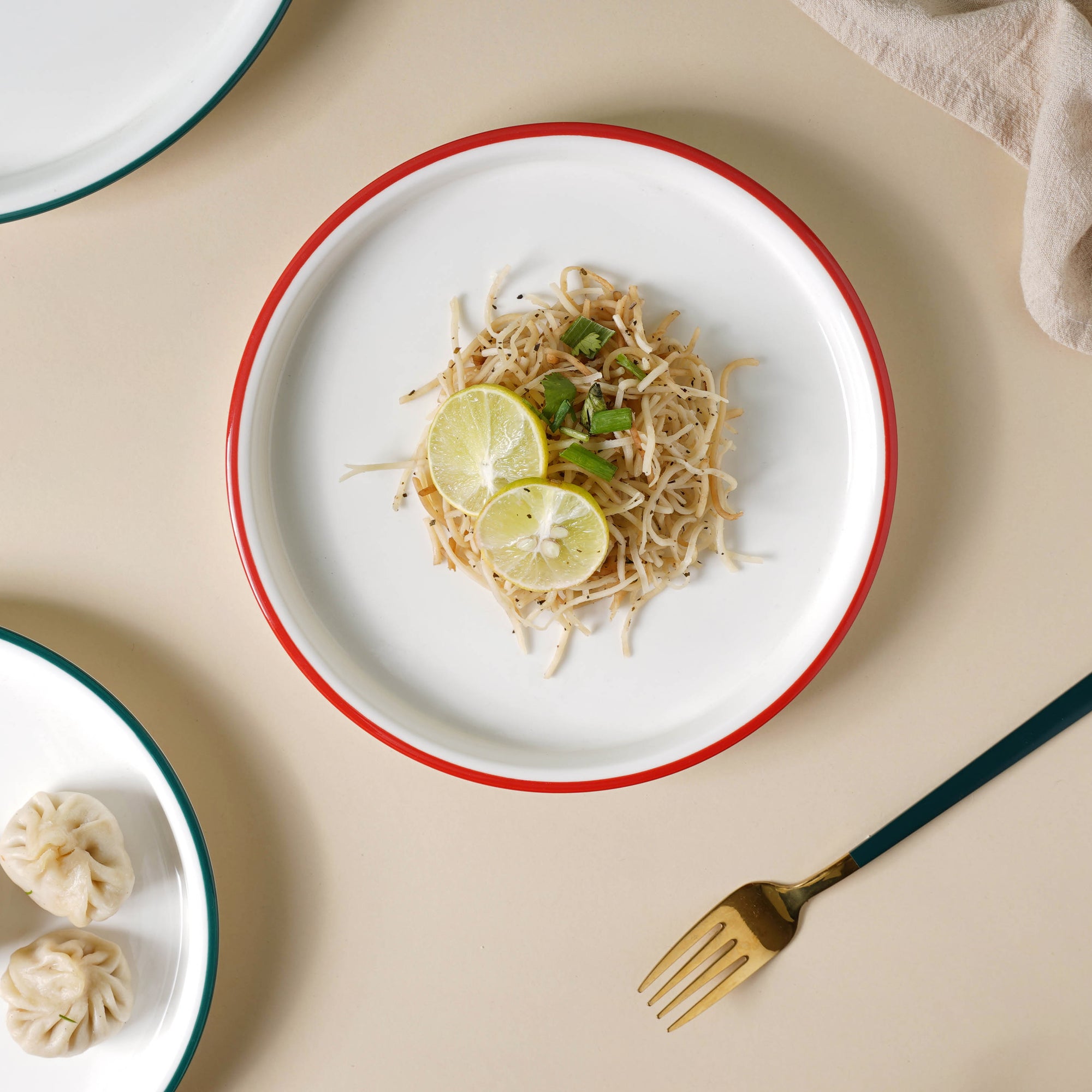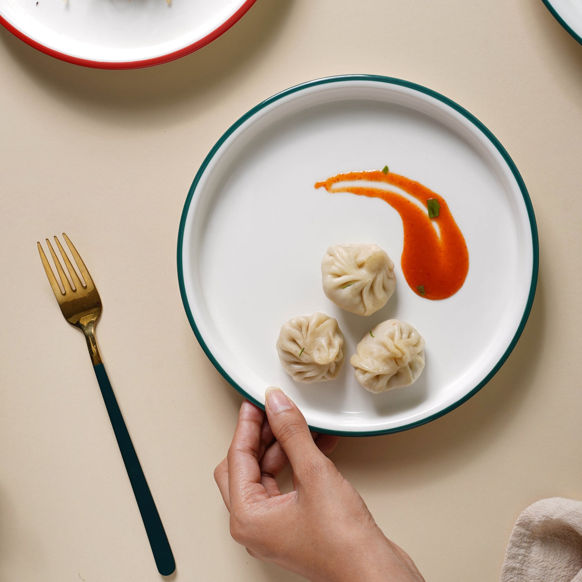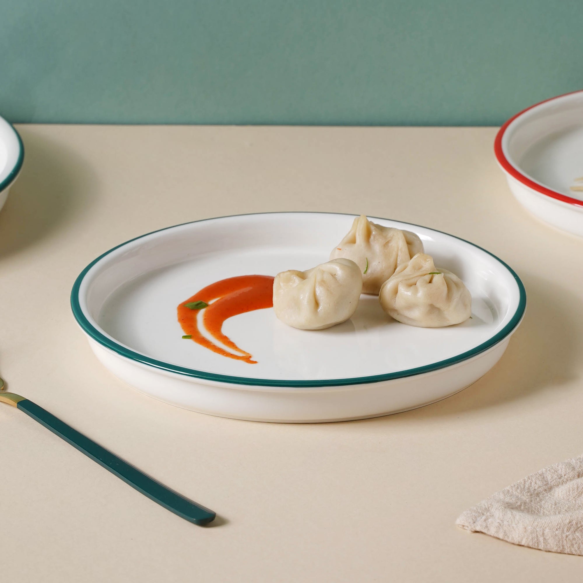 The ceramic plate, with an elevated rim, is ideal for serving appetizers to add opulence to any table setting. The white plate is perfect for bringing practicality to the dinner table, with two simple and stylish color choices on the rim of the plate.