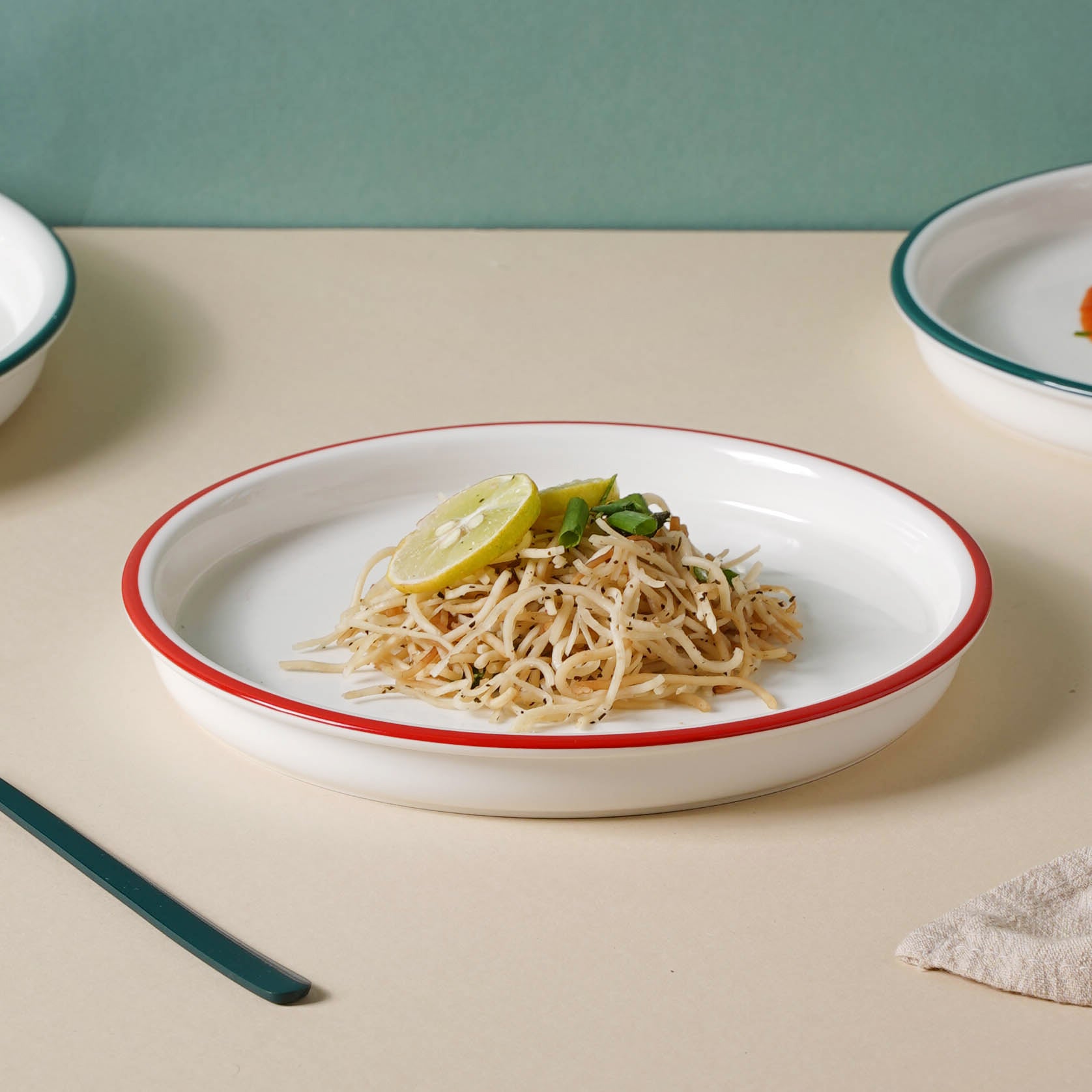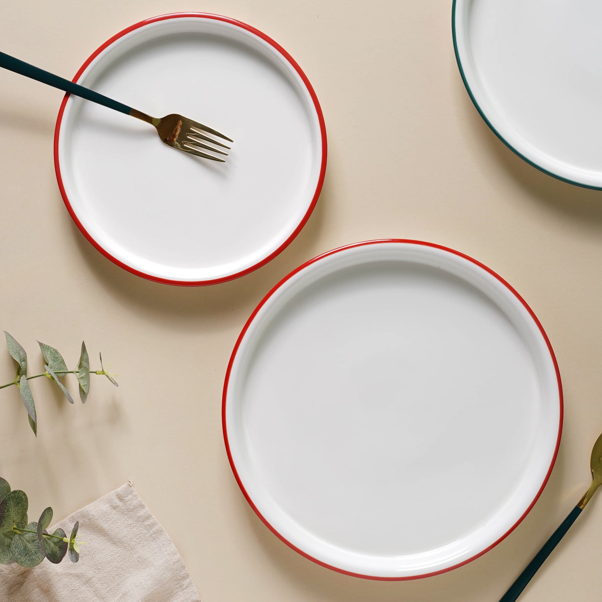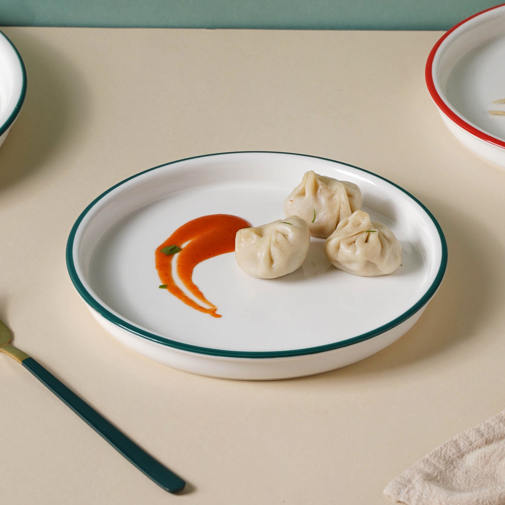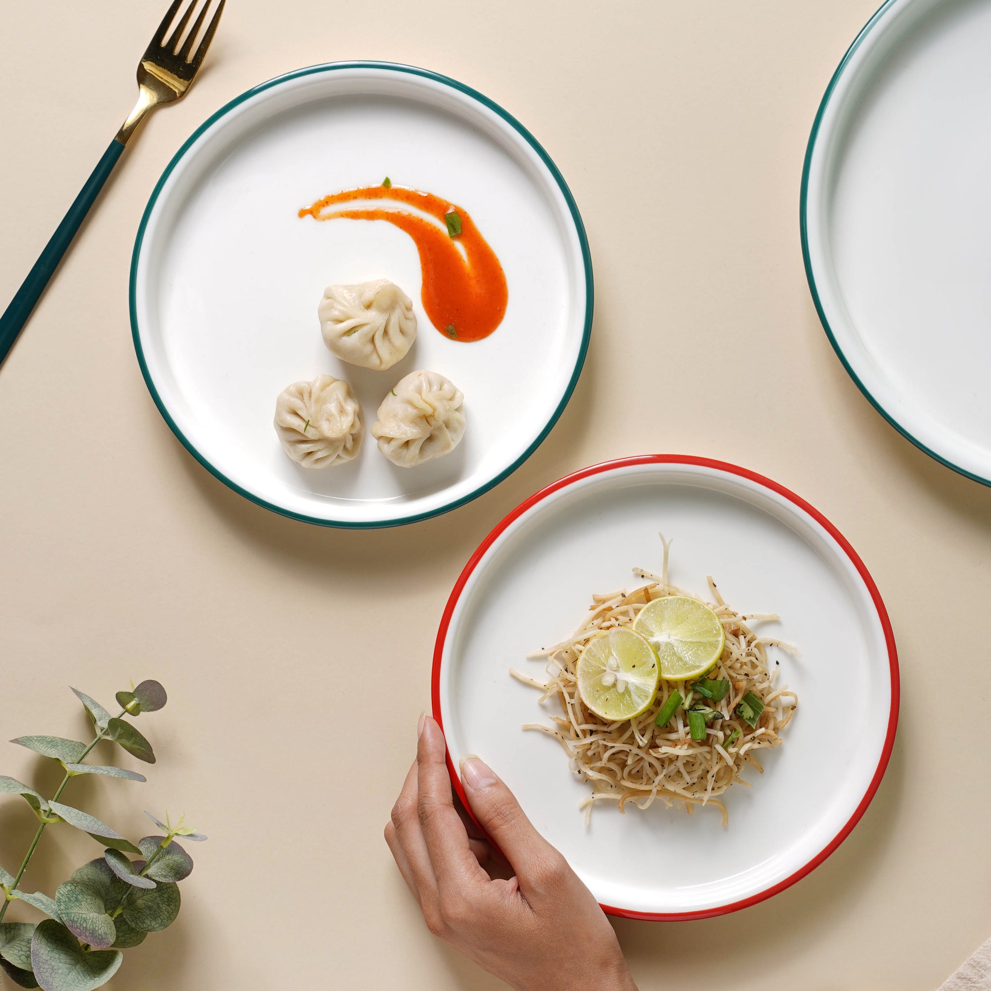 The ceramic plate, with an elevated rim, is ideal for serving appetizers to add opulence to any table setting. The white plate is perfect for bringing practicality to the dinner table, with two simple and stylish color choices on the rim of the plate.