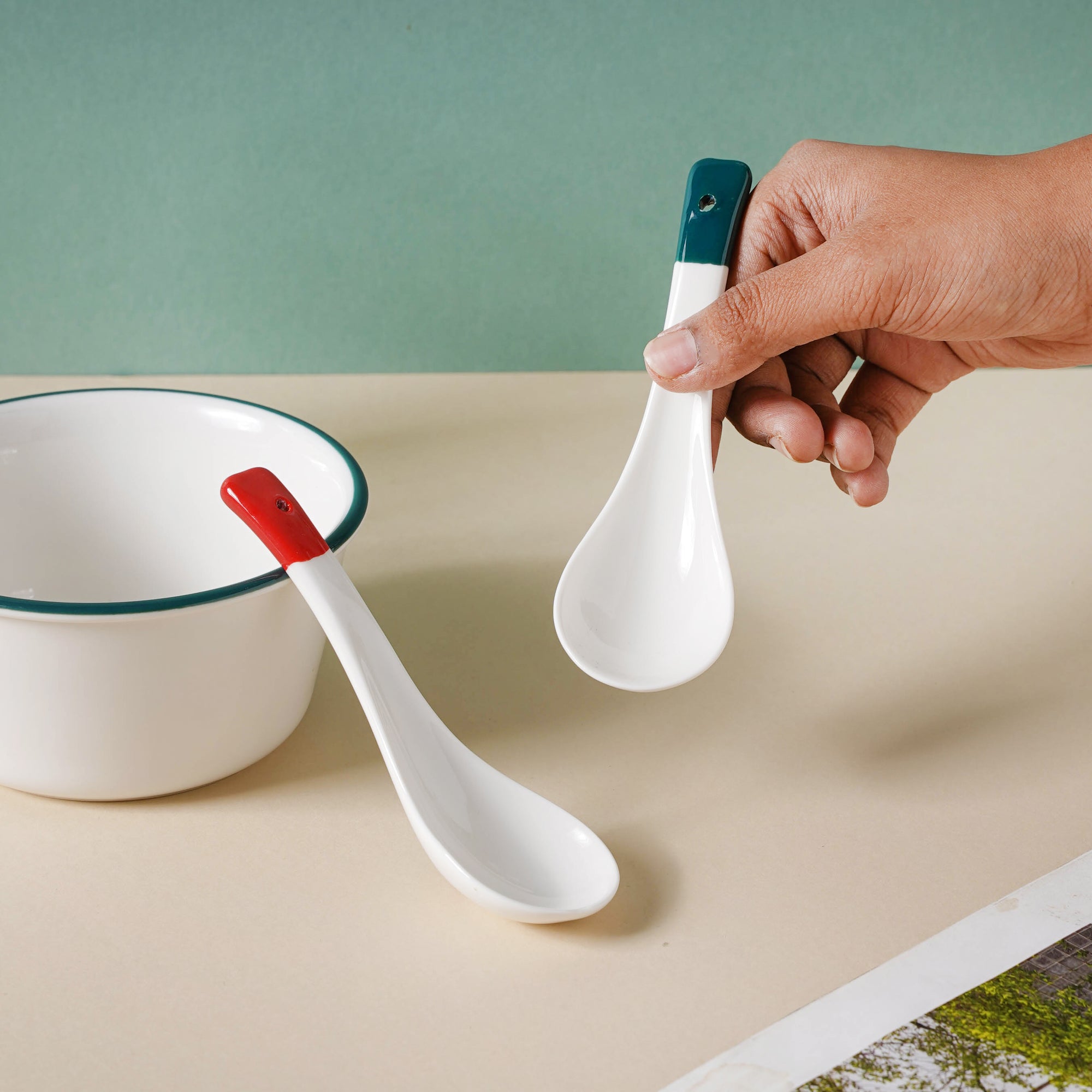 White soup spoon with a pop of color at the rear end of the spoon is perfect for adding some fun to the table while keeping it elegant. Serve hot soup to family or guests with the soup spoons and the soup bowl or side bowl from the collection. It can also be used as a spoon for breakfast cereals. The ceramic soup spoon is available in two color variants to choose from. A soup spoon and bowl set can be created for gifting friends and family.
