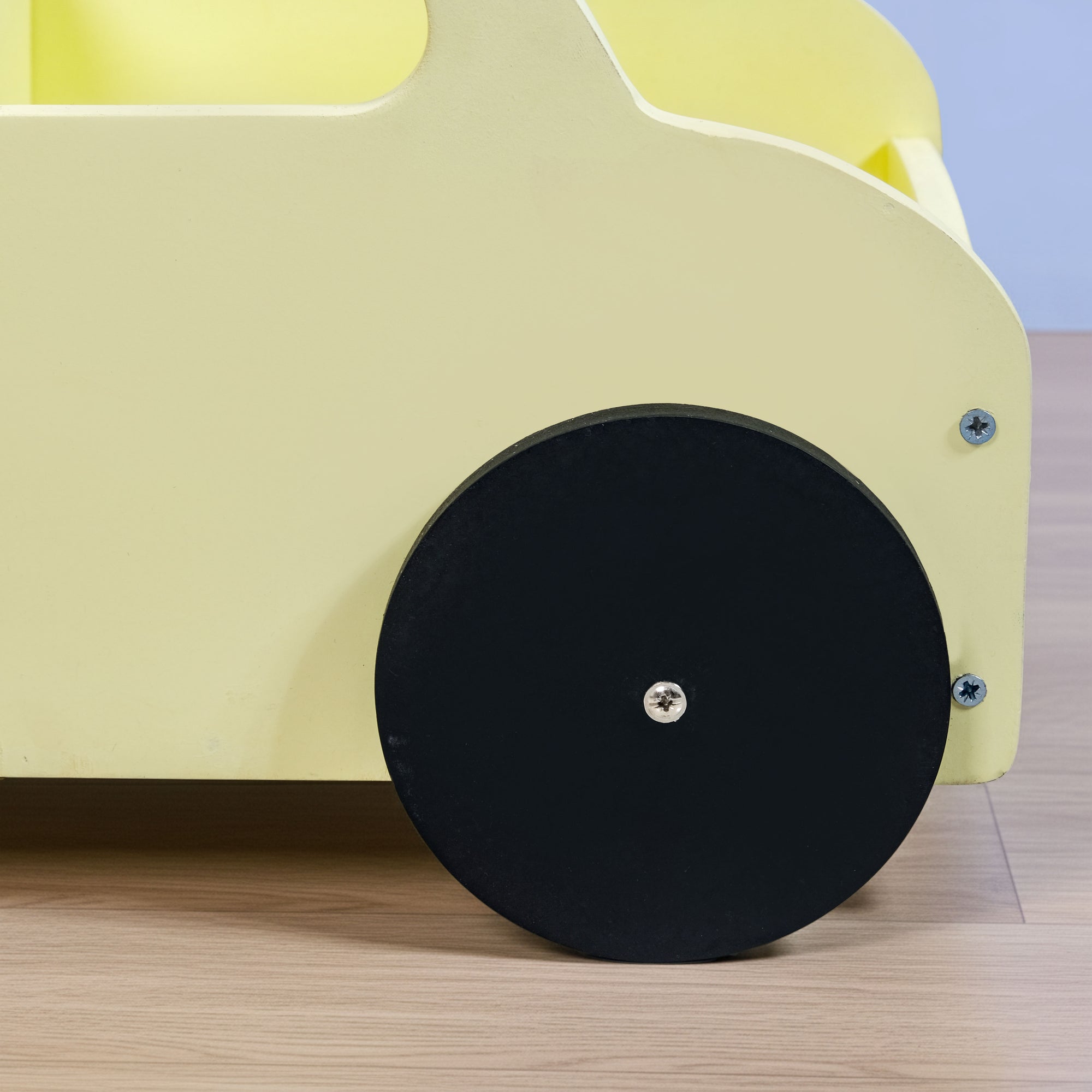 Design: Made from durable MDF, this toy storage cart features a bright yellow body, black wheels, and a sturdy handle. It comes with smooth edges and is finished with non-toxic, lead-free paint.