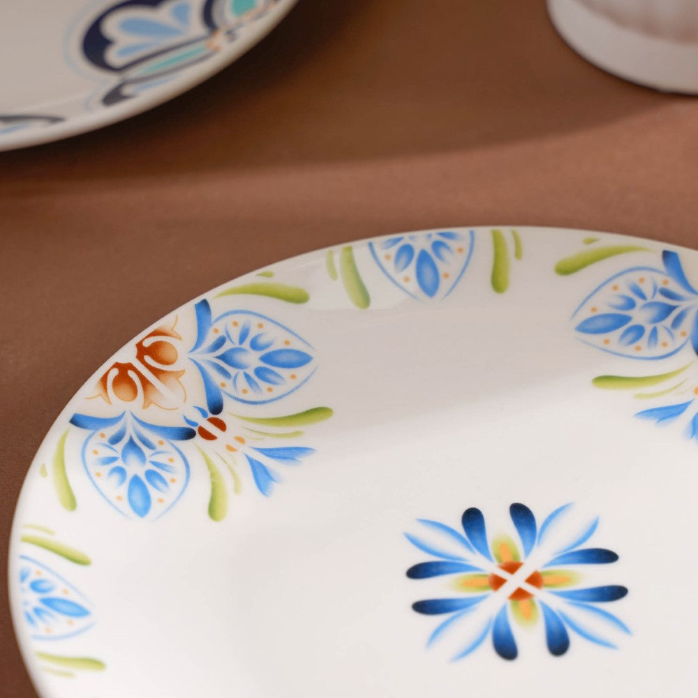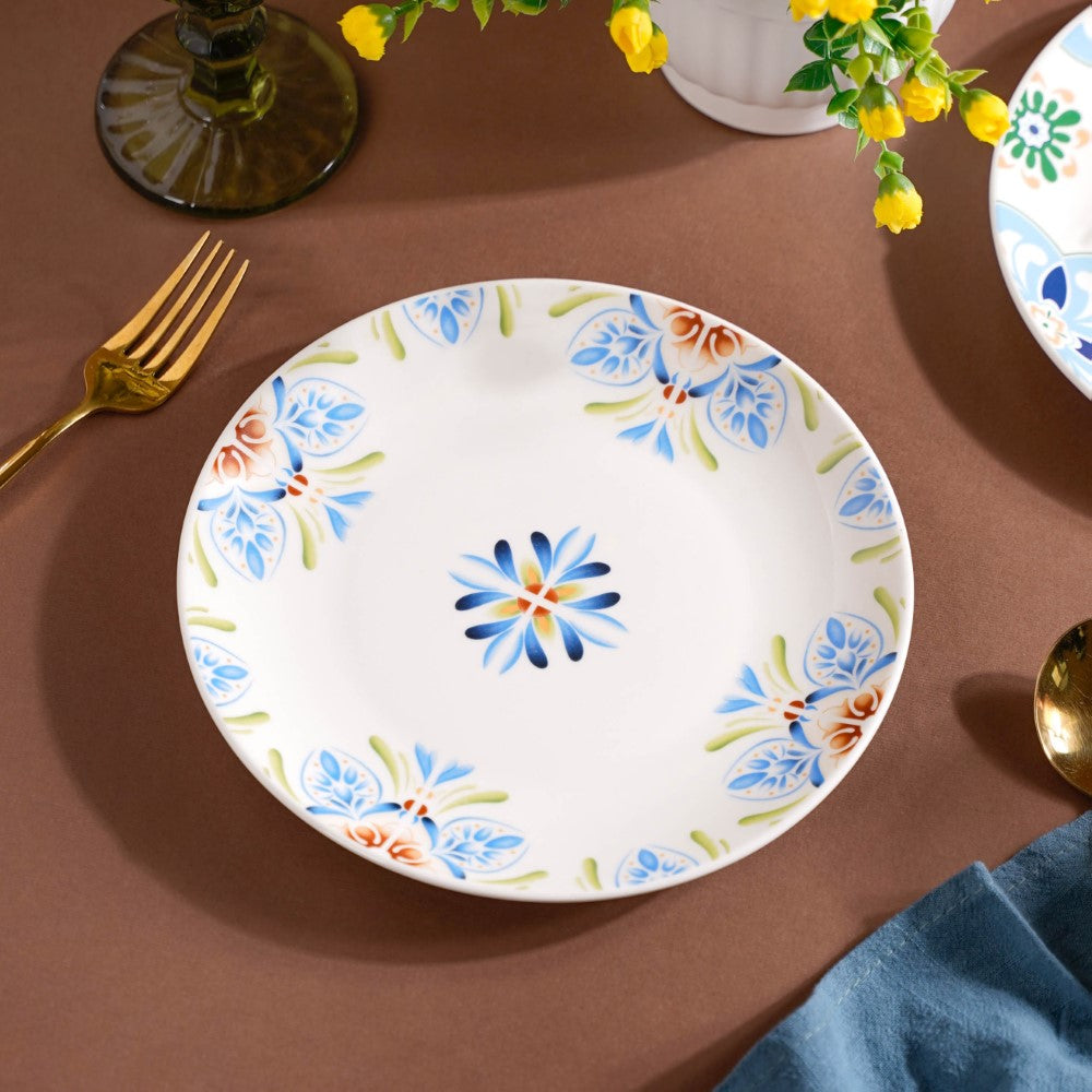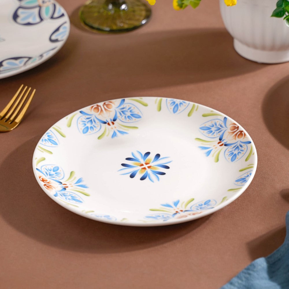 The ceramic snack plate graces the table with a subtle beauty. The white plate has a classic, traditional charm thanks to the floral motifs on it, which also make it look pleasant and eye-catching. Any food item that is on the plate is elevated by the delicate floral designs. The plate is ideal for serving snacks and appetizers.Nestip: The platters can be used as wall plates for a stunning decor setup.Size: 20.5cm DMaterial: CeramicColour: White, blue, green, yellow and brownProducts Included: 1 plateStyle: HLU37