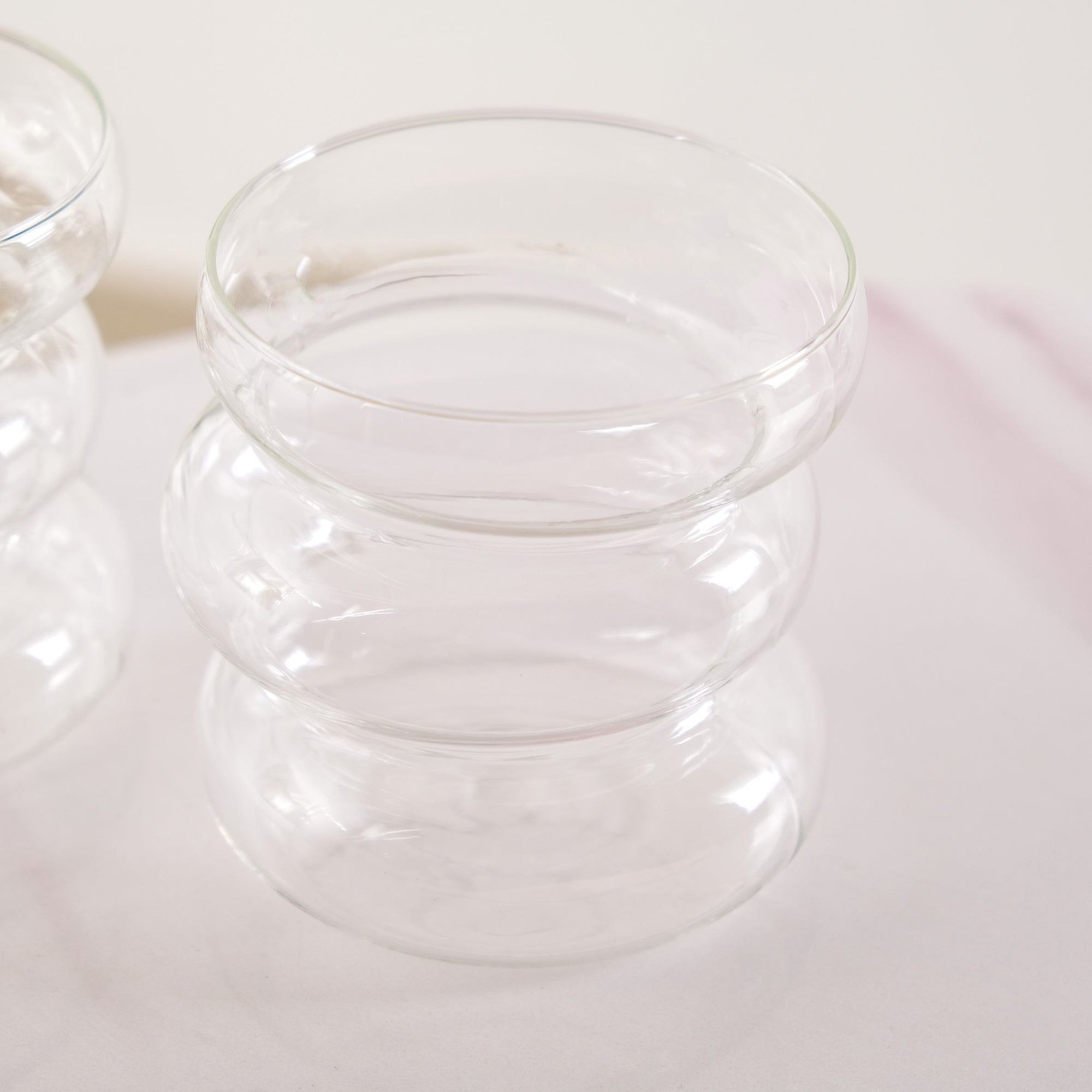 Description: This aesthetic coffee glass set has circles carved from the inside in three different layers. The outer design of the glass creates a doughnut-like silhouette. The top and the bottom layers of the glasses are in alignment, whereas the middle is slightly bulged. Each layer flows seamlessly into the next, creating a sculptural form that's as comforting to hold as it is beautiful to look at.