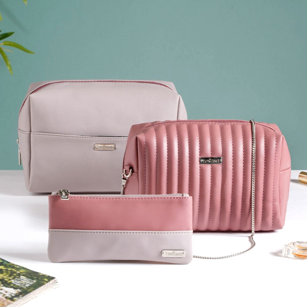 Stylish and practical, our vegan leather travel pouches are the perfect companions for any journey. Made from high-quality materials and available in three sizes, these grey and pink pouches can accommodate all of your travel needs. Their unisex design makes them suitable for both men and women and their versatile compartments will help you to keep your belongings organized. Whether you're heading to work or going on a trip, these travel pouches will make your trip more enjoyable.