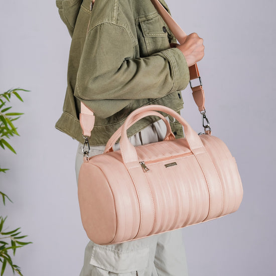 Our small pink duffel bag is a go-to choice for a traveller seeking versatility, usability, and style. Whether you're going on a quick weekend getaway or to the gym, the duffle bag will be your reliable travel partner. The duffel bag has a small front pocket for charging cables, headphones, power banks, and other small items, while the spacious primary compartment is ideal for packing clothing and other travel essentials. Because the material doesn't tarnish easily, it retains its durability for a longer time.