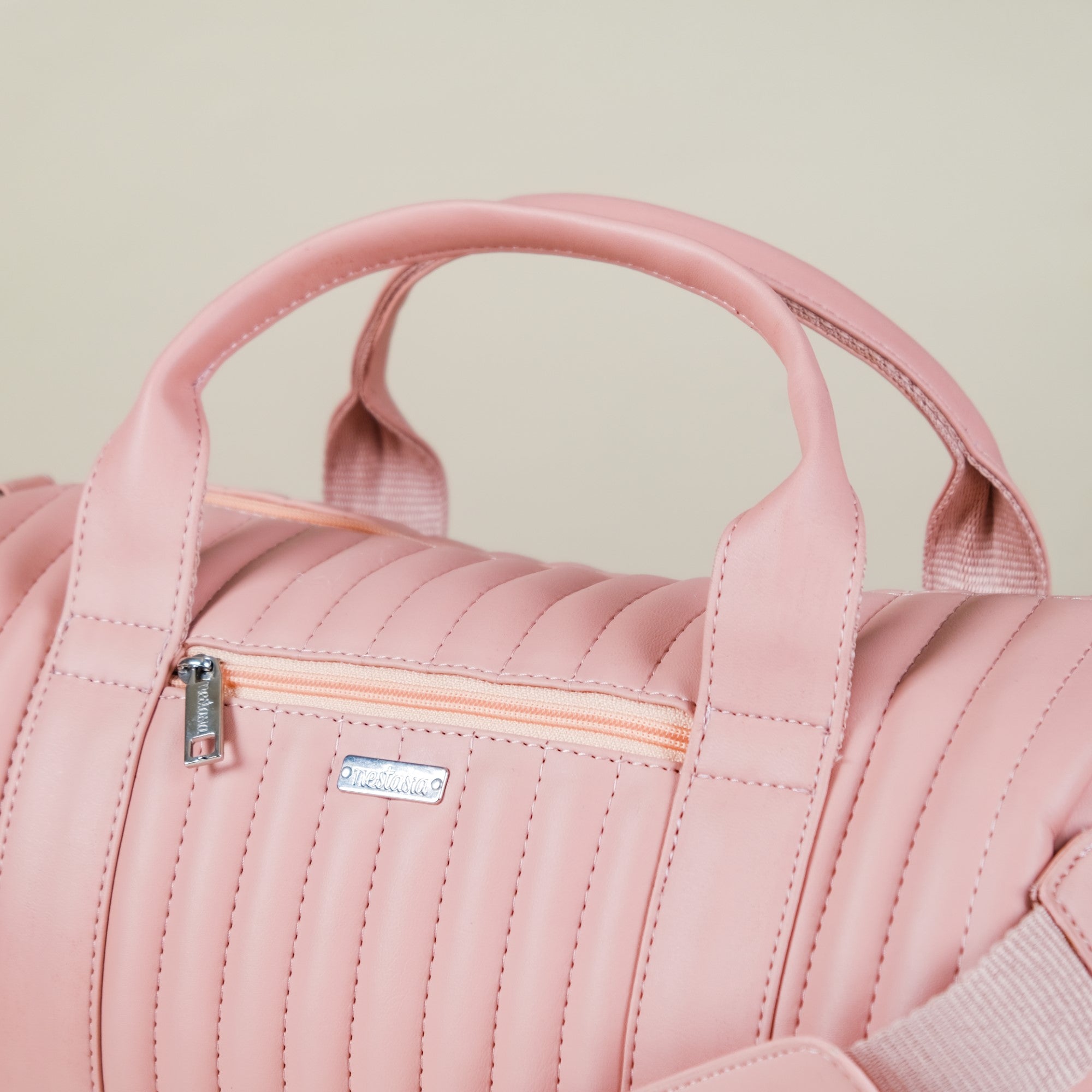 Our small pink duffel bag is a go-to choice for a traveller seeking versatility, usability, and style. Whether you're going on a quick weekend getaway or to the gym, the duffle bag will be your reliable travel partner. The duffel bag has a small front pocket for charging cables, headphones, power banks, and other small items, while the spacious primary compartment is ideal for packing clothing and other travel essentials. Because the material doesn't tarnish easily, it retains its durability for a longer time.