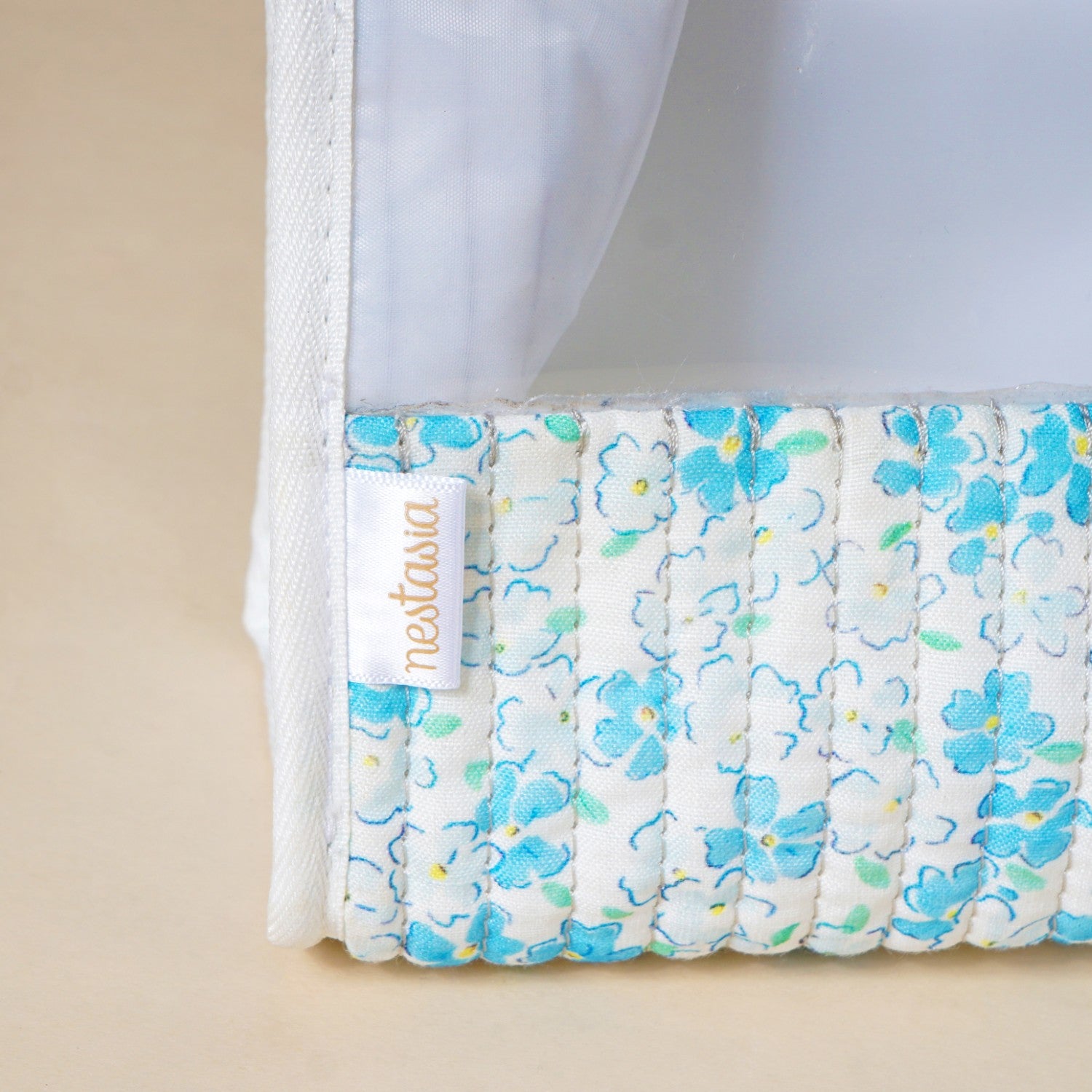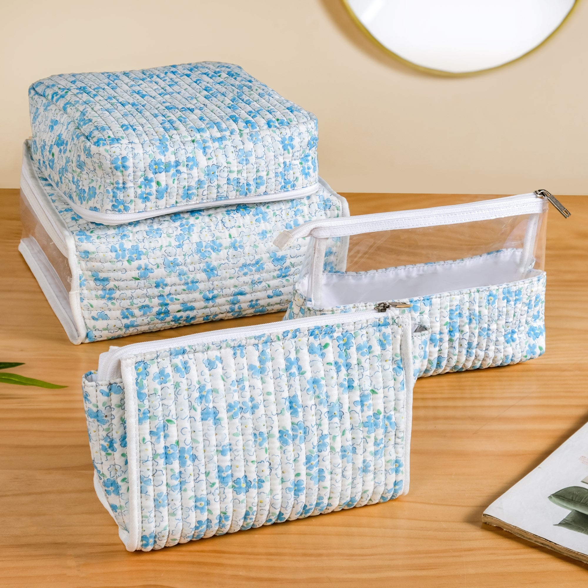 Design: This travel organiser set of four features a charming quilted floral fabric exterior with matching floral patterns for a cohesive look. Each piece is fitted with transparent PVC panels and sturdy white zippers, making it easy to view and access contents. The soft, padded structure adds gentle protection to belongings, while reinforced stitching edges promise durability. Crafted from lightweight material, the set includes both square and rectangular shapes for flexible storage.
