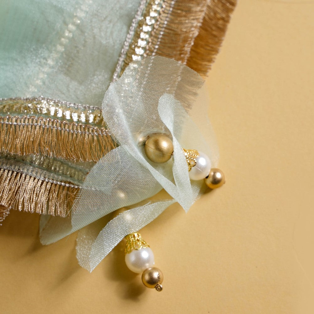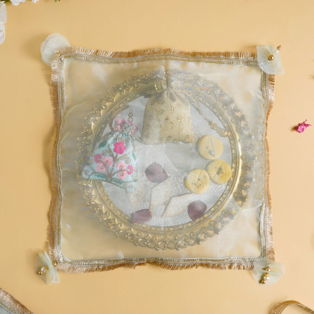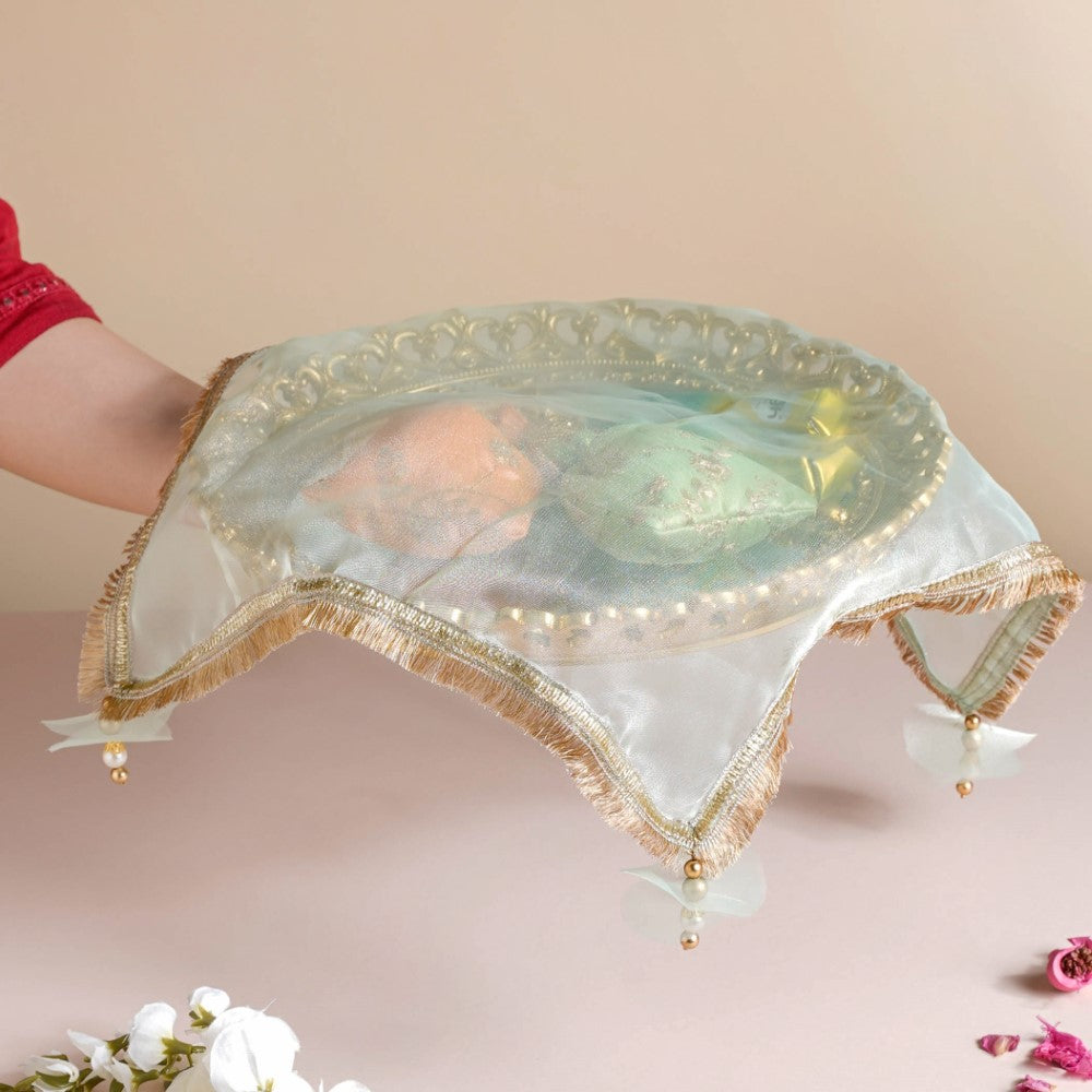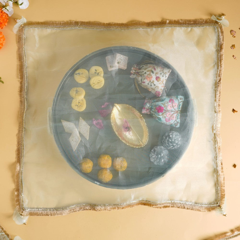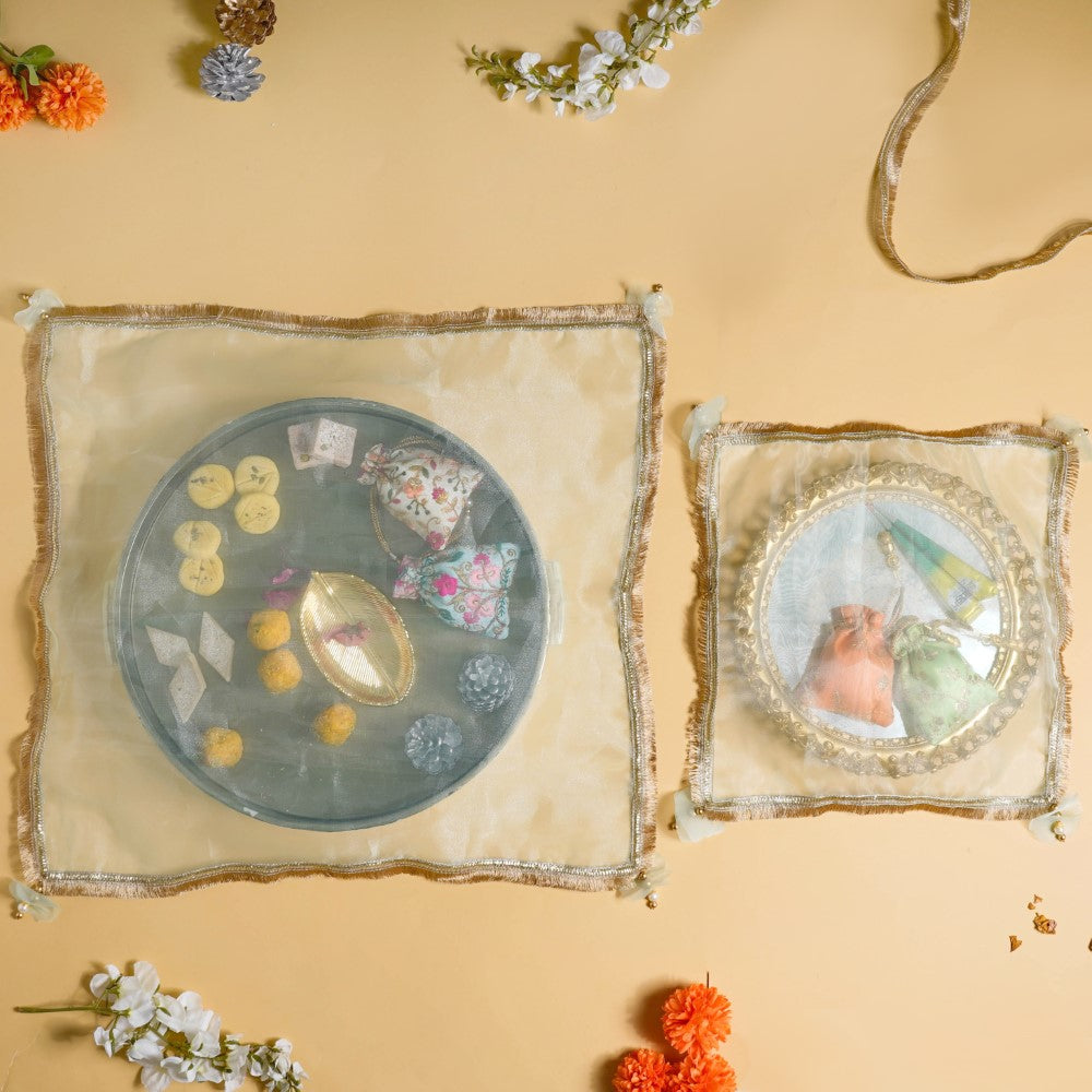 Crafted with utmost care and attention to detail, our tray cover set embodies elegance and functionality. Made from high-quality fabric, it ensures durability and easy maintenance. Each cover is intricately designed with vibrant colours and golden embroidered border designs, adding a touch of authenticity to your thali presentation. The set includes a spacious cover for the main thali plate and an accompanying smaller cover for bowls and spoons, providing a complete ensemble. Elevate your dining rituals and impress your guests with this stunning thali cover set, a true reflection of Indian craftsmanship and culture.