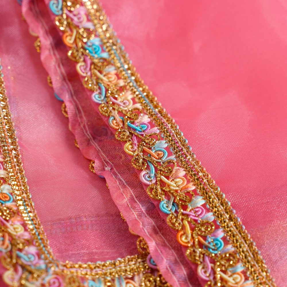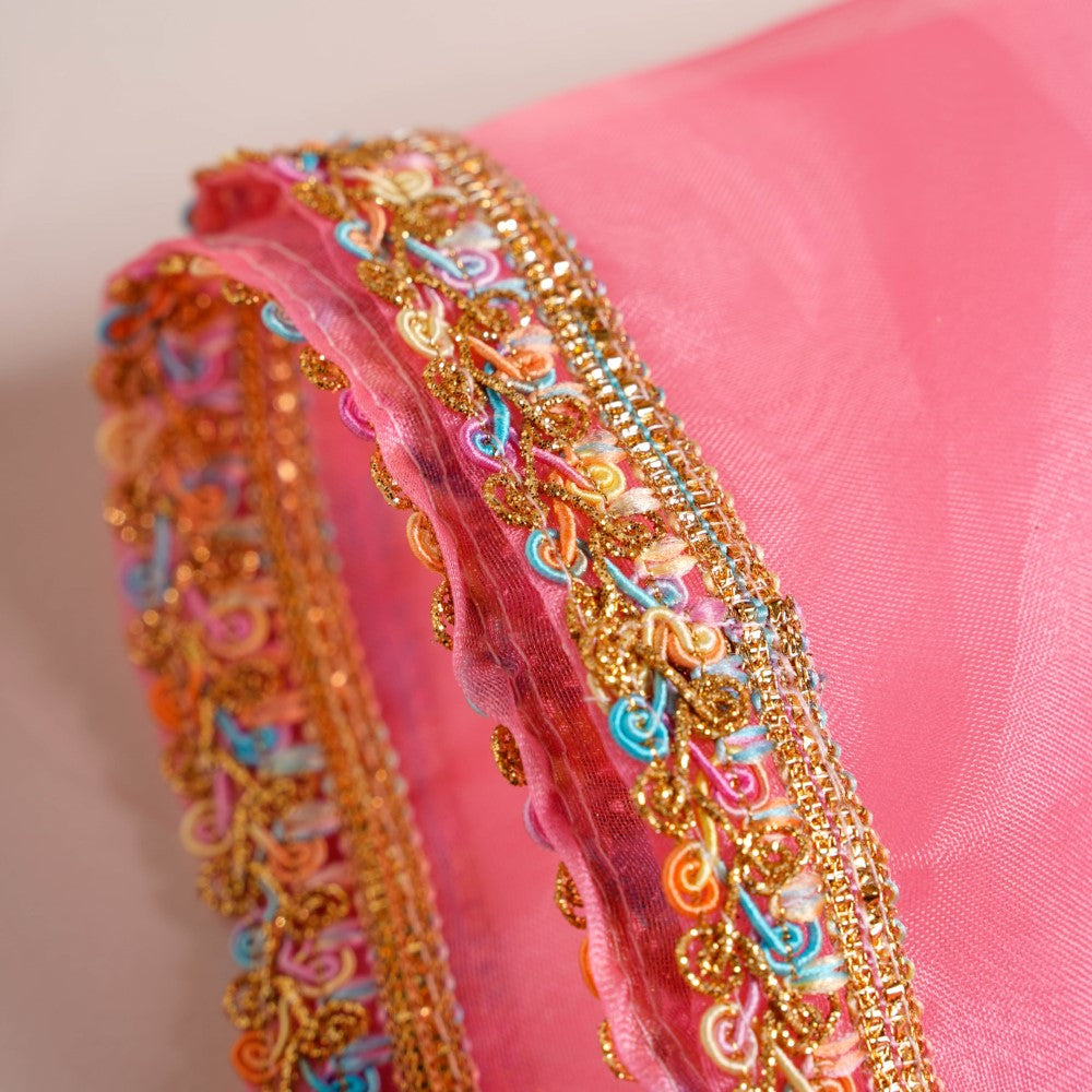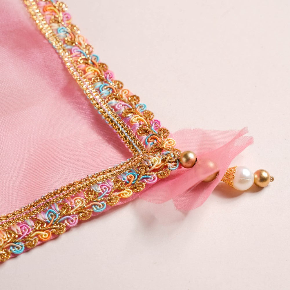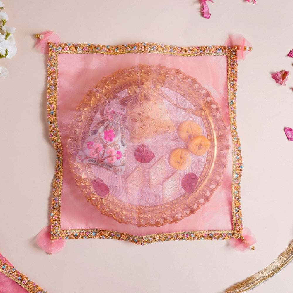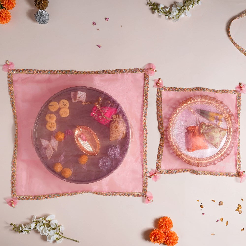 Shagun thalis are an integral part of a traditional Indian wedding and our thali cover set is the perfect way to make shagun thalis more attractive. The shagun thali covers come in a gorgeous pink colour with gold embroidered borders, adding to the festive charm of a wedding. The set includes 1 small and 1 large thali cover and can be used to decorate different shagun thalis.