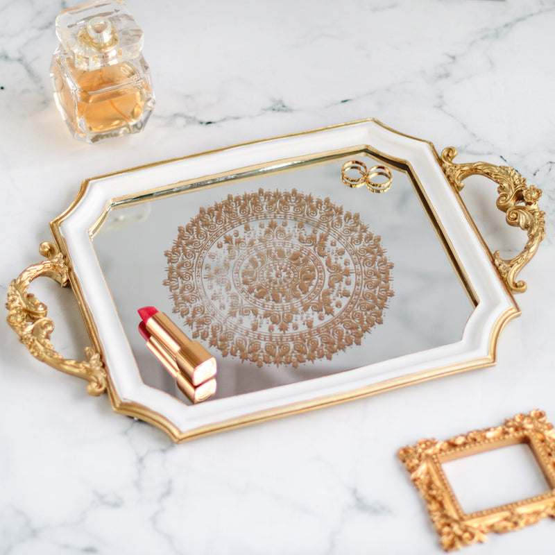 Mirror tray in the classic white and golden colours that is perfect for the dressing table. The decorative tray can be used as a vanity tray, perfume tray or a tray to keep lipsticks, trinkets, brushes and types of makeup products. The mirror plate can jazz up the dressing table and make it look organised.