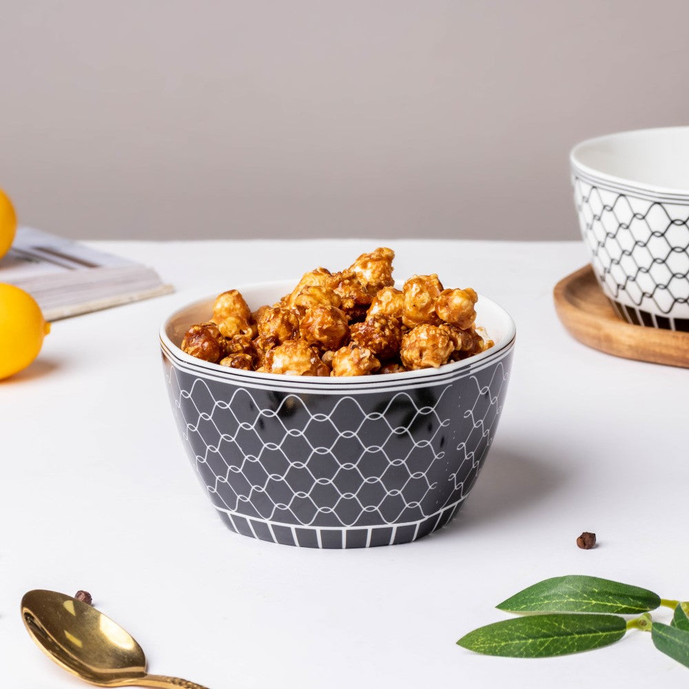 The sleek ceramic bowl is ideal for serving desserts, fruits, or snacks. The black and white colours of the bowl let the superb cuisine take centre stage. The geometrically patterned surface of the ceramic snack bowl makes for a modern addition to the table. The sturdy ceramic construction of the soup bowl makes it chip-resistant and crack-resistant.
