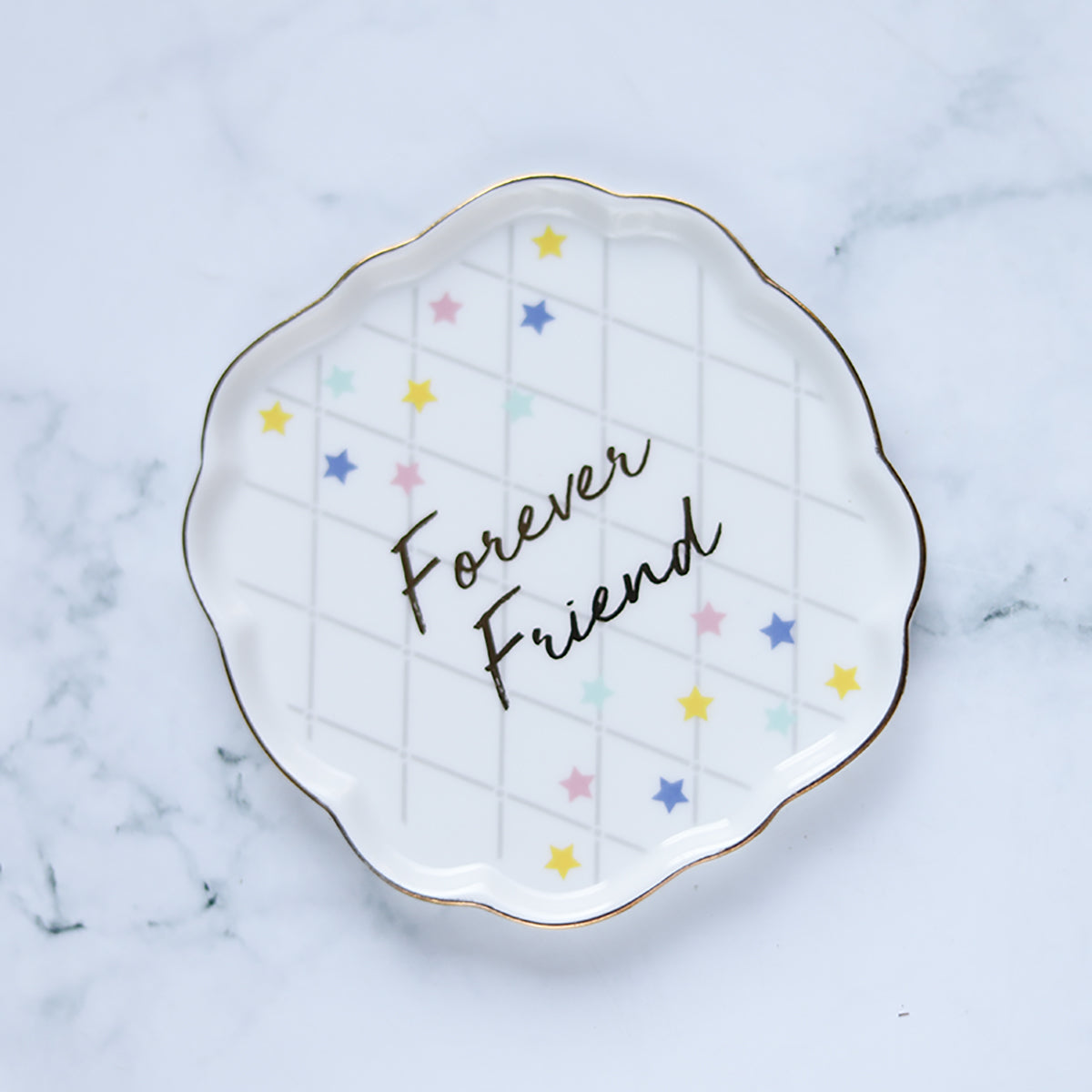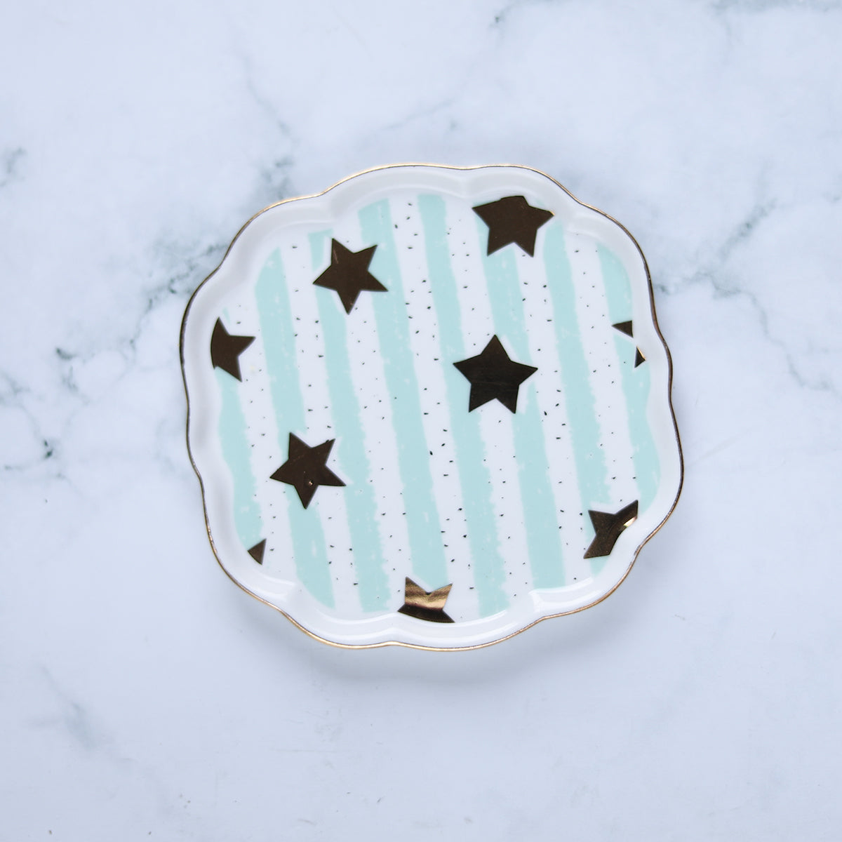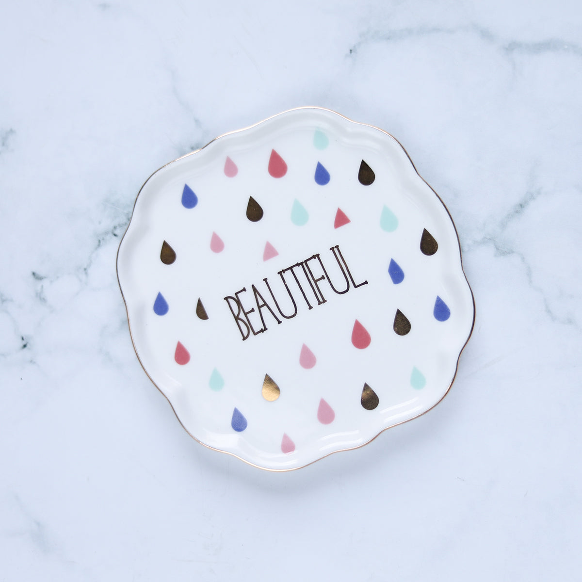 The ceramic printed trinket dish is a versatile piece that can be used for both decorative and functional purposes. It can be placed on a vanity, dresser, shelf, or tabletop to add a touch of style to any room. The dish's printed design adds a touch of personality, while its shallow depth makes it ideal for storing small items such as jewelry, keys, or coins. The dish's functional design also makes it a great way to keep small items organized and easy to find.