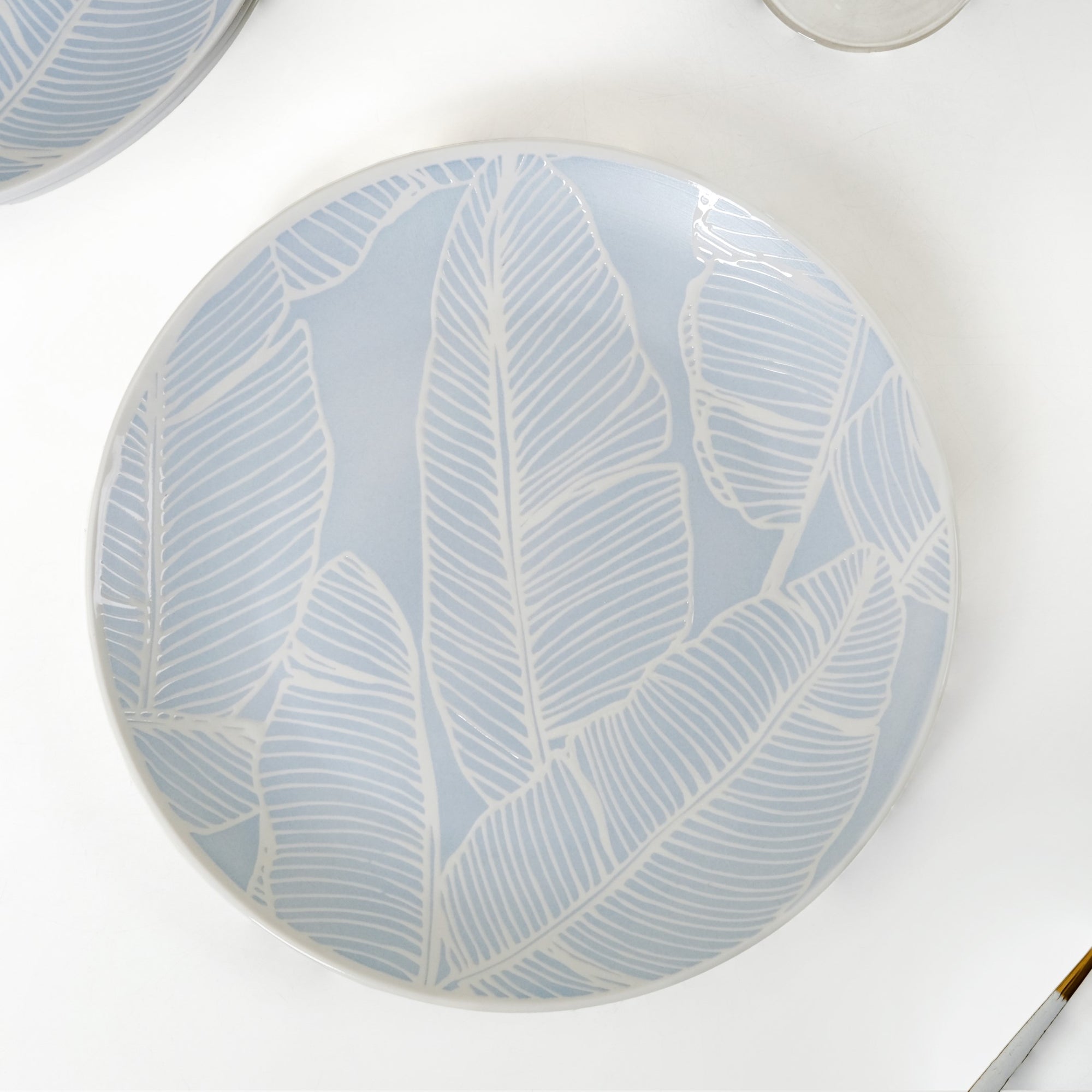 Design: The ceramic plates showcase white banana leaf patterns delicately hand-glazed onto the ceramic, offering a touch of nature's elegance to your table setting. With a matte finish base in a soothing baby blue hue, each plate brings a calm and refined look, complemented by glossy designs that stand out beautifully.