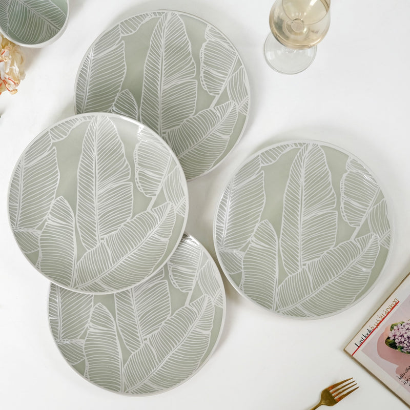 Design: The Tropica dinner plates feature a hand-glazed textured surface, showcasing delicate white banana leaf patterns. The soft mint green hue on the matte finish base contrasts beautifully with the glossy designs, adding a modern touch to your table setting.