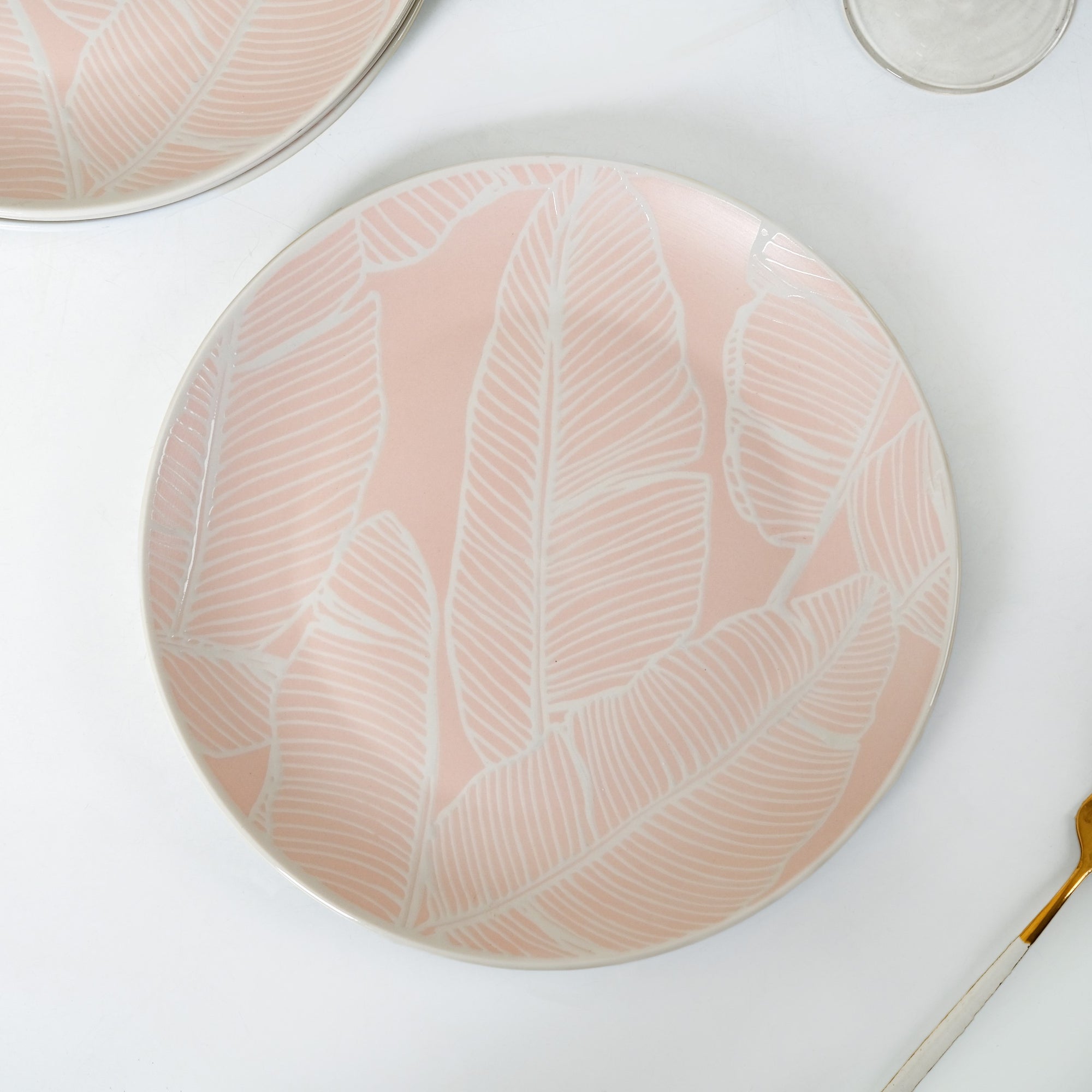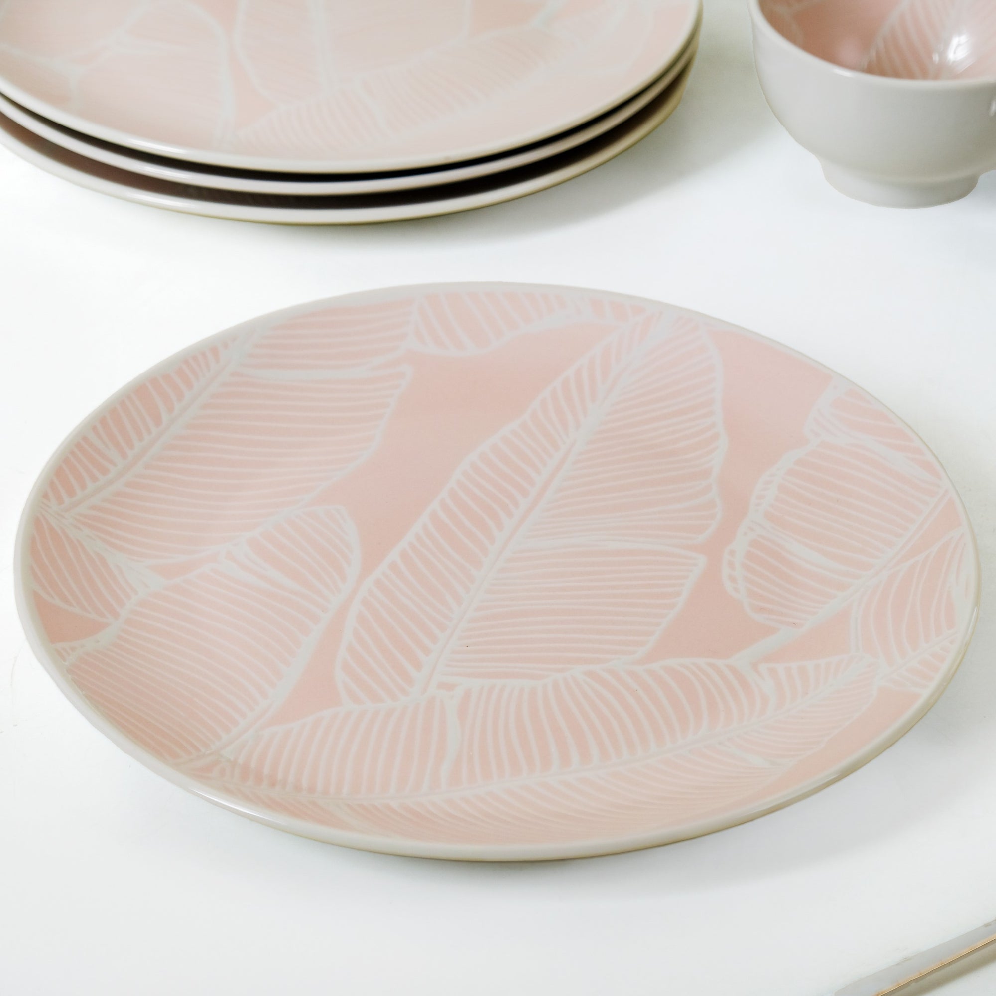 Design: Named after the tropical patterns that adorn each plate, the Tropica ceramic plates feature hand-glazed textured surfaces with intricate white banana leaf designs. These patterns evoke the serene beauty of tropical foliage, while the matte finish base in a soft pastel pink hue provides a subtle, yet striking contrast to the glossy designs. The overall look creates a fresh, modern feel that effortlessly complements any dining setting.