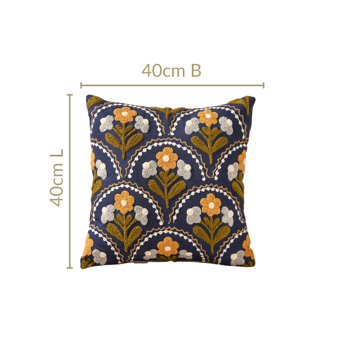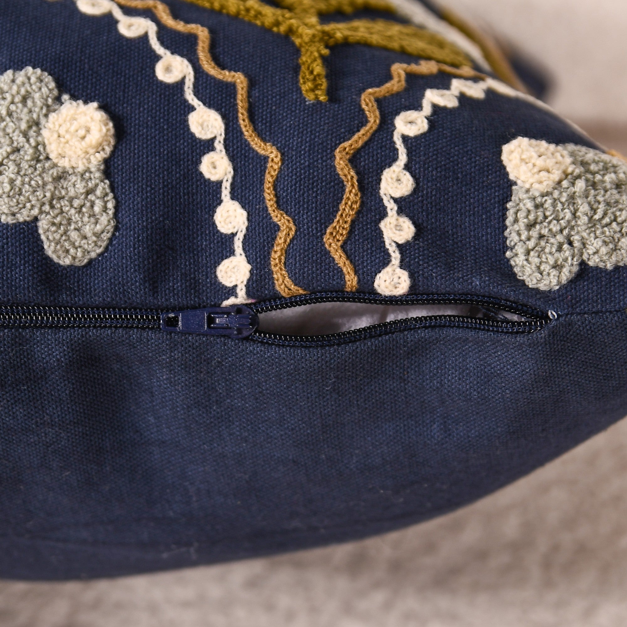 Design: Flowering plant designs of the pillow cover, stitched in muted earthy tones of ochre, olive green, grey, and white, evoke a sense of nature and tranquillity. Textured tufted embroidery on the leaves and flowers enhances the design, while Art Deco-inspired embroidered arches introduce a vintage yet contemporary charm.