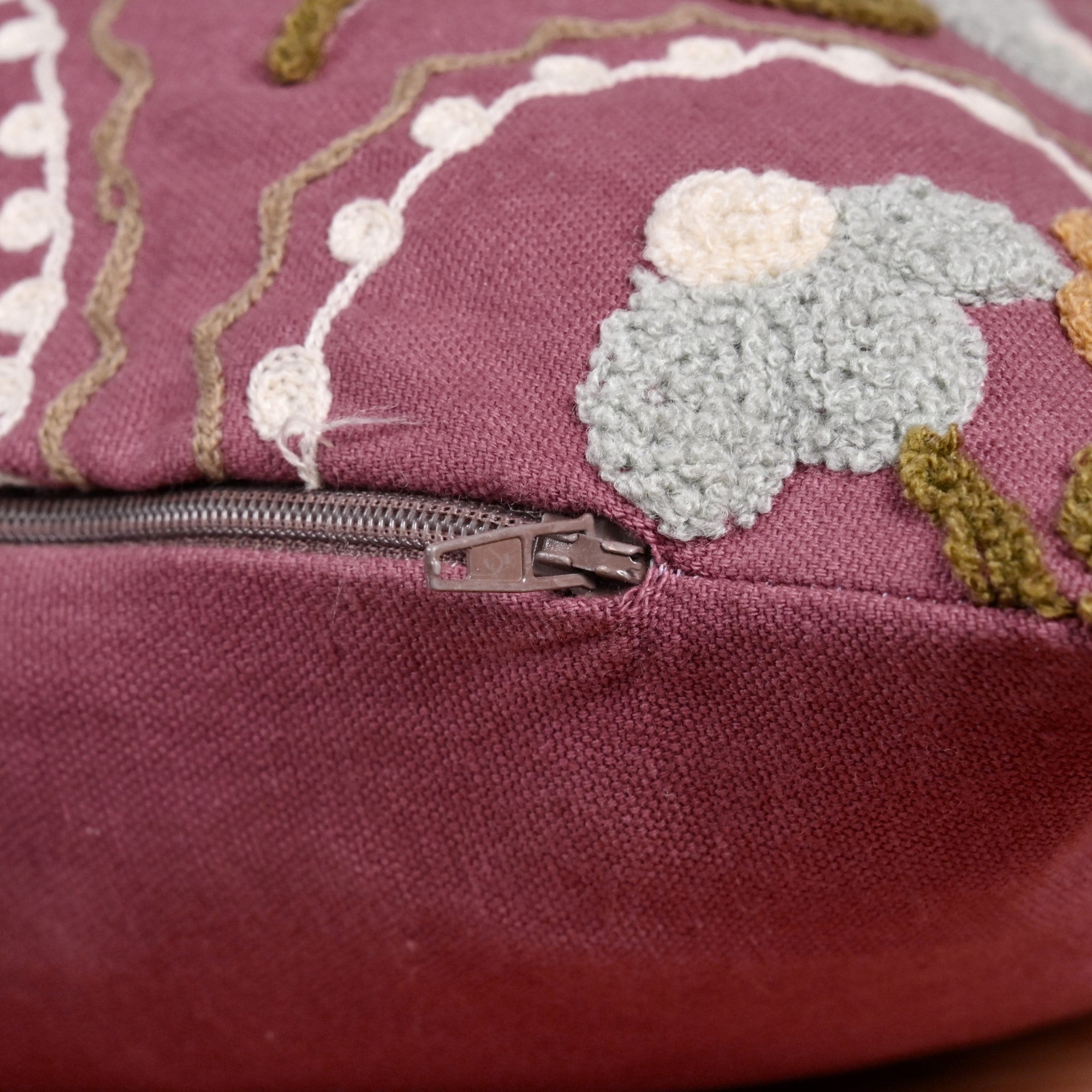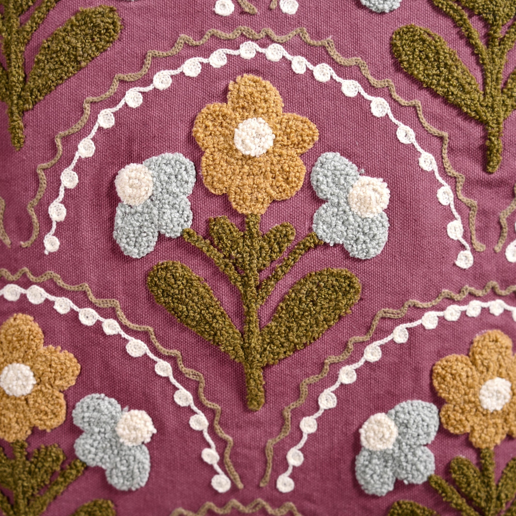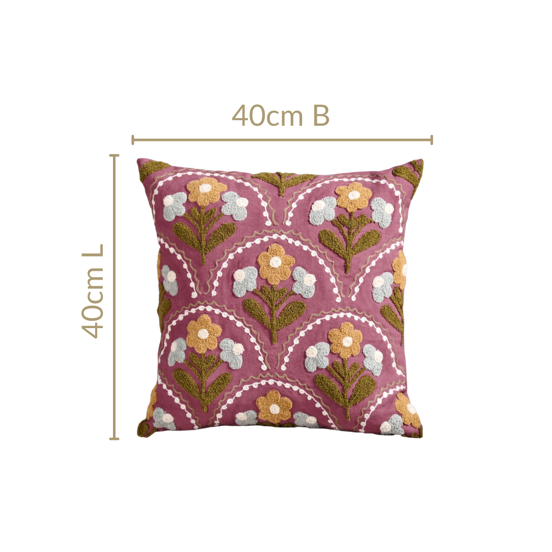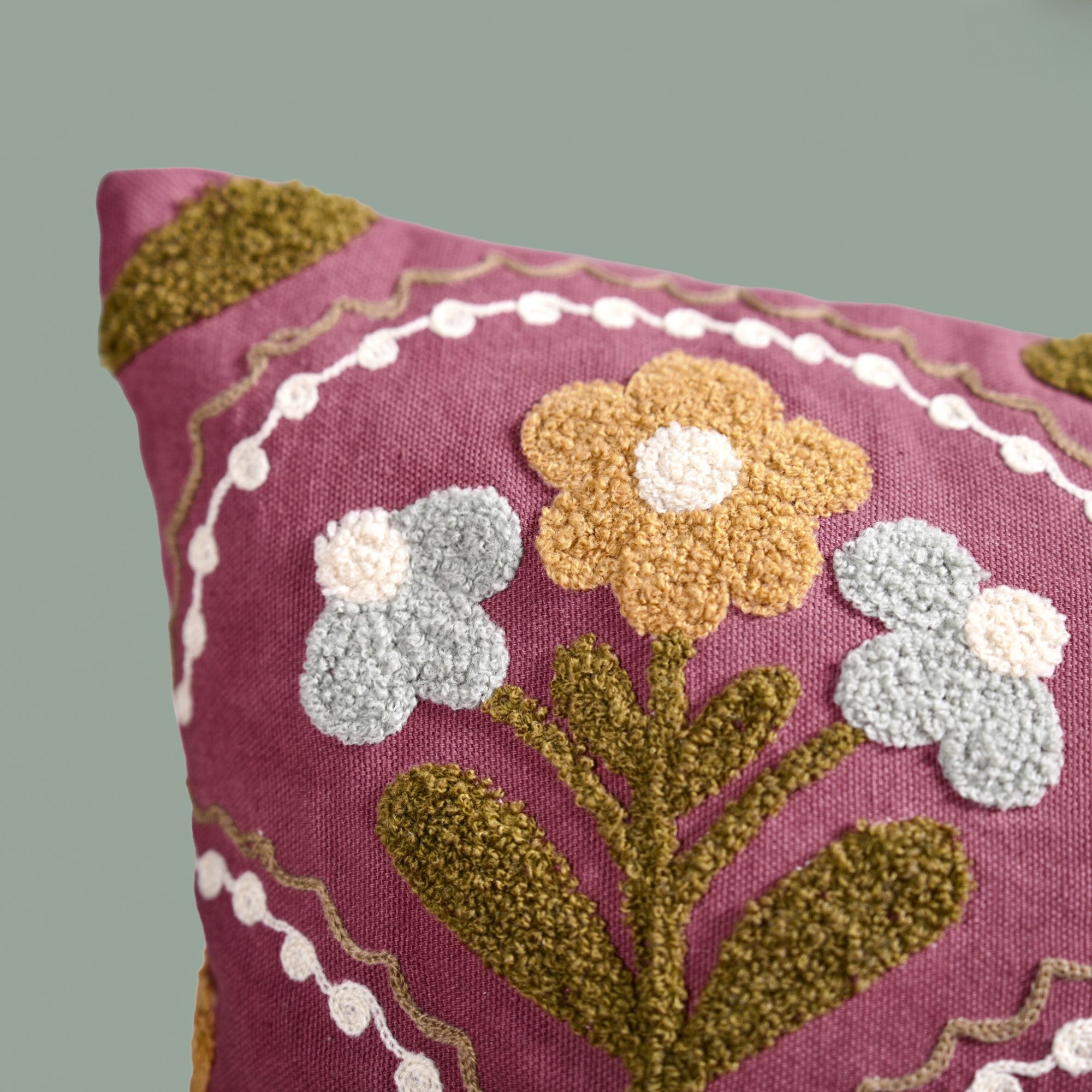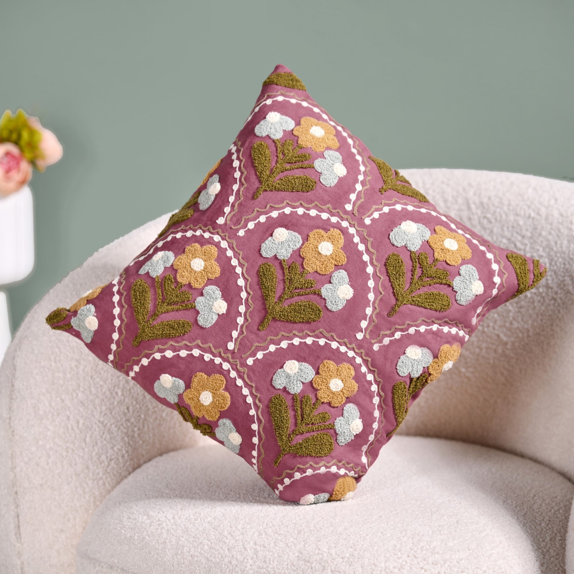 Design: Featuring machine-embroidered flowering plant designs in muted earthy hues, the couch cushion cover boasts tufted embroidery that creates a textured, inviting look. Art Deco-inspired arched designs enhance its appeal, while the leaves and flowers bring a soft, natural charm to the piece.