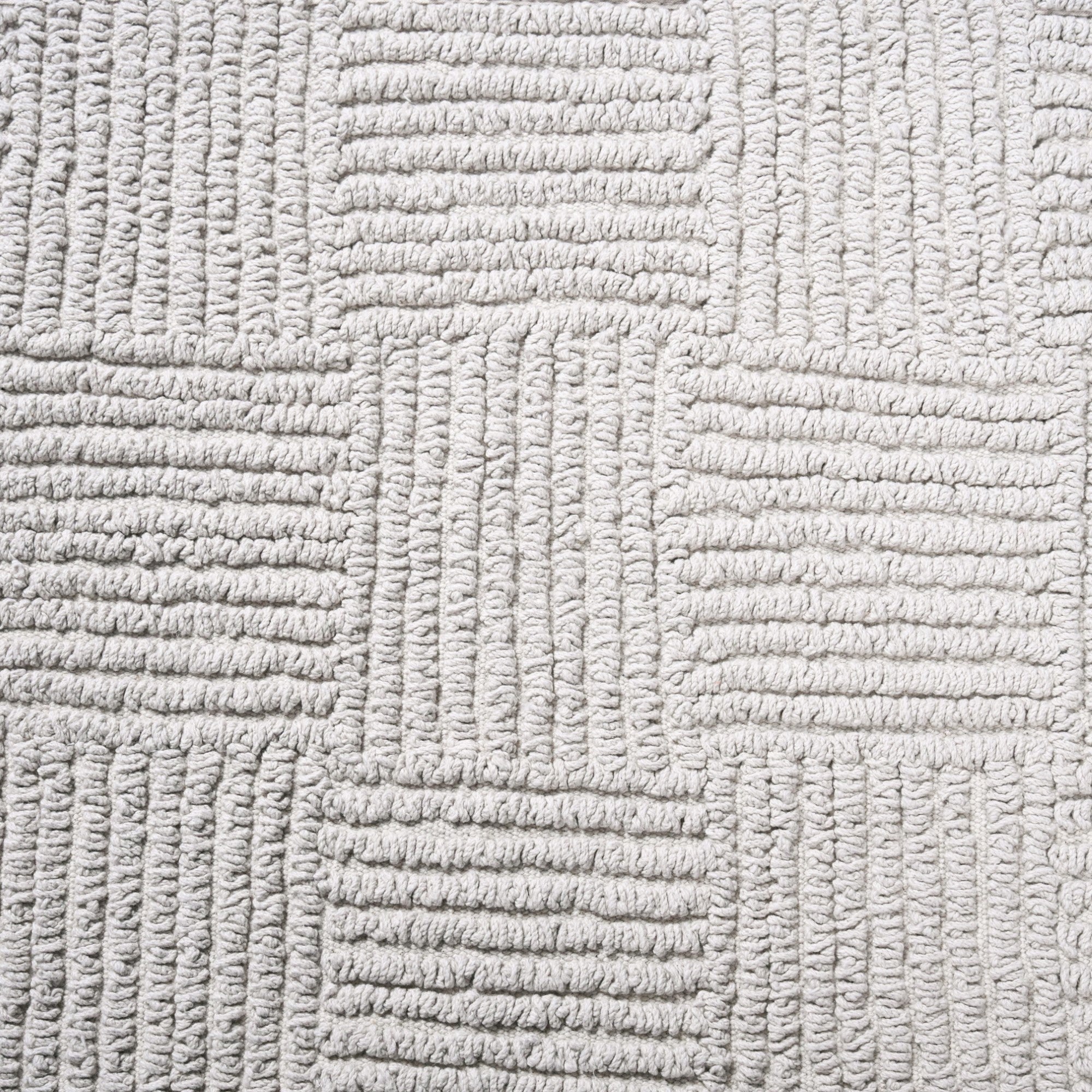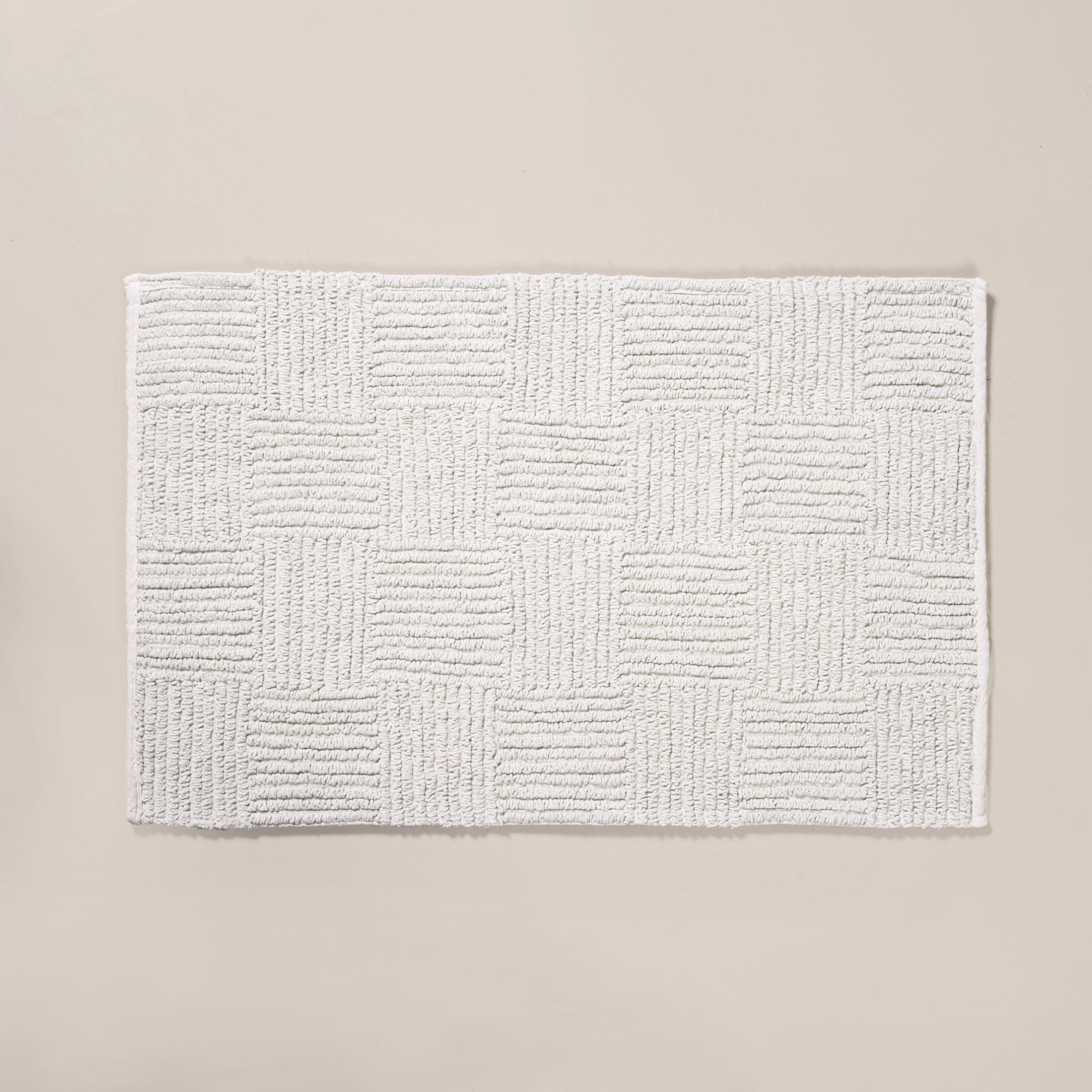 Design: This mat features an intriguing basketweave-inspired pattern, where sections of plump, tightly woven loops create alternating horizontal and vertical ridges. This intricate texture forms a visually captivating grid, lending a rich, three-dimensional quality to its surface. The gentle light grey hue offers a serene and adaptable foundation, making it a perfect complement to both vibrant and muted colour palettes. Its plush cotton construction ensures a delightful sensory experience underfoot, enhancing the inviting atmosphere of any room.