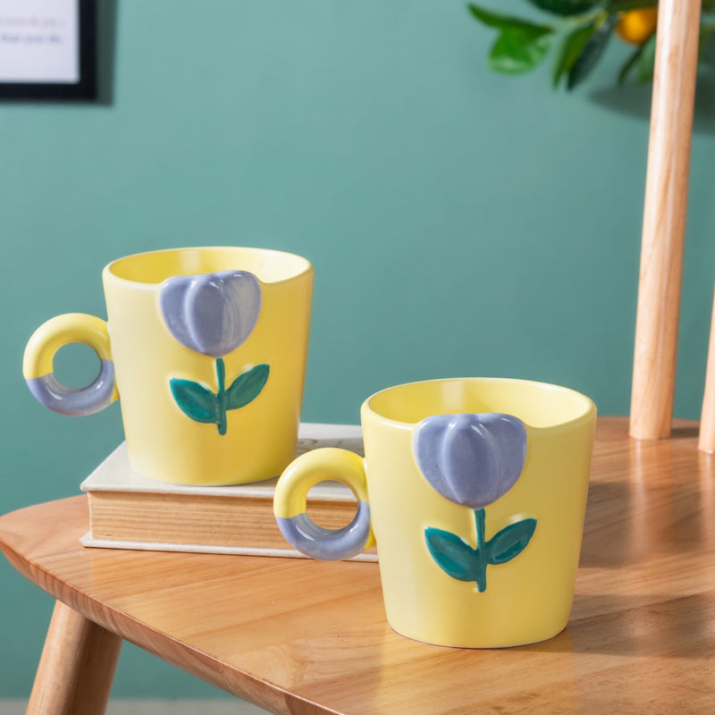 The yellow ceramic coffee mug set is adorned with a captivating single purple flower design and delicate green leaves etched on its side. This stunning ceramic mug set is a testament to both elegance and functionality, perfect for elevating your home decor. The dual-coloured handle design, featuring a delightful combination of yellow and purple, adds a touch of vibrancy to your morning routine. Crafted from high-quality ceramic, this versatile mug set is ideal for enjoying your favourite beverages. You can even use it as a travel mug while on the go. Embrace the beauty of this ceramic masterpiece and indulge in moments of blissful relaxation.