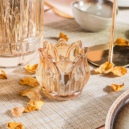 The tulip-shaped glass tea light holder can be an elegant and sophisticated centerpiece for special occasions. The warm amber color of the candle holder can add a touch of warmth and coziness to any gathering. When combined with other decor elements, such as flowers, fruit, or greenery, tulip-shaped tea light holder can create a truly beautiful and festive atmosphere.