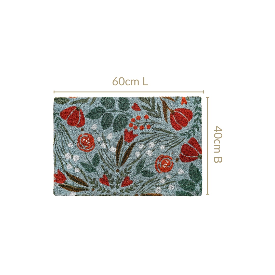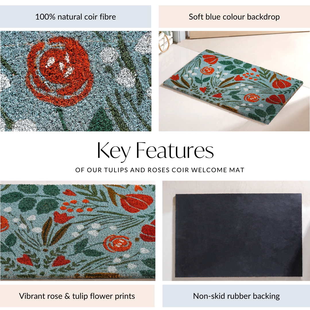 Design: The floor mat features a stunning arrangement of rose and tulip flower prints in rich earthy hues of brown, beige, red, green, and orange, set against a calming soft blue background. This vibrant design brings a pop of colour and elegance to your doorstep while complementing a range of home styles.