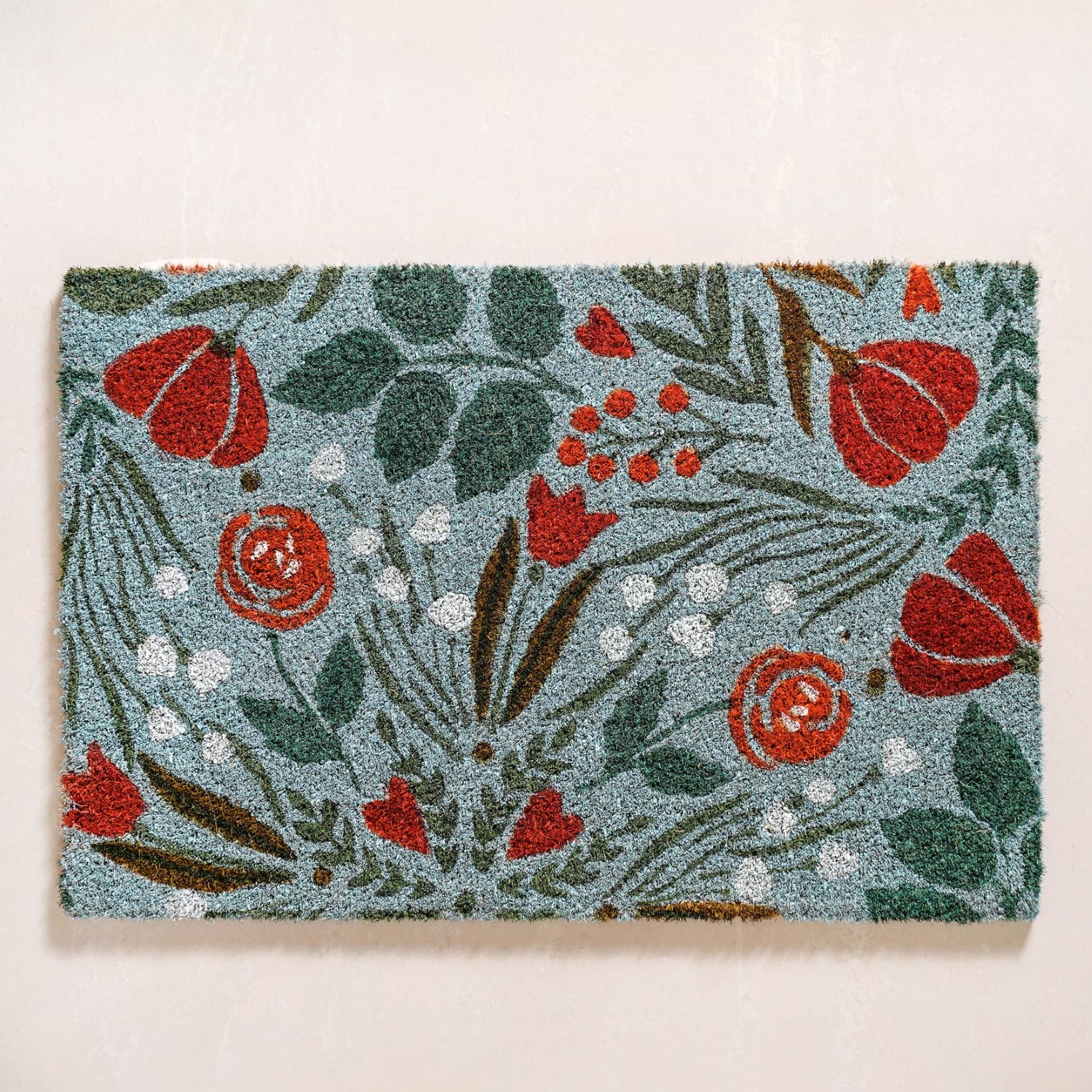 Add a touch of natural charm to your entryway with the beautifully designed natural coir doormat. Its vibrant floral prints and soft blue backdrop make it an inviting feature for any home.