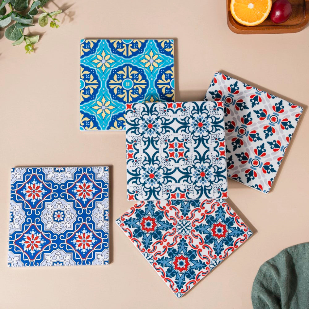 The traditional Moroccan tile pattern and Persian style art are well-known throughout the world. They can be called the “world’s eighth wonder” for their intricacy, vibrant hues, and harmonious blend of mandalas. Our collection of ceramic coaster/trivet is a gateway to incorporate this eighth wonder into your living room, dining table or as a beautiful decor piece. While the trivets are the quintessential companion of your ceramic, earthen, copper, clay, glass pots, hotpots, pans, bowls and plates, other cookware, the coasters can be the new best friends of serveware, wine glasses, cocktail glasses, and glass coffee mugs or cups.