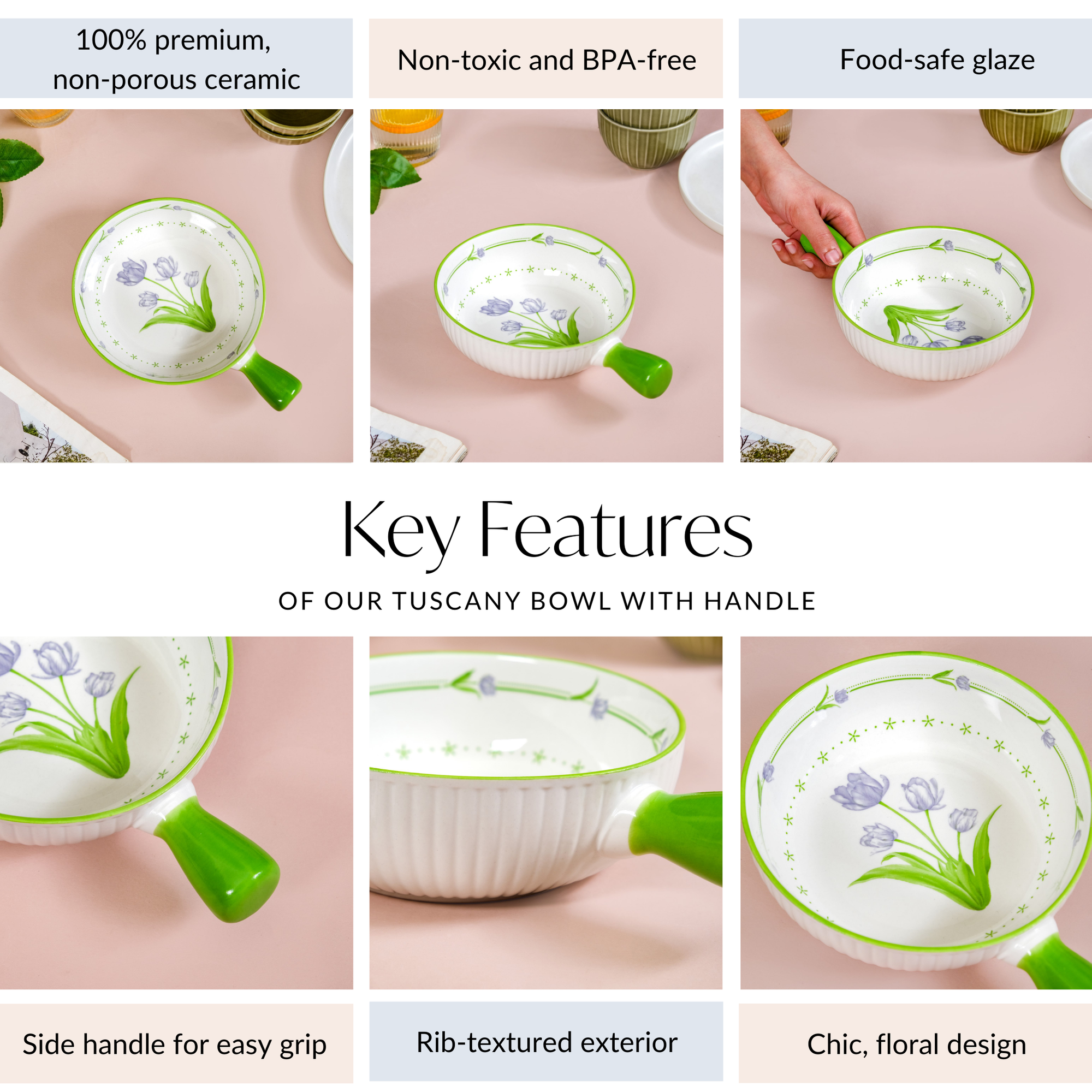 Design: Inspired by the luscious tulip fields of Tuscany, this ceramic bowl features a delicately graceful tulip motif in a soft lavender hue complemented by vibrant green accents. The rib-textured exterior provides a secure grip, while the handle offers added convenience for effortless serving.