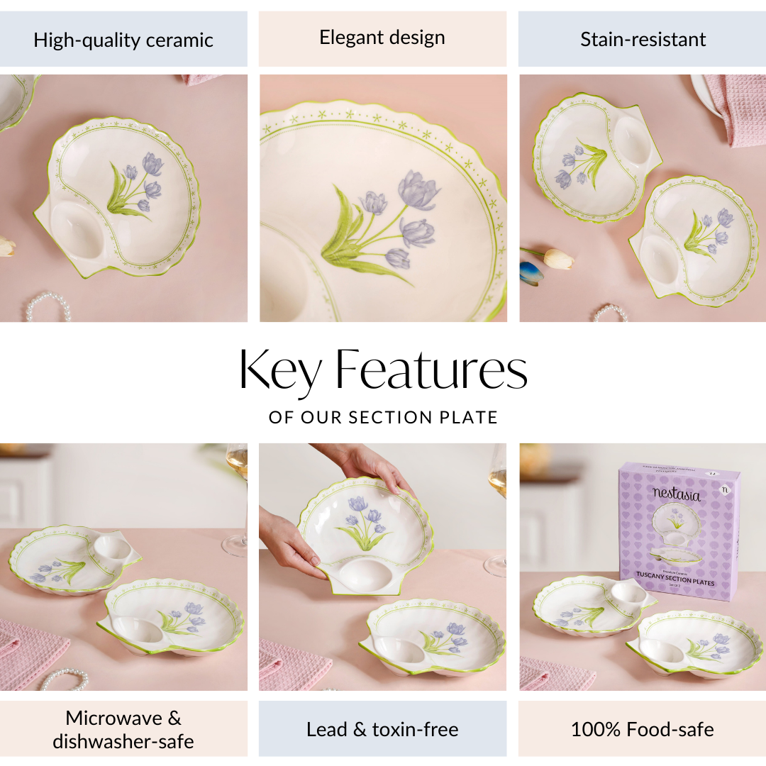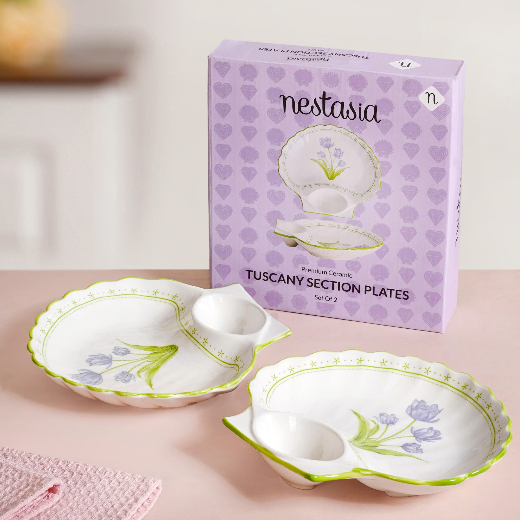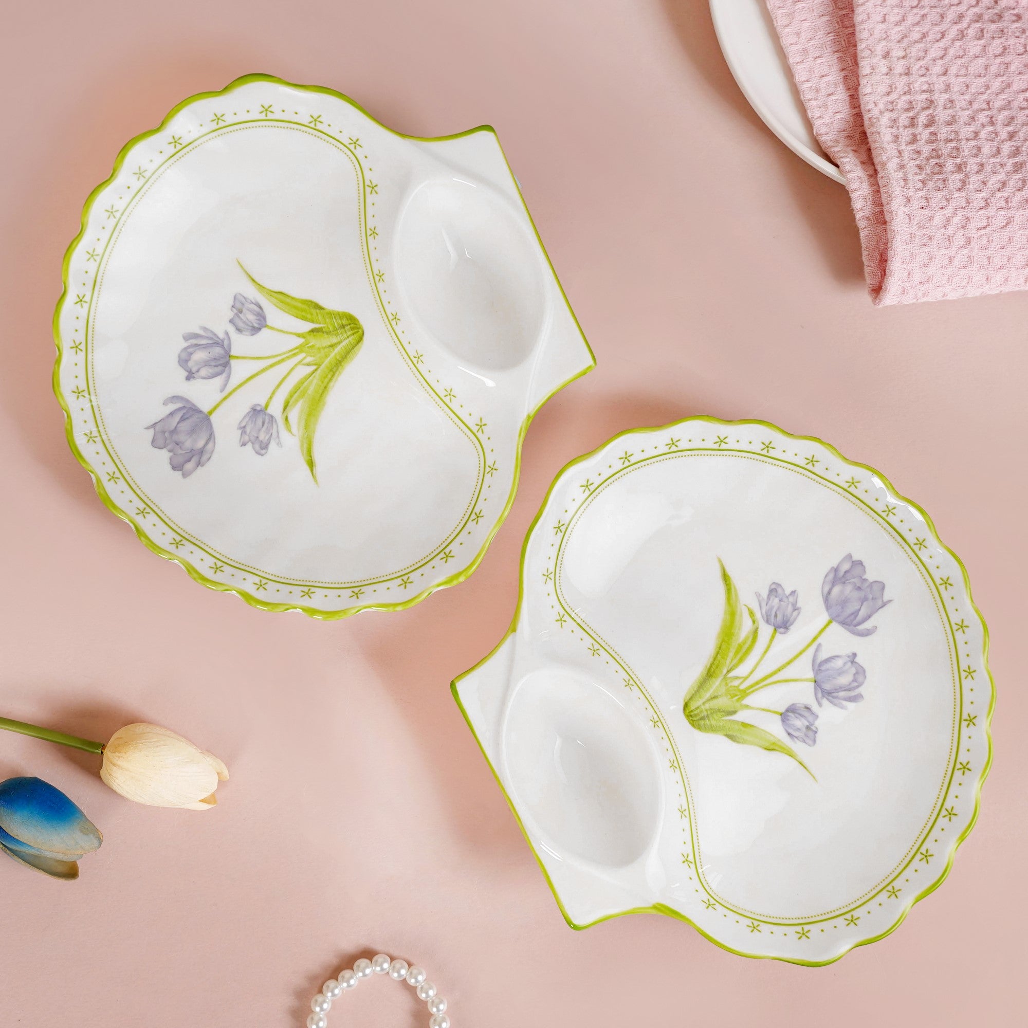 Design: Made from premium ceramic, each plate features a soft sea-shell silhouette with gentle scalloped edges. The sectioned layout includes a dedicated dip compartment and a spacious outer area for snacks and finger foods. The design showcases hand-painted-style lavender flowers paired with a fresh green border, giving the plate a serene Tuscan-inspired look. Finished with a smooth green rim, the plates bring a refreshing, garden-fresh feel to any tablescape.