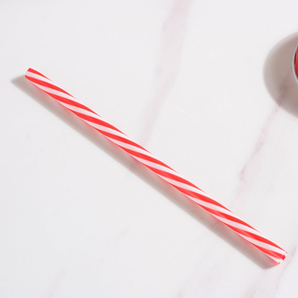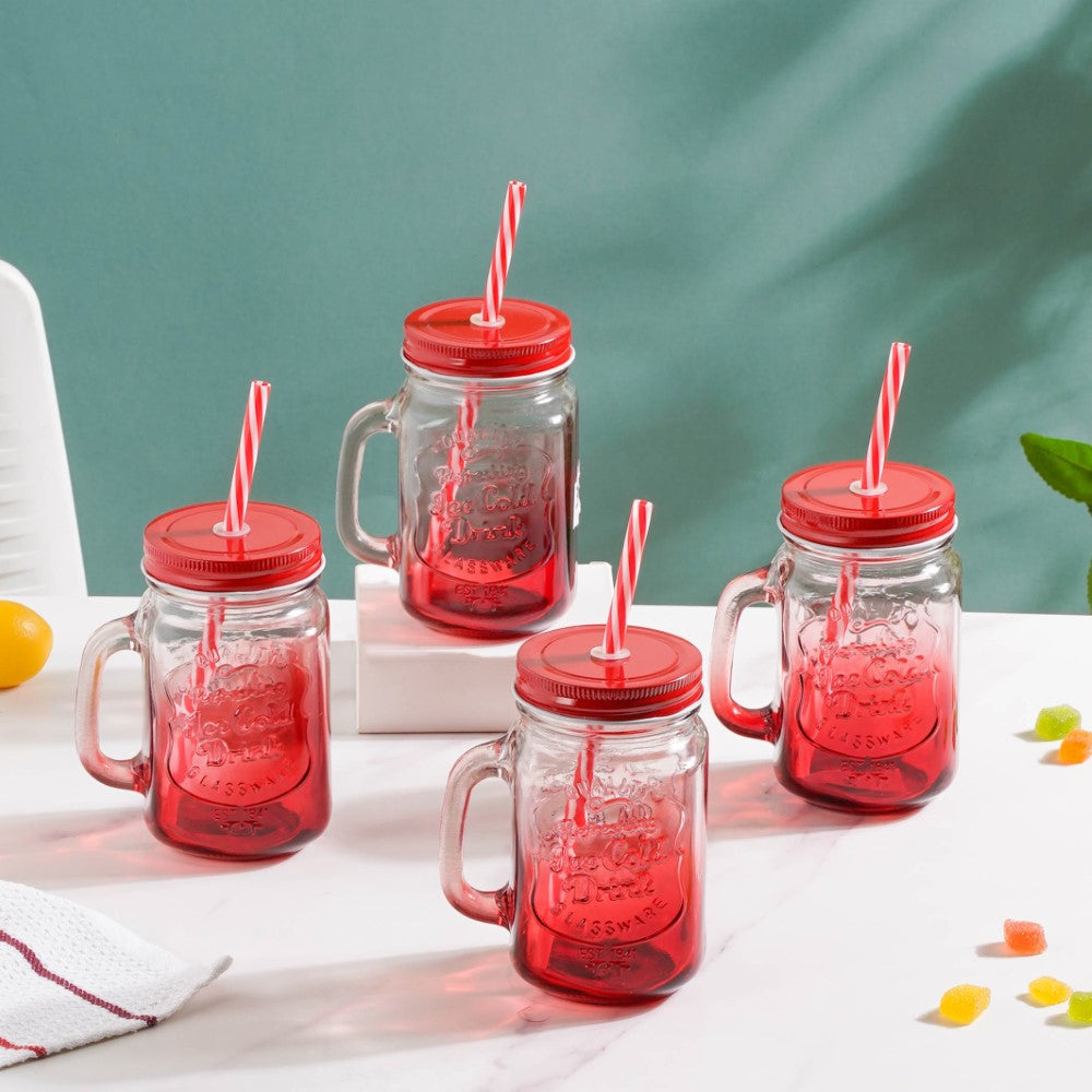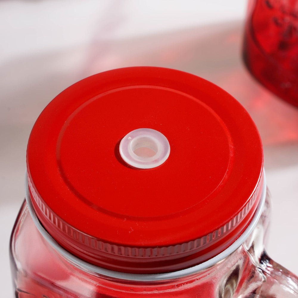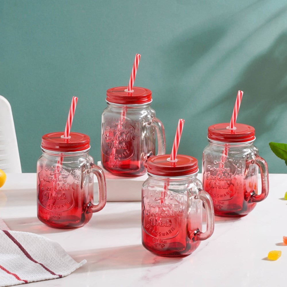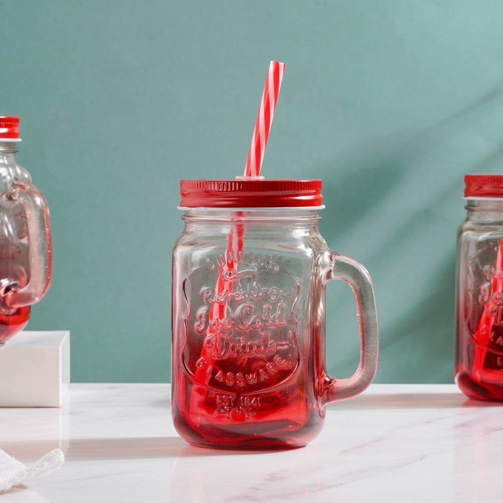 The vibrant red glass jar with lid and straw makes sipping homemade smoothies, iced tea, fruit juices, and other cold drinks a more enjoyable experience. The well-fit metallic lid of the jar prevents the chances of any spills. The jar has an opening to place the pretty candy-cane patterned straw which helps one to easily sip the beverage while on the go. The wide straw is ideal for thicker smoothies as well.