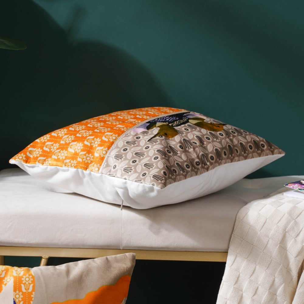 Inspired from the flora and fauna of nature, this bright and vibrant cushion cover has been designed to uplift a modern home. The luxurious velvet cushion cover showcases a pair of ducks against the backdrop of abstract florals which have been embellished with brown hand embroidered lines for a 3D effect. The abstract cushion case is surely a conversation starter in a crowded room.