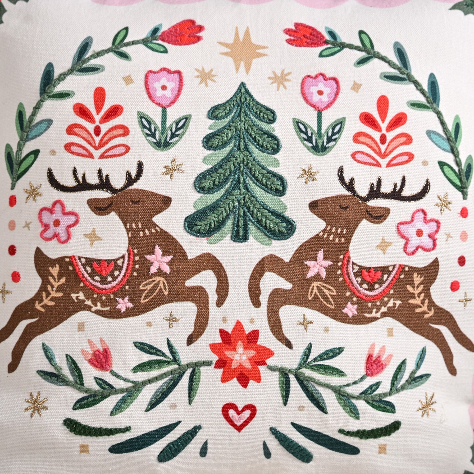 Design: The cushion showcases two reindeer facing each other, surrounded by a delightful burst of festive motifs like flowers, leaves, and stars, all rendered in vibrant, detailed prints, embroidery or threadwork. The sides feature a delicate scallop pattern, adding an elegant frame to the design. The cotton slub fabric enhances the artisanal appeal with its natural weave and tactile texture, while a concealed zipper ensures a seamless finish.