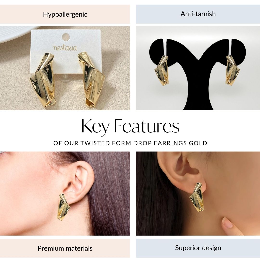 A delicate expression of modern elegance, these gold drop earrings bring minimalist design to life. Inspired by the timeless beauty of metalwork, their abstract twisted shape reflects a graceful fluidity, capturing the essence of simplicity in motion. The rich gold finish enhances their sculptural form, exuding warmth and refined sophistication. A perfect balance of art and subtle luxury, these earrings are an ideal choice for those who cherish the quiet power of minimalist beauty.
