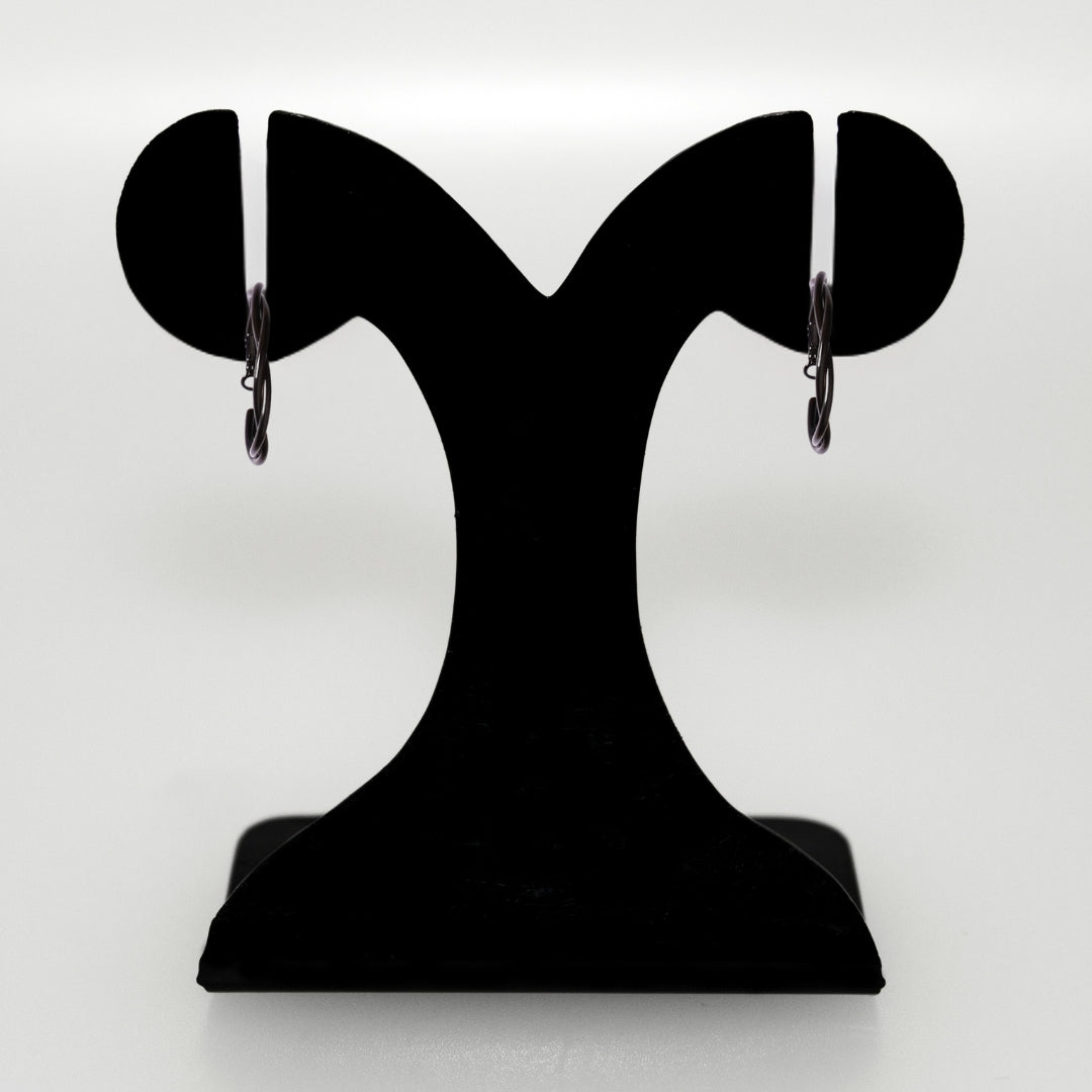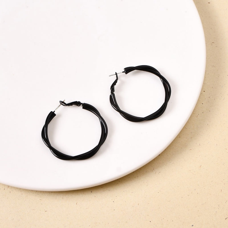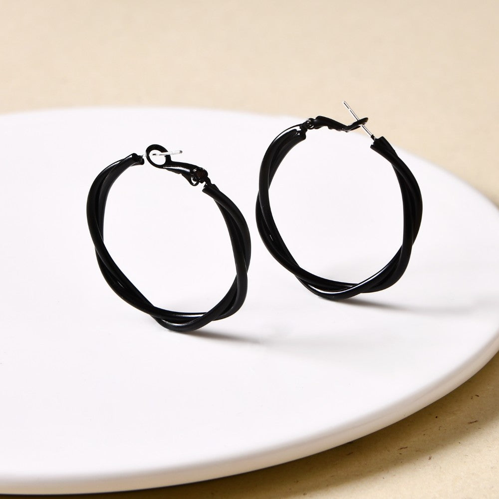 Designed to captivate, these black metal hoop earrings feature an artful double-layered structure. The twisting loops create a striking interplay of curves, adding depth and movement to the classic hoop design. Modern yet timeless, they’re the perfect accent for effortless day-to-night style.