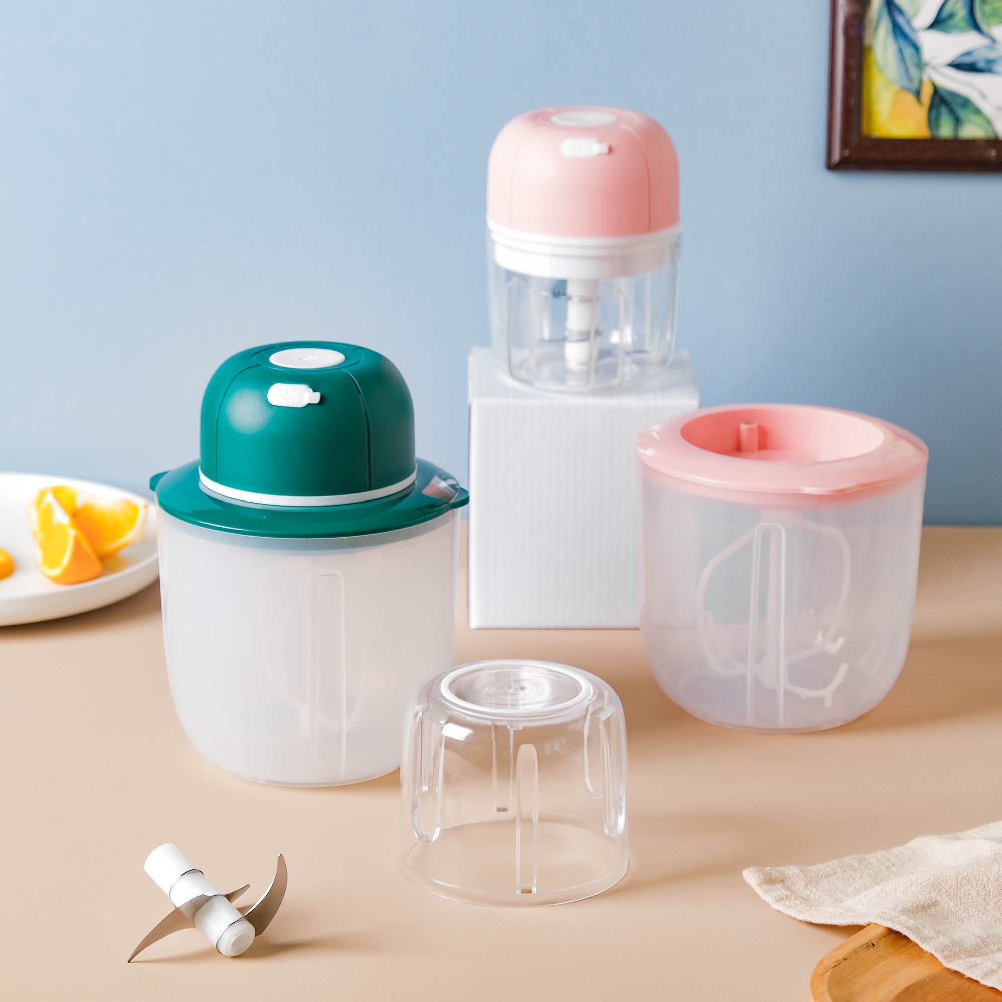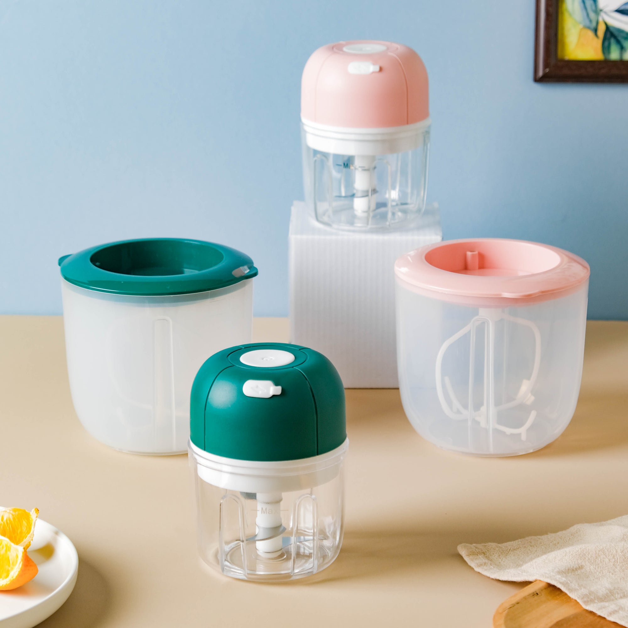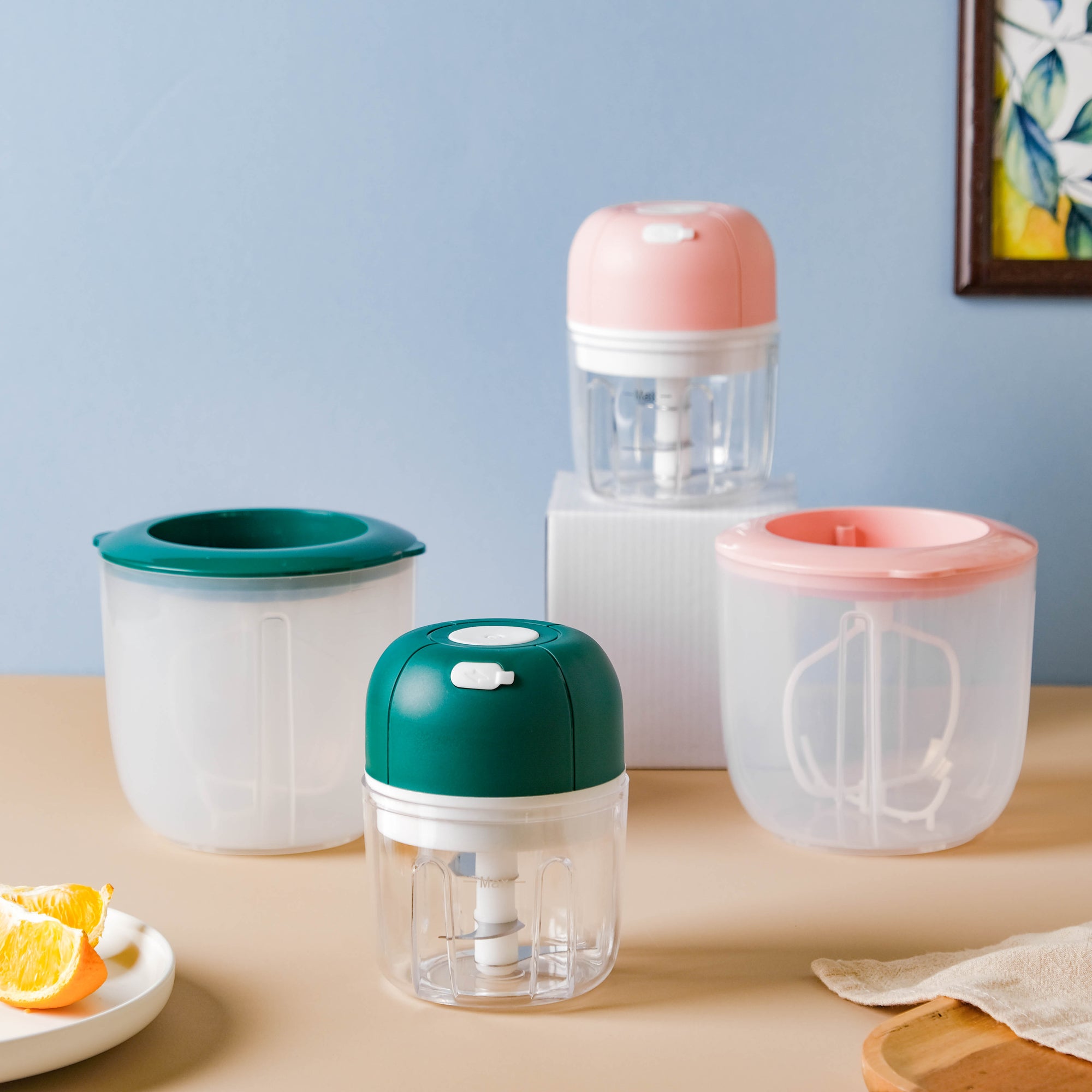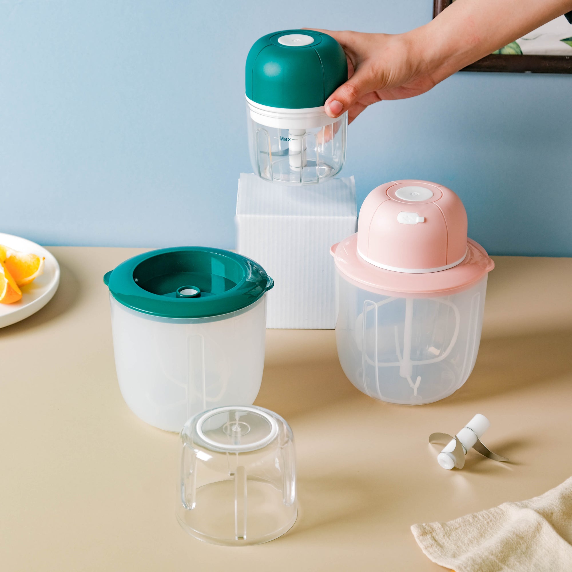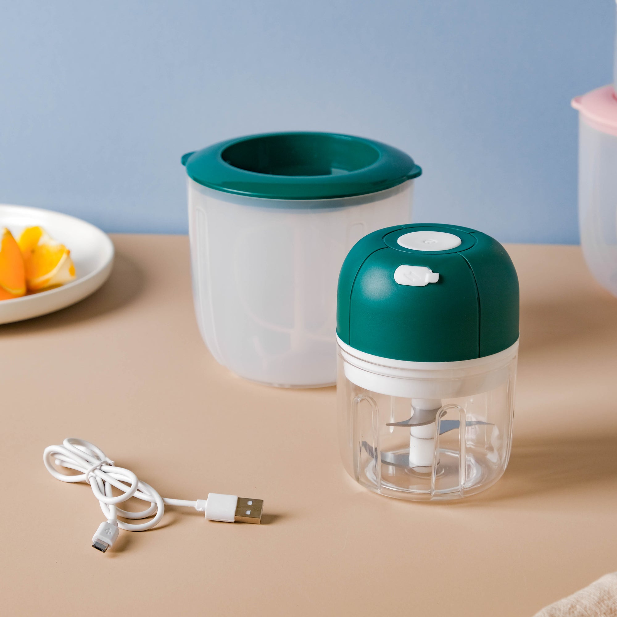 The recyclable electric whisk and chopper with a USB cable makes meal prepping quick and easy. The vegetable chopper can help to finely chop small vegetables like garlic or onion, and the egg whisker attachment allows hassle-free whisking of eggs or whipped cream without the need for any additional kitchen tools. The fact that it is electric, makes the chopping and whisking instant. Use the egg beater to beat eggs or cream while baking a cake or preparing other delicious desserts.