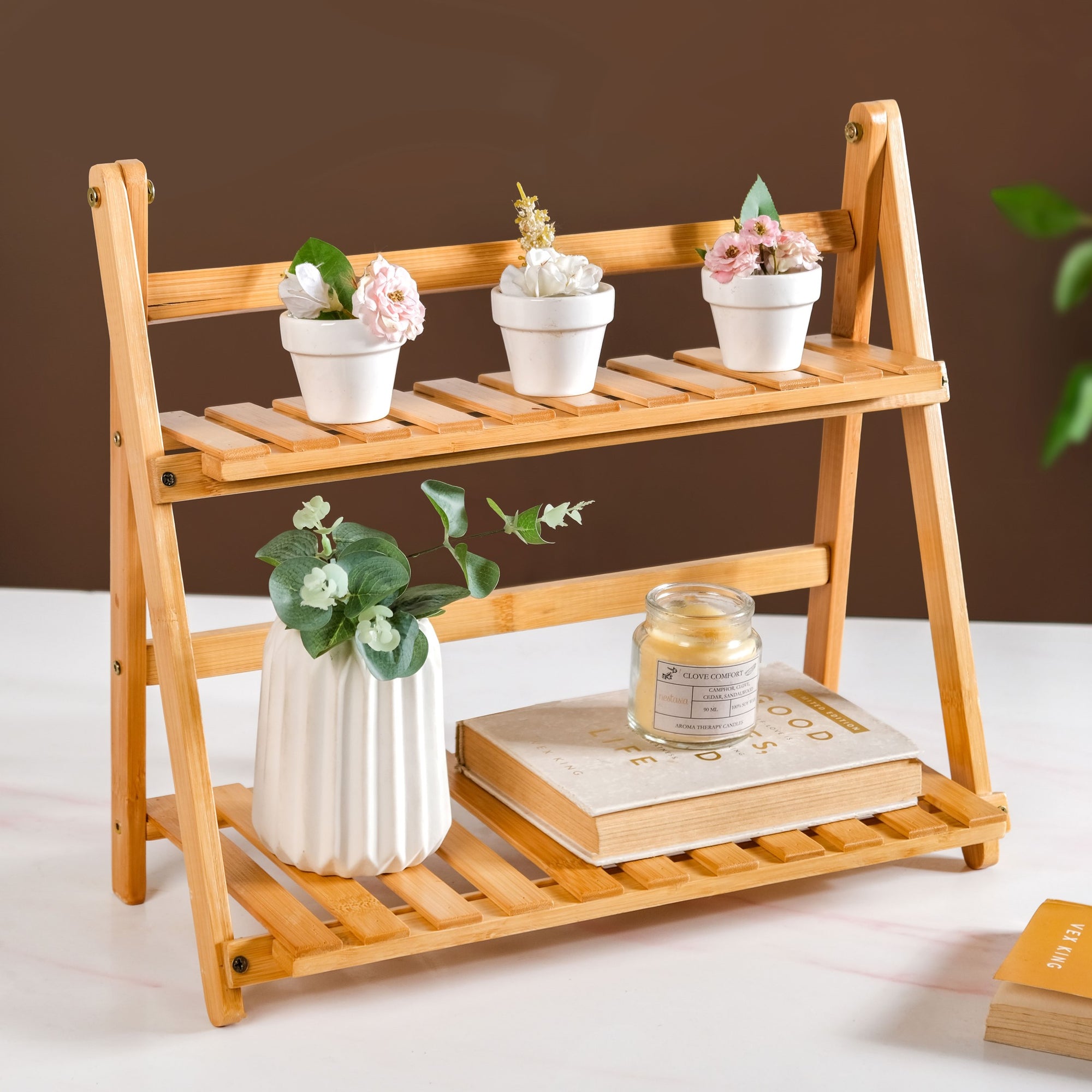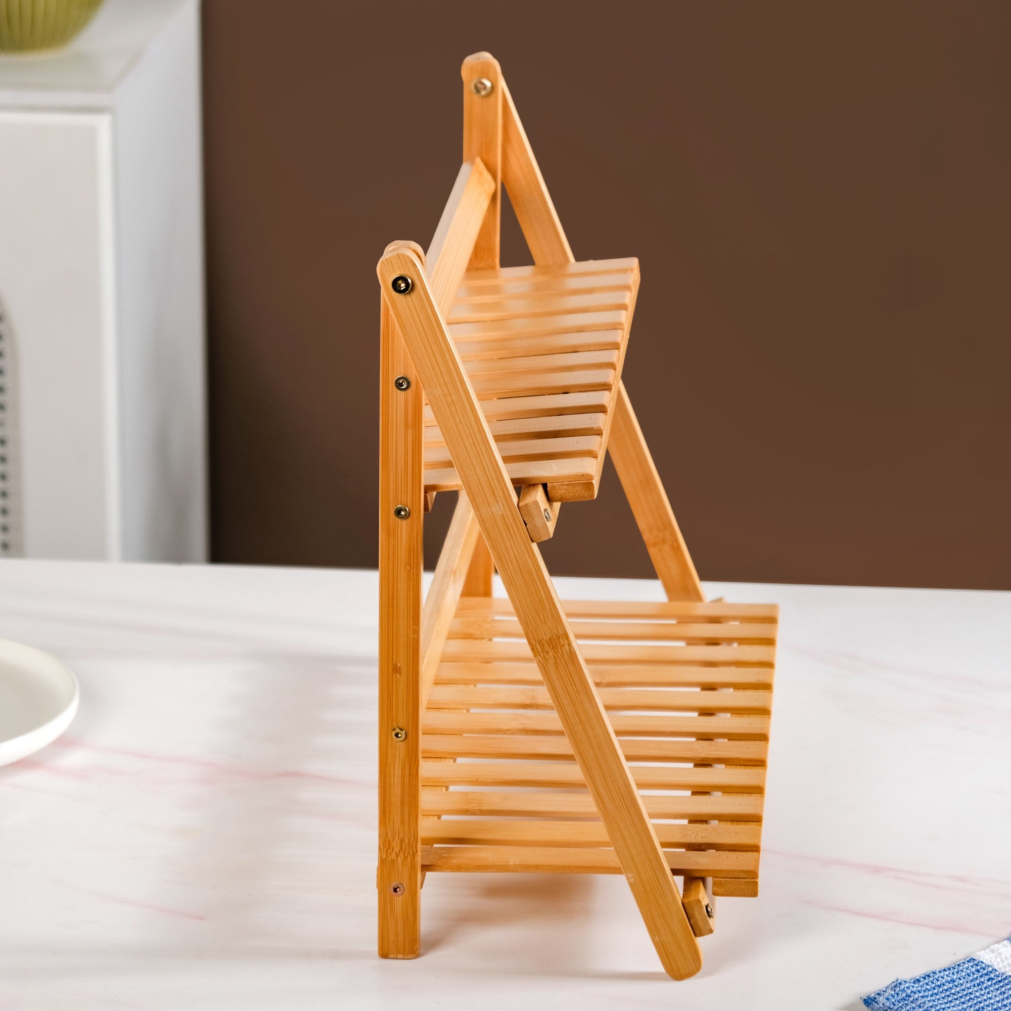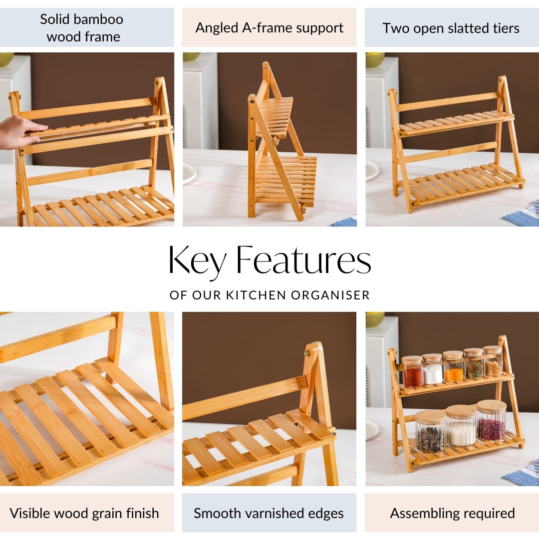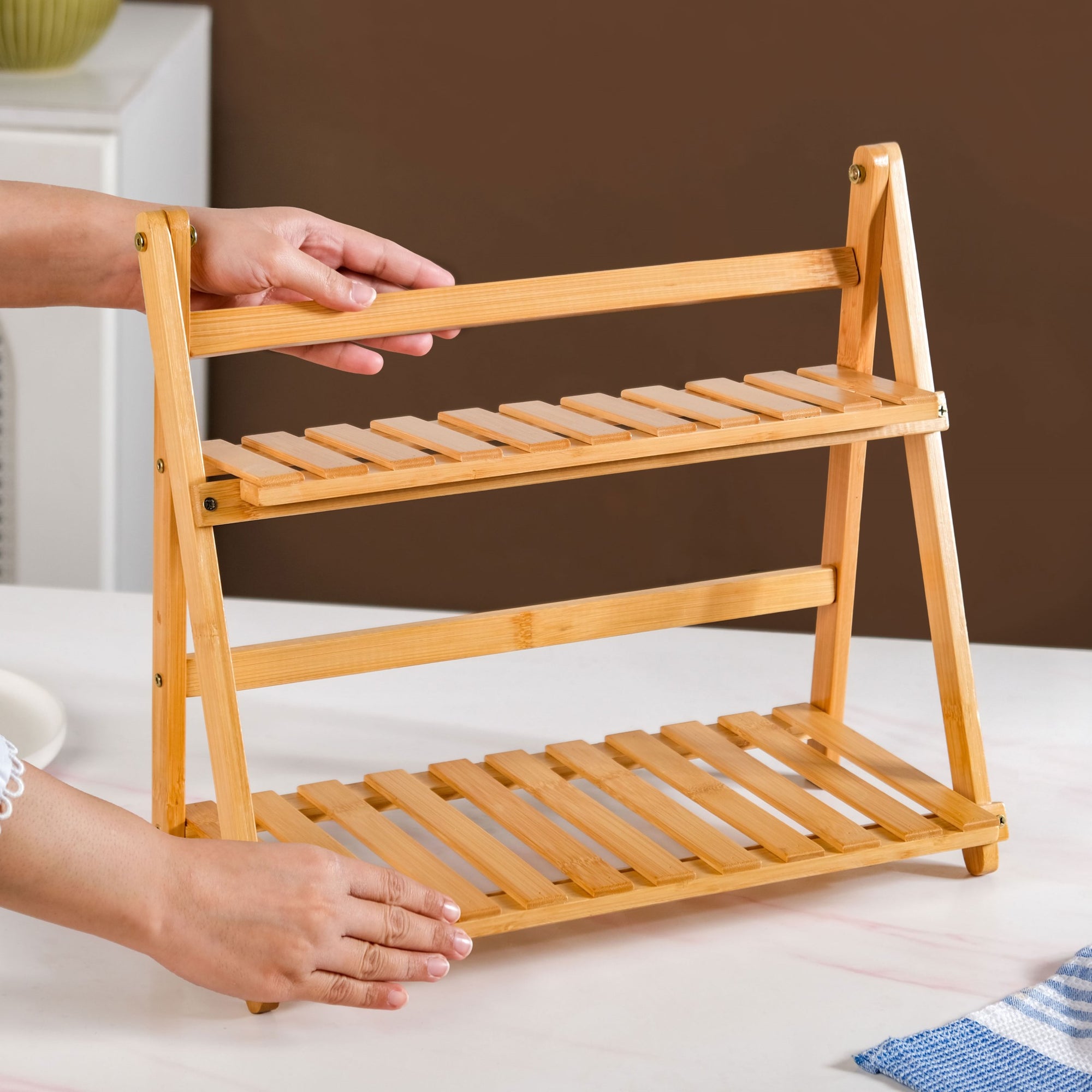 Design: Crafted from natural bamboo, this storage rack features a two-tier slatted shelf structure that offers both practicality and aesthetic charm. Its freestanding A-frame design comes with a slightly angled stance that lends added balance to the compact build. The tray is lightweight yet impressively sturdy, making it easy to move around when needed. A smooth, polished finish enhances the natural wood grain, giving it a clean and seamless look. With evenly spaced slats, the design promotes airflow, making it ideal for storing fresh produce or dry goods. Its neutral tone works well with a wide range of interior themes, while the foldable structure allows for effortless storage when not in use. Screwed joints hold everything together for a reliably stable form. Made from 100% bamboo wood, use a damp cloth to wipe and let it air dry for long-lasting use.