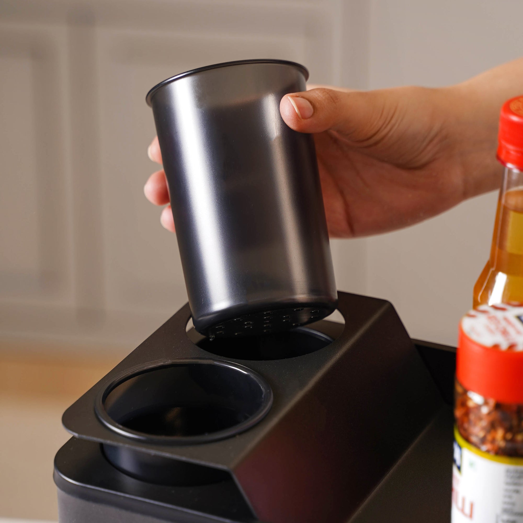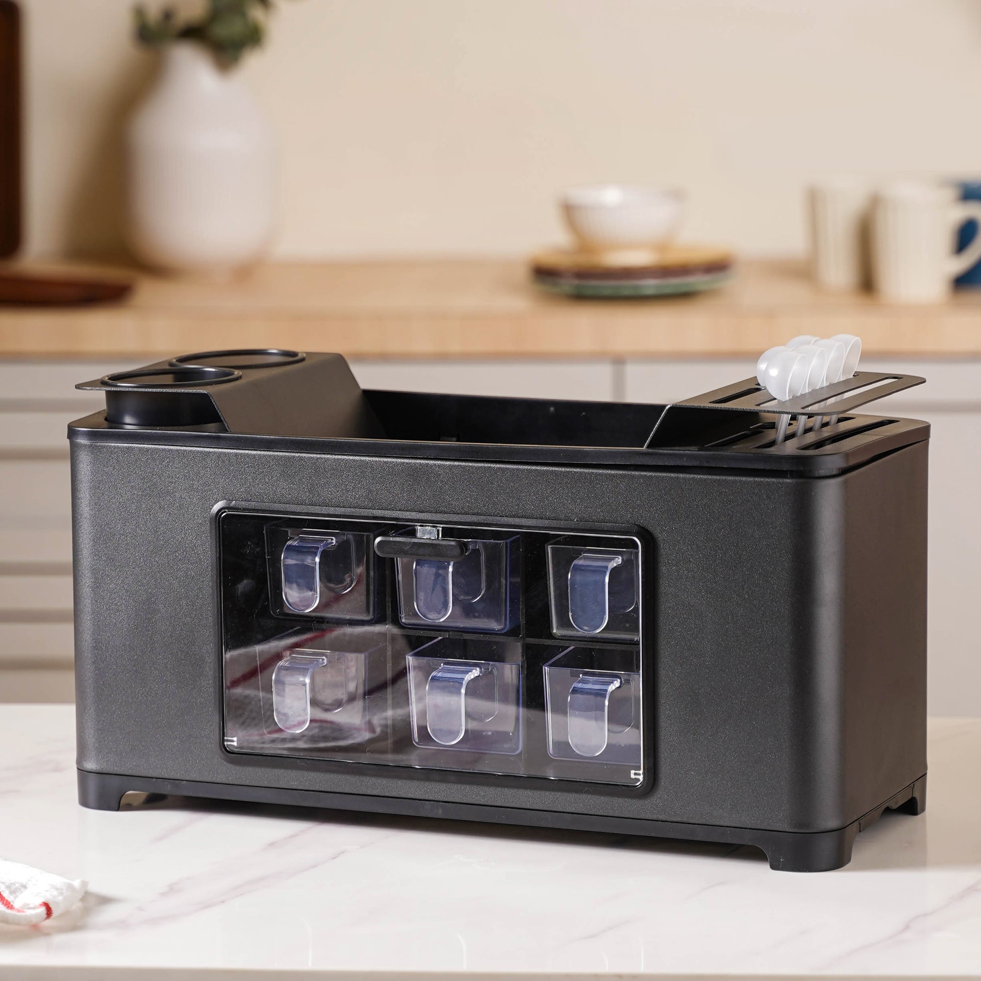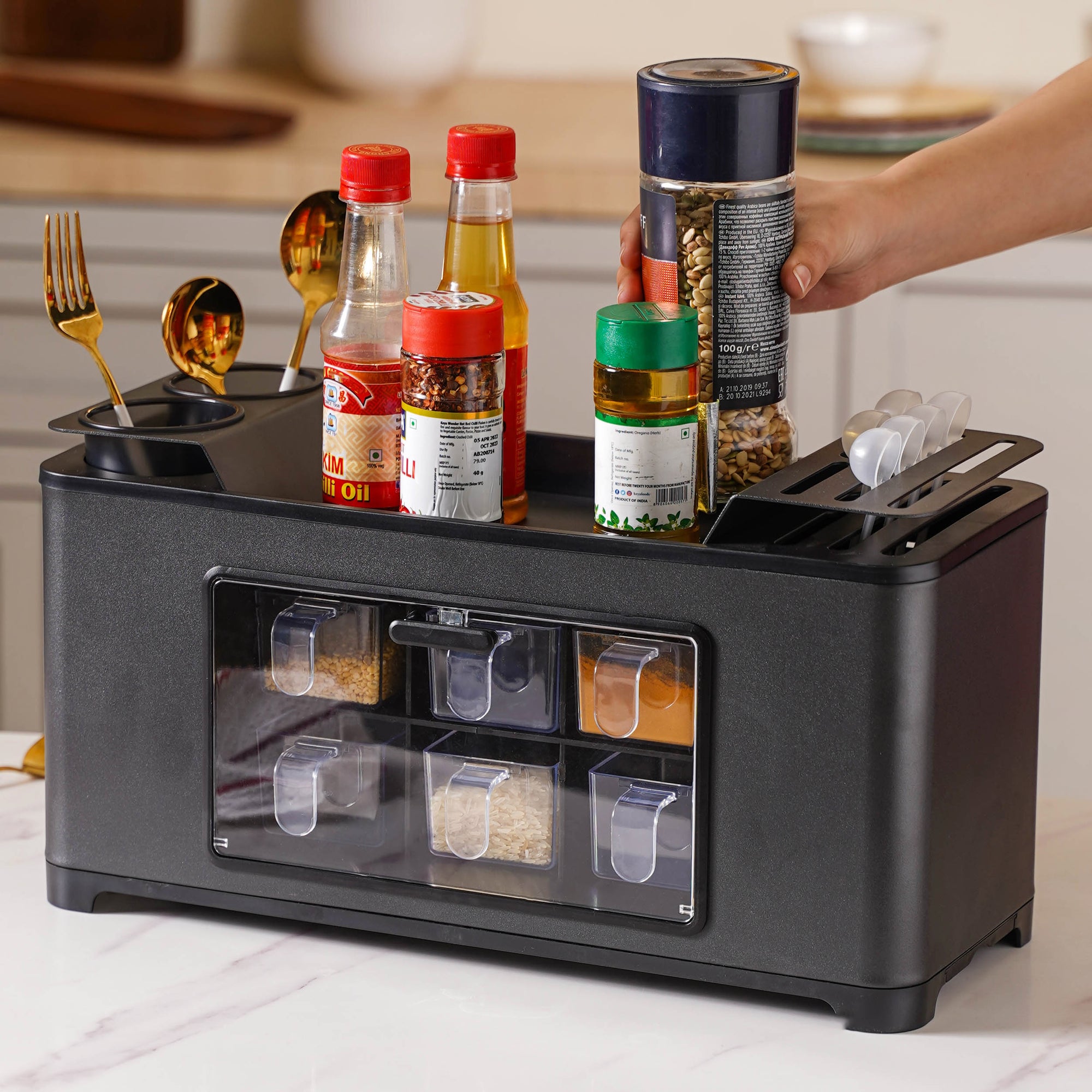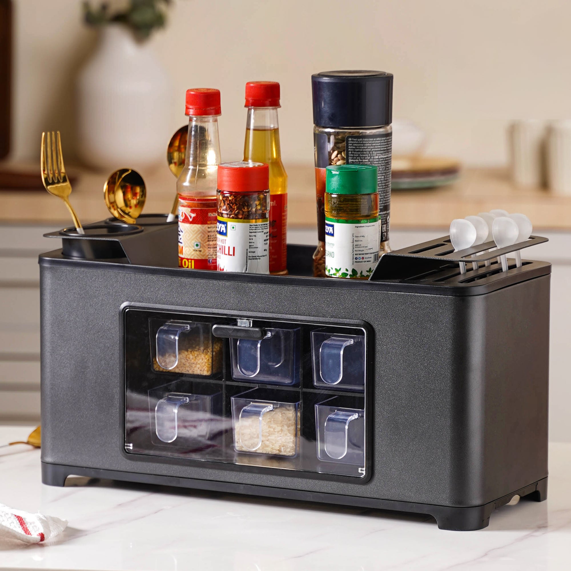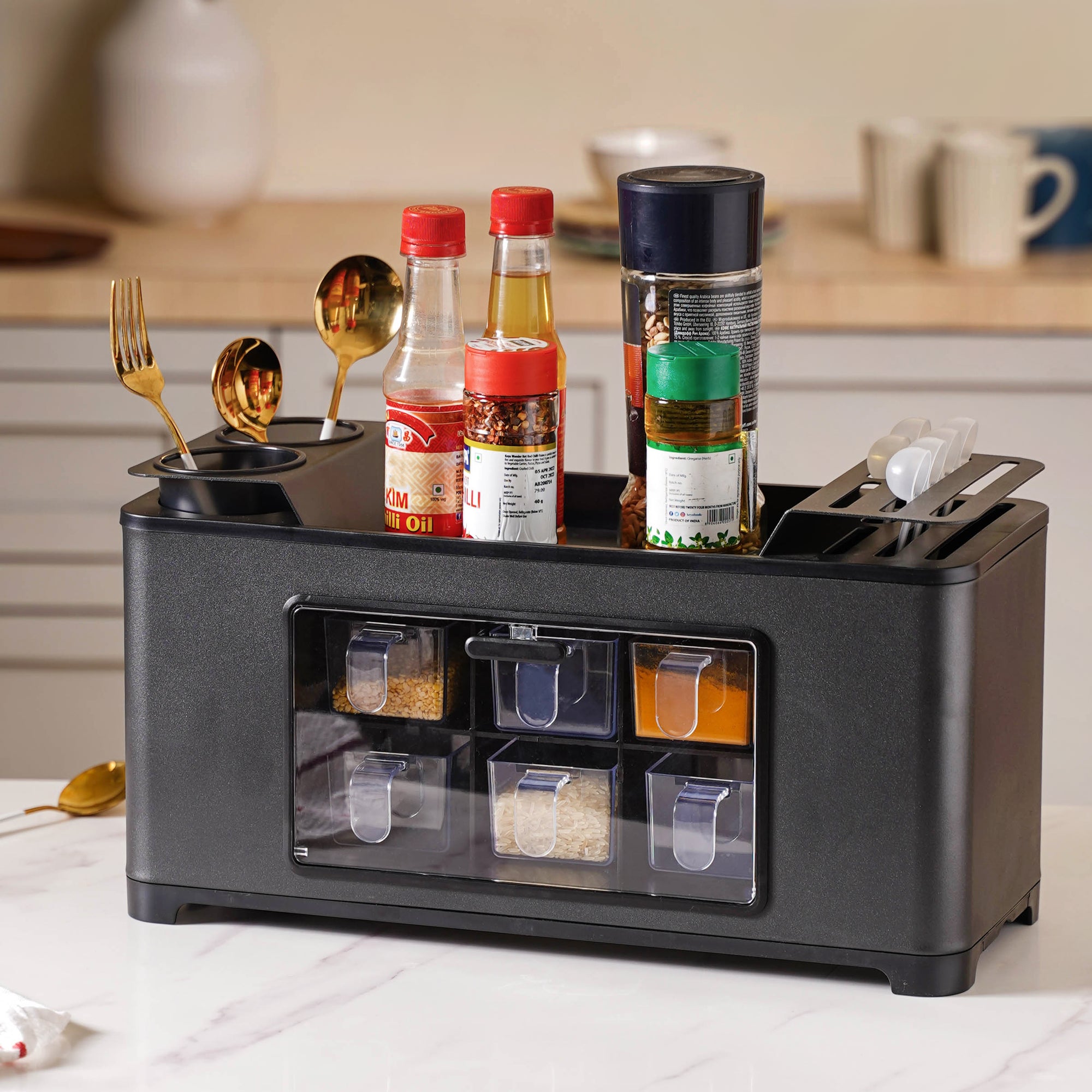 The black ventilated kitchen storage rack is crafted in high-quality metal and comes with multiple compartments to store a variety of kitchen utilities. The top rack is equipped with slots for holding spatulas, ladles, or knives. The two perforated tumblers can be used for storing a variety of cutlery such as chopsticks, forks, spoons, and a lot more. The center of the storage rack with a transparent door can be opened to arrange spices in the six PVC containers which are equipped with six tiny spoons. This storage rack is the ultimate space-saver for any modern kitchen. Features: -closed storage for grains and spices-double decker storage with top rack for condiments and sauces-side storage for cutlery, knives, spoons-easy pull out container for spices with spoons -suitable for the kitchen, dresser, bathroom or garden -removable shelves for hassle-free cleaning -perforated racks for easy drainage -racks can be disassembled for storage when not in use-durable and space-saving -easy and effortless to assemble -innovative design -stable and strong base Nestip: Gift this space saver storage kit to a friend who is setting up a new home. Size: 43cm L x 18cm B x 25cm H Cup- 8.5cm L x 7cm B x 5cm H Glass- 7cm D x 11cm H Spoon- 9cm L Color: Black Material: PVC and metal Products included: 1 set of storage racks Style: OMG114KU05