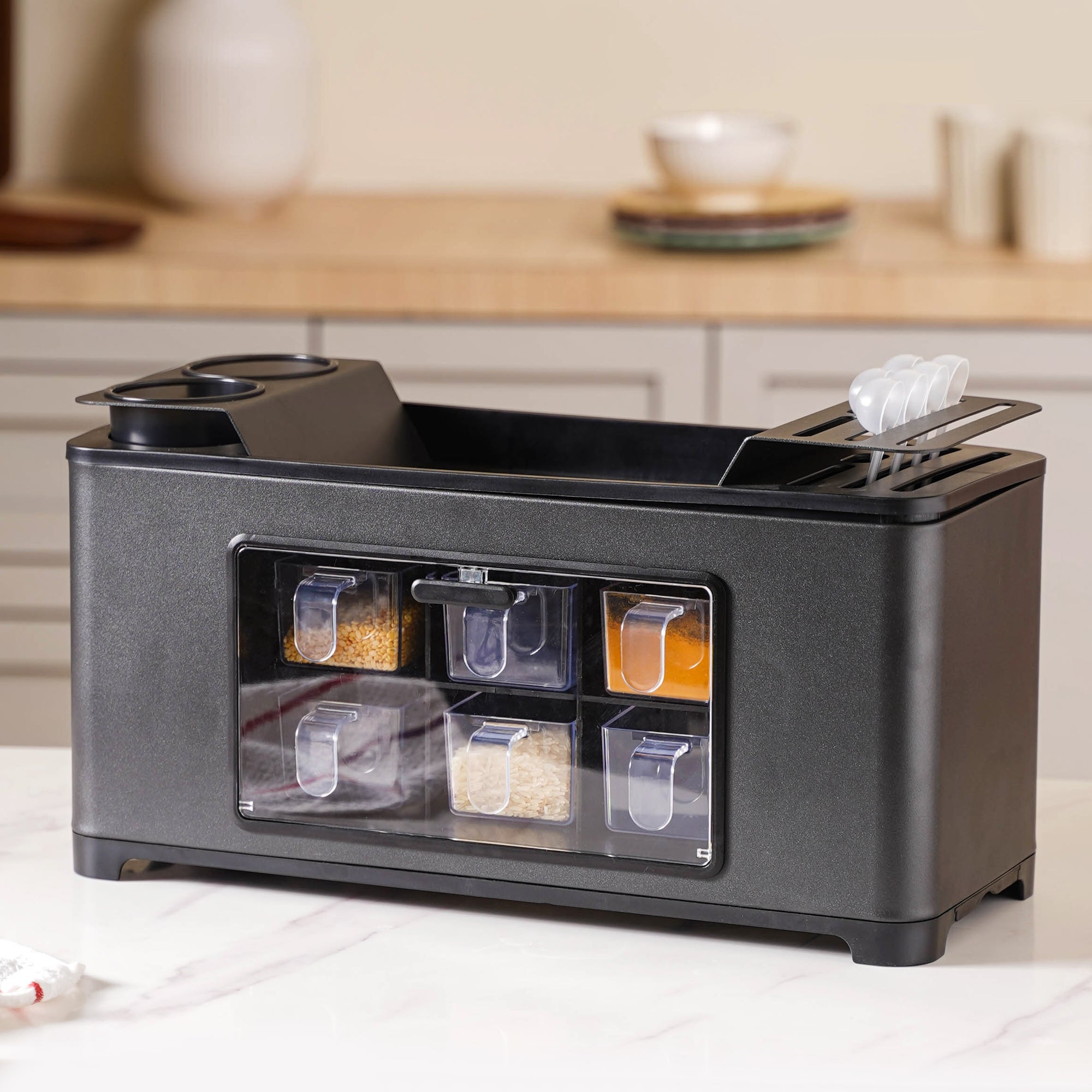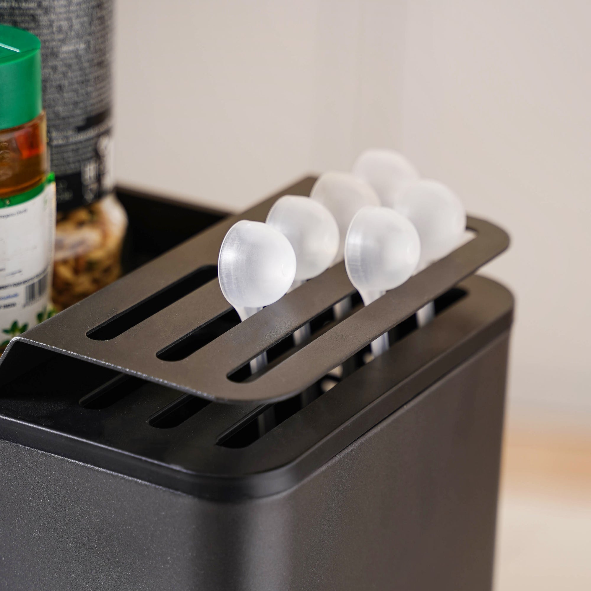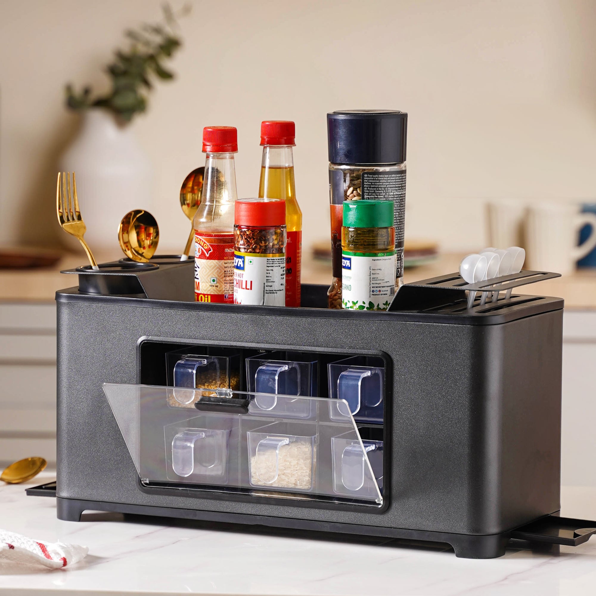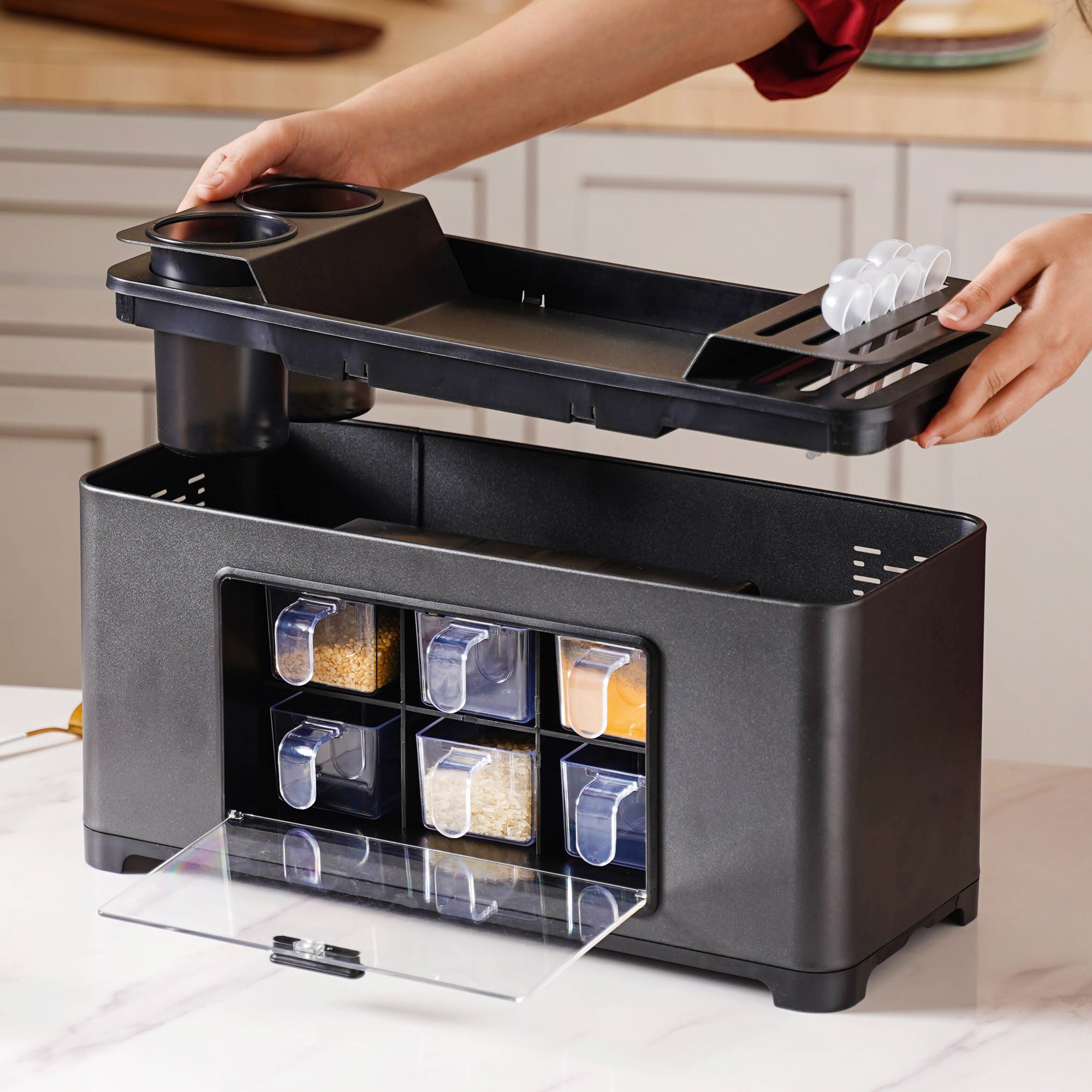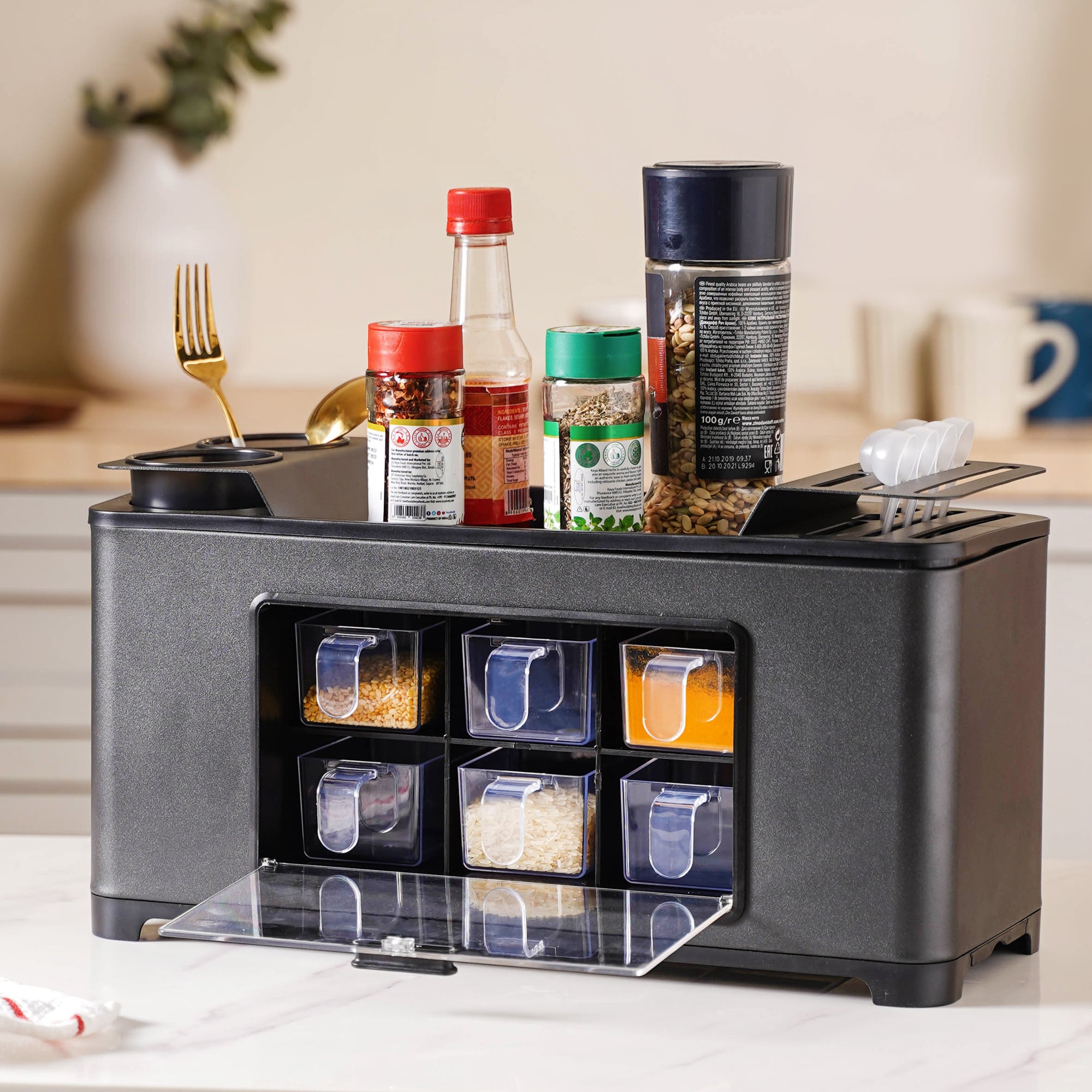 The black ventilated kitchen storage rack is crafted in high-quality metal and comes with multiple compartments to store a variety of kitchen utilities. The top rack is equipped with slots for holding spatulas, ladles, or knives. The two perforated tumblers can be used for storing a variety of cutlery such as chopsticks, forks, spoons, and a lot more. The center of the storage rack with a transparent door can be opened to arrange spices in the six PVC containers which are equipped with six tiny spoons. This storage rack is the ultimate space-saver for any modern kitchen. Features: -closed storage for grains and spices-double decker storage with top rack for condiments and sauces-side storage for cutlery, knives, spoons-easy pull out container for spices with spoons -suitable for the kitchen, dresser, bathroom or garden -removable shelves for hassle-free cleaning -perforated racks for easy drainage -racks can be disassembled for storage when not in use-durable and space-saving -easy and effortless to assemble -innovative design -stable and strong base Nestip: Gift this space saver storage kit to a friend who is setting up a new home. Size: 43cm L x 18cm B x 25cm H Cup- 8.5cm L x 7cm B x 5cm H Glass- 7cm D x 11cm H Spoon- 9cm L Color: Black Material: PVC and metal Products included: 1 set of storage racks Style: OMG114KU05