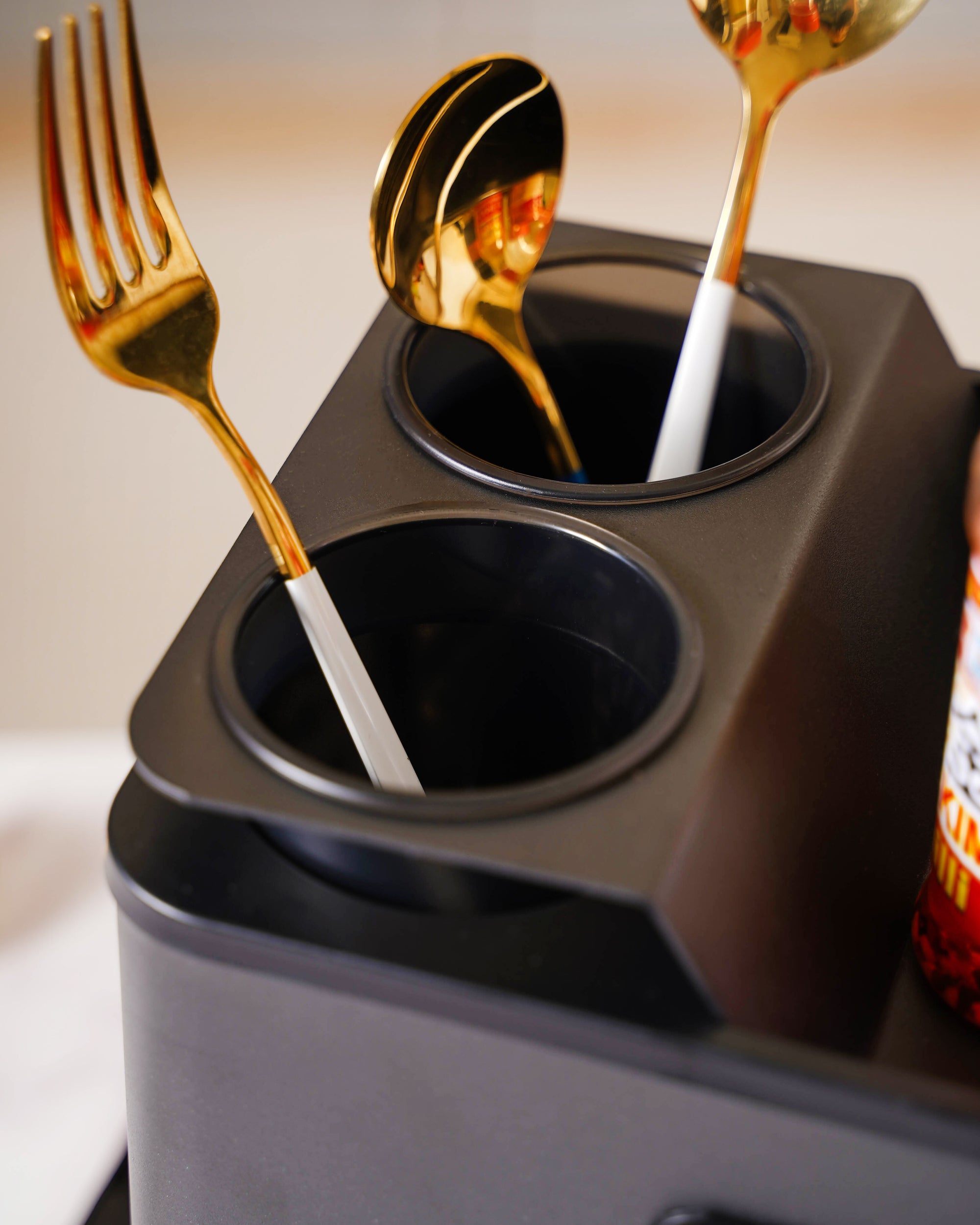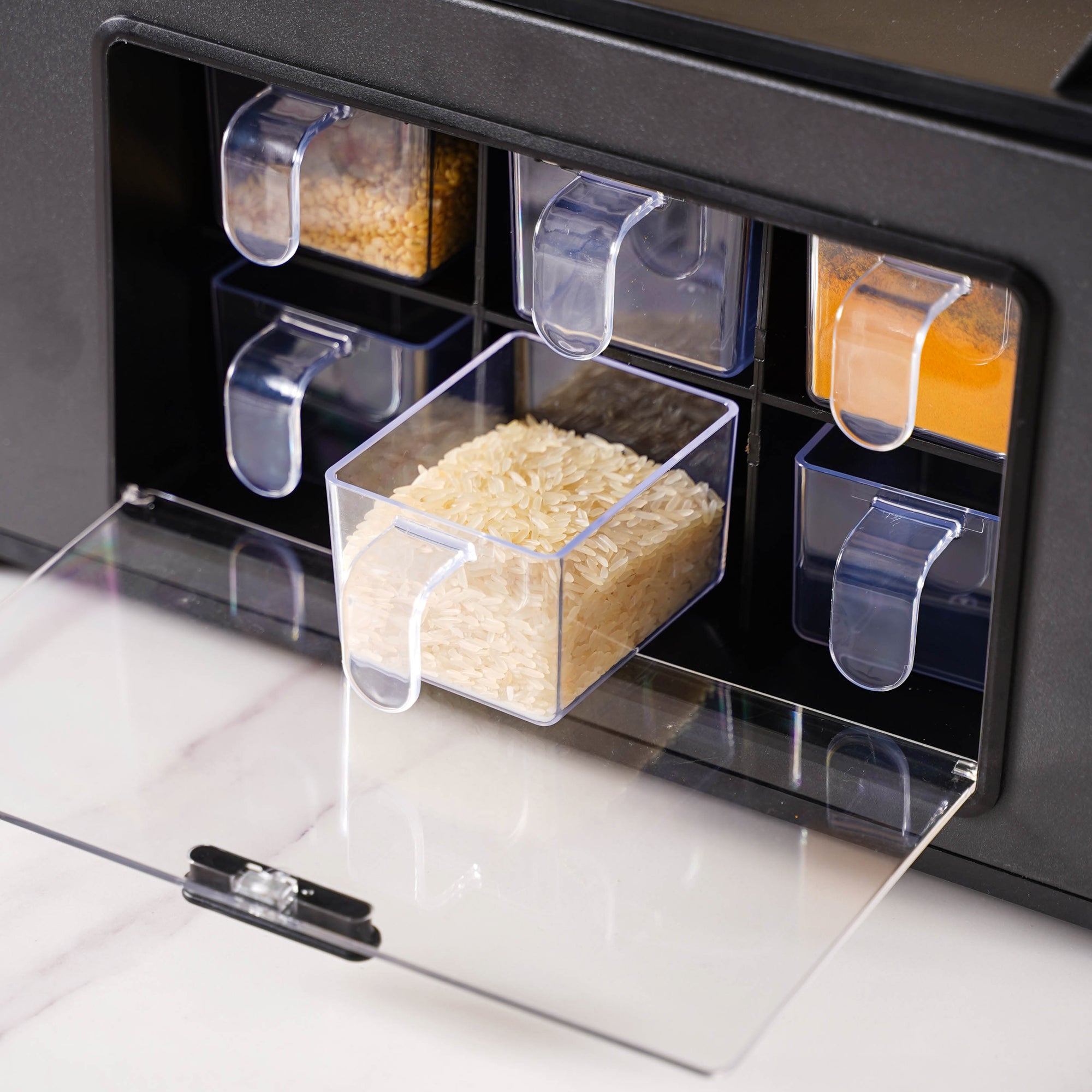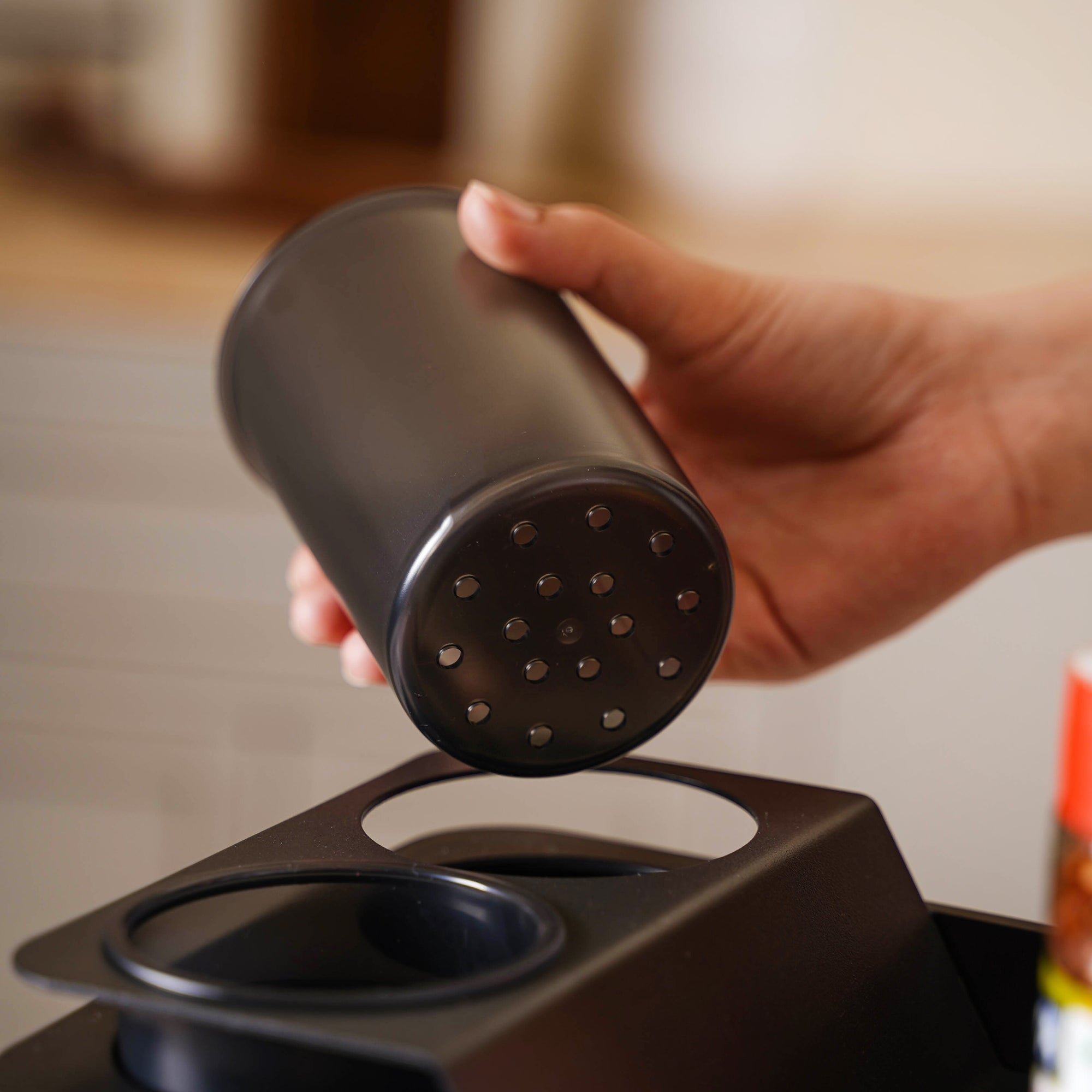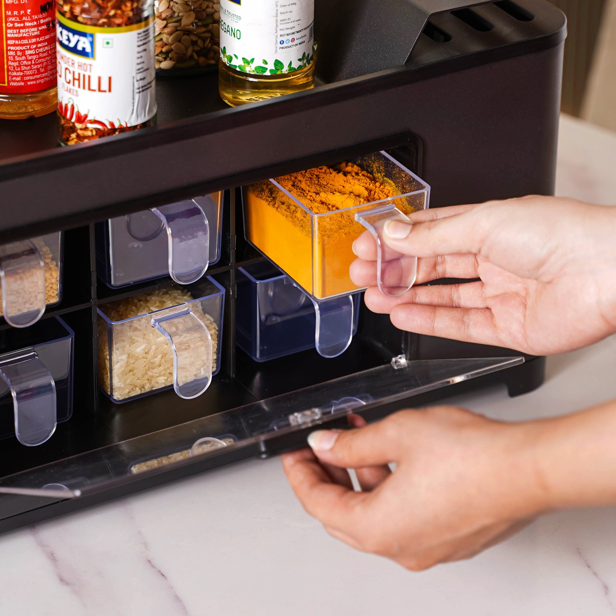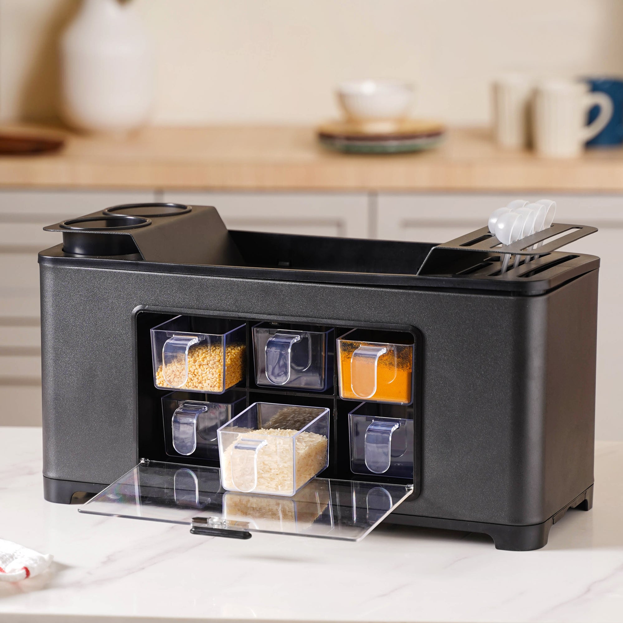 The black ventilated kitchen storage rack is crafted in high-quality metal and comes with multiple compartments to store a variety of kitchen utilities. The top rack is equipped with slots for holding spatulas, ladles, or knives. The two perforated tumblers can be used for storing a variety of cutlery such as chopsticks, forks, spoons, and a lot more. The center of the storage rack with a transparent door can be opened to arrange spices in the six PVC containers which are equipped with six tiny spoons. This storage rack is the ultimate space-saver for any modern kitchen. Features: -closed storage for grains and spices-double decker storage with top rack for condiments and sauces-side storage for cutlery, knives, spoons-easy pull out container for spices with spoons -suitable for the kitchen, dresser, bathroom or garden -removable shelves for hassle-free cleaning -perforated racks for easy drainage -racks can be disassembled for storage when not in use-durable and space-saving -easy and effortless to assemble -innovative design -stable and strong base Nestip: Gift this space saver storage kit to a friend who is setting up a new home. Size: 43cm L x 18cm B x 25cm H Cup- 8.5cm L x 7cm B x 5cm H Glass- 7cm D x 11cm H Spoon- 9cm L Color: Black Material: PVC and metal Products included: 1 set of storage racks Style: OMG114KU05