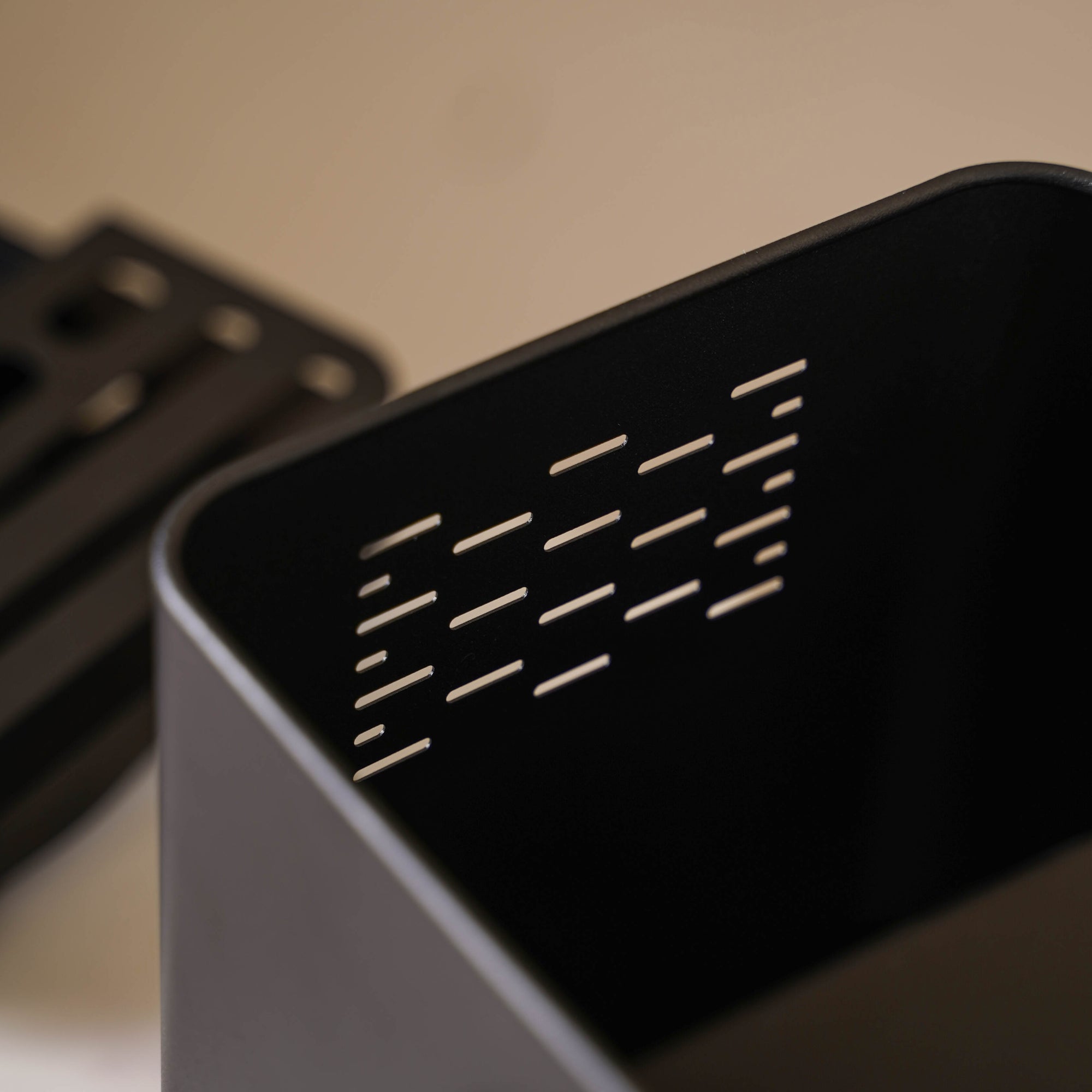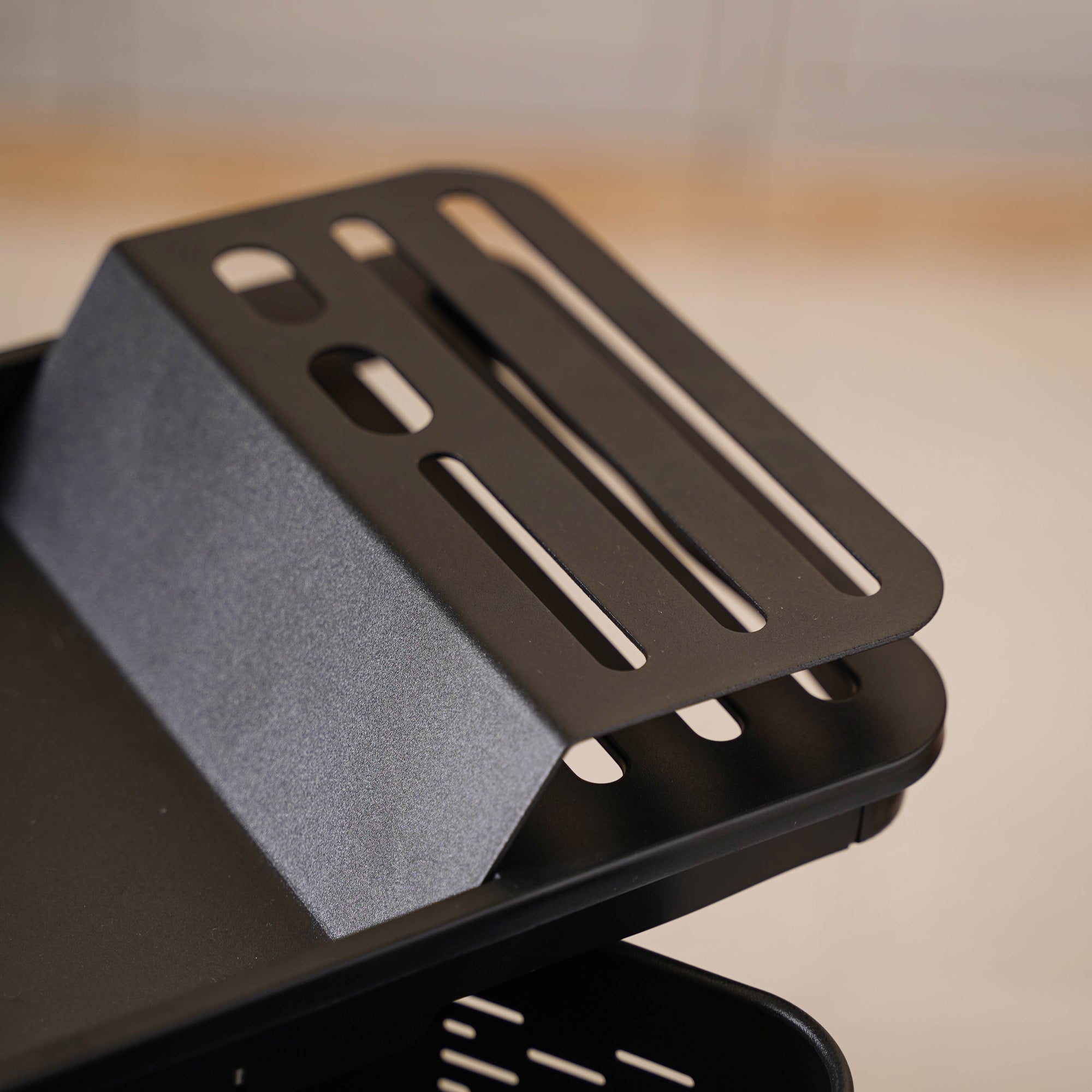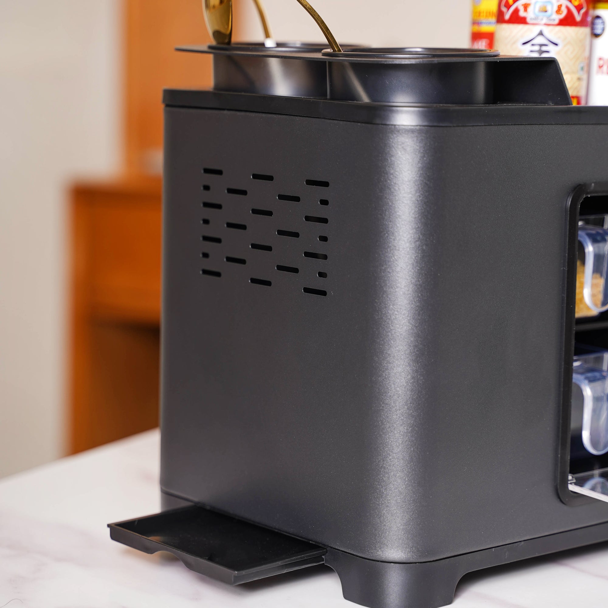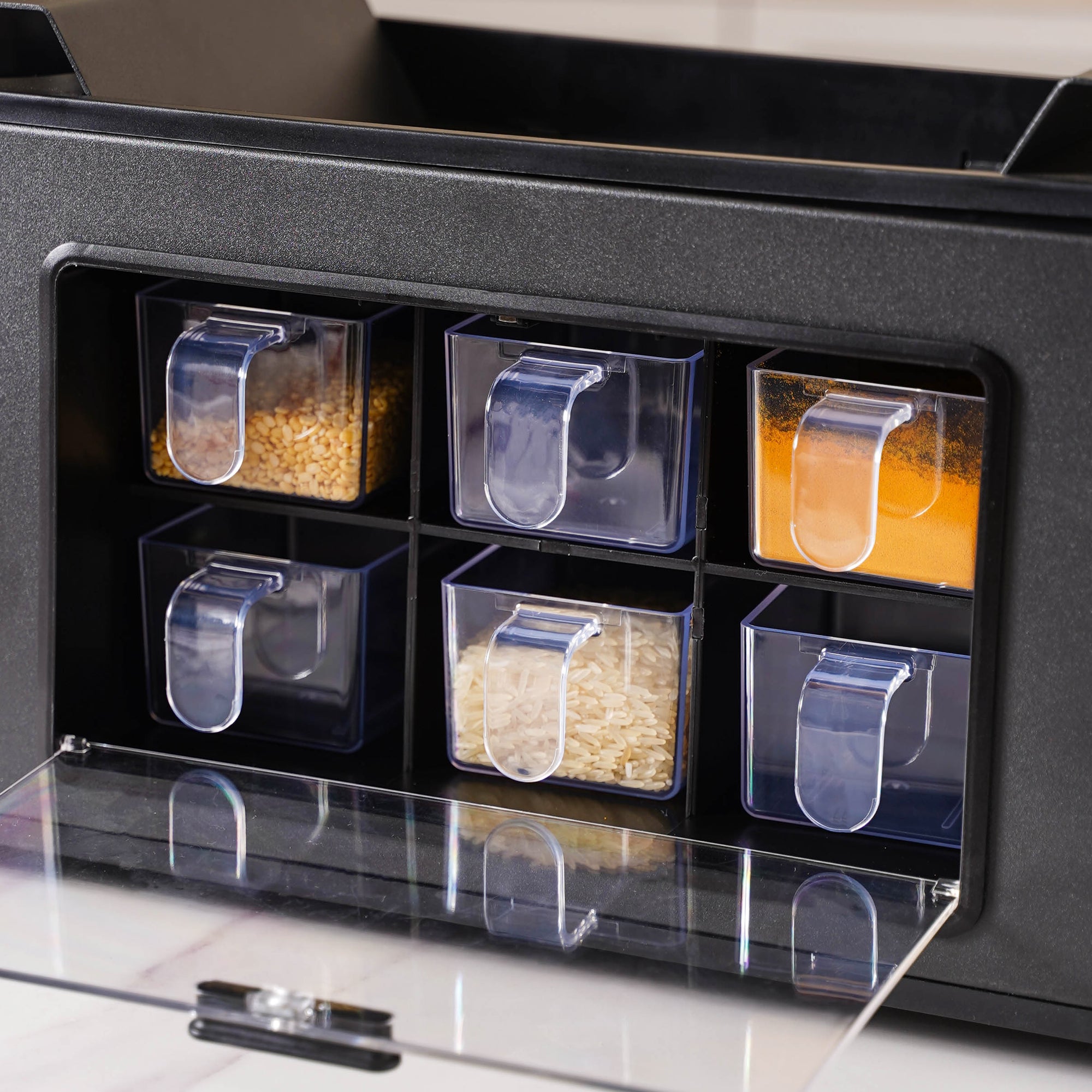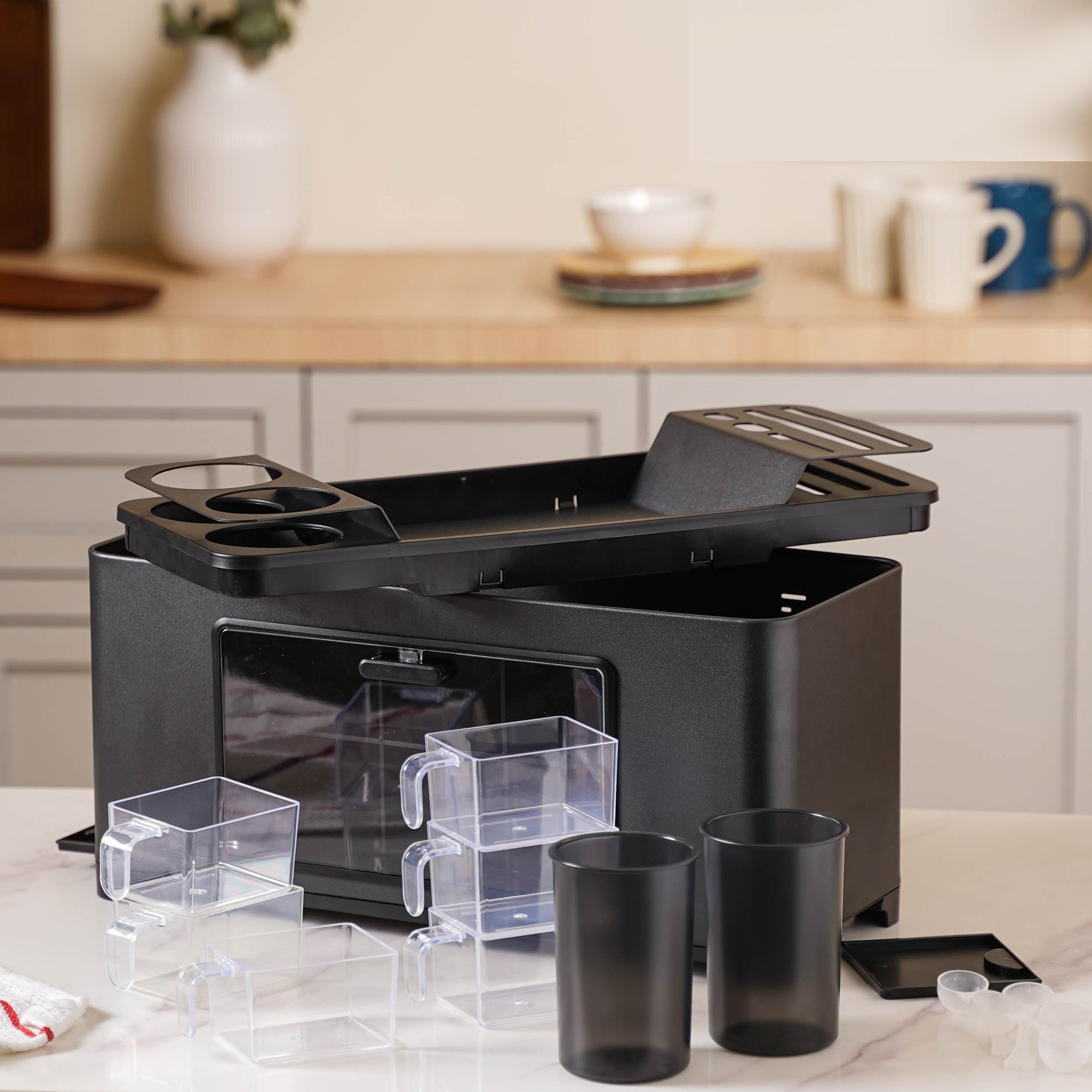 The black ventilated kitchen storage rack is crafted in high-quality metal and comes with multiple compartments to store a variety of kitchen utilities. The top rack is equipped with slots for holding spatulas, ladles, or knives. The two perforated tumblers can be used for storing a variety of cutlery such as chopsticks, forks, spoons, and a lot more. The center of the storage rack with a transparent door can be opened to arrange spices in the six PVC containers which are equipped with six tiny spoons. This storage rack is the ultimate space-saver for any modern kitchen. Features: -closed storage for grains and spices-double decker storage with top rack for condiments and sauces-side storage for cutlery, knives, spoons-easy pull out container for spices with spoons -suitable for the kitchen, dresser, bathroom or garden -removable shelves for hassle-free cleaning -perforated racks for easy drainage -racks can be disassembled for storage when not in use-durable and space-saving -easy and effortless to assemble -innovative design -stable and strong base Nestip: Gift this space saver storage kit to a friend who is setting up a new home. Size: 43cm L x 18cm B x 25cm H Cup- 8.5cm L x 7cm B x 5cm H Glass- 7cm D x 11cm H Spoon- 9cm L Color: Black Material: PVC and metal Products included: 1 set of storage racks Style: OMG114KU05
