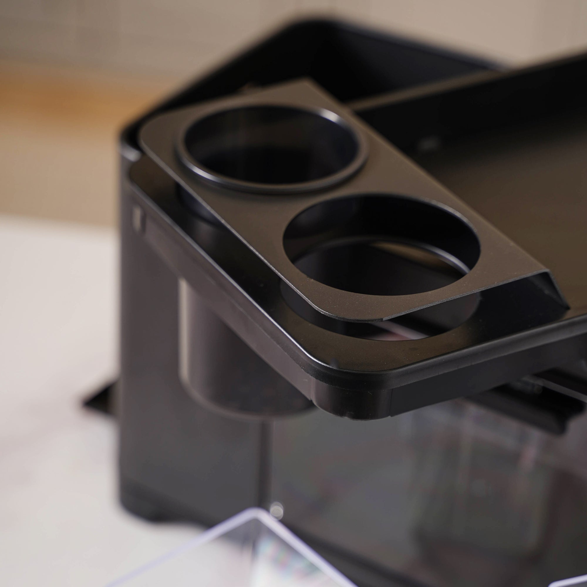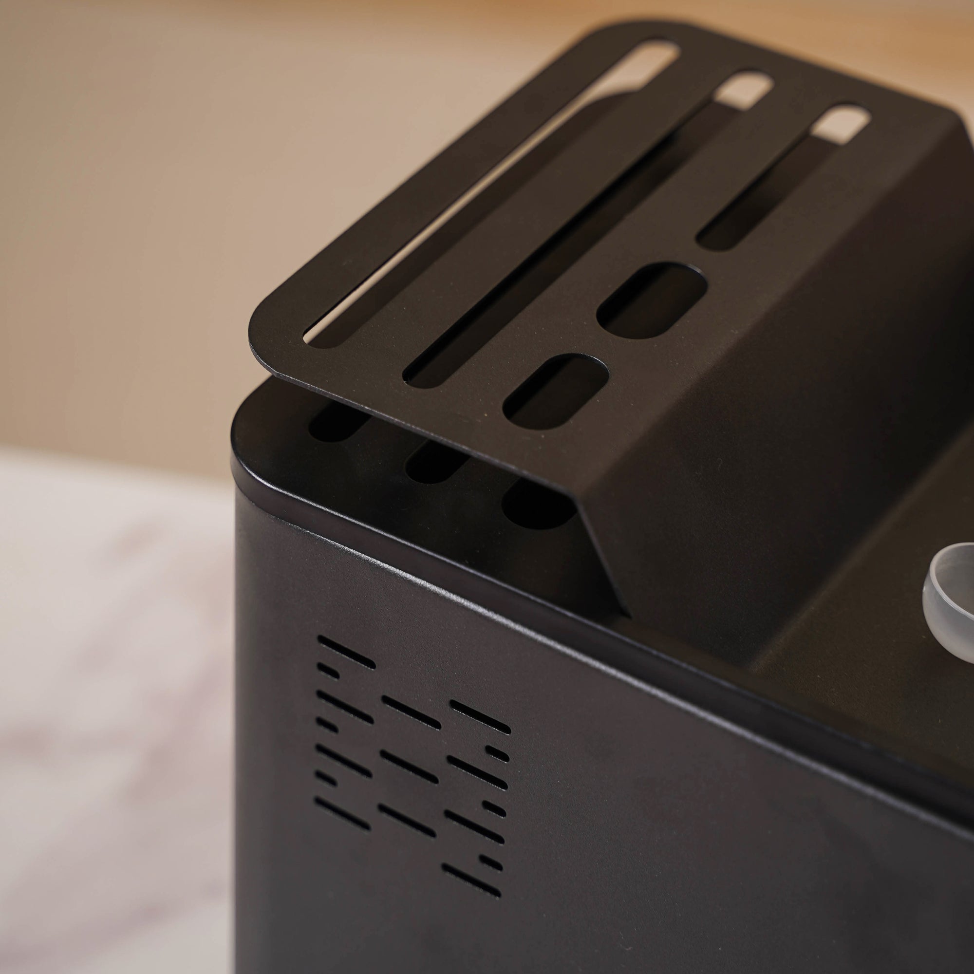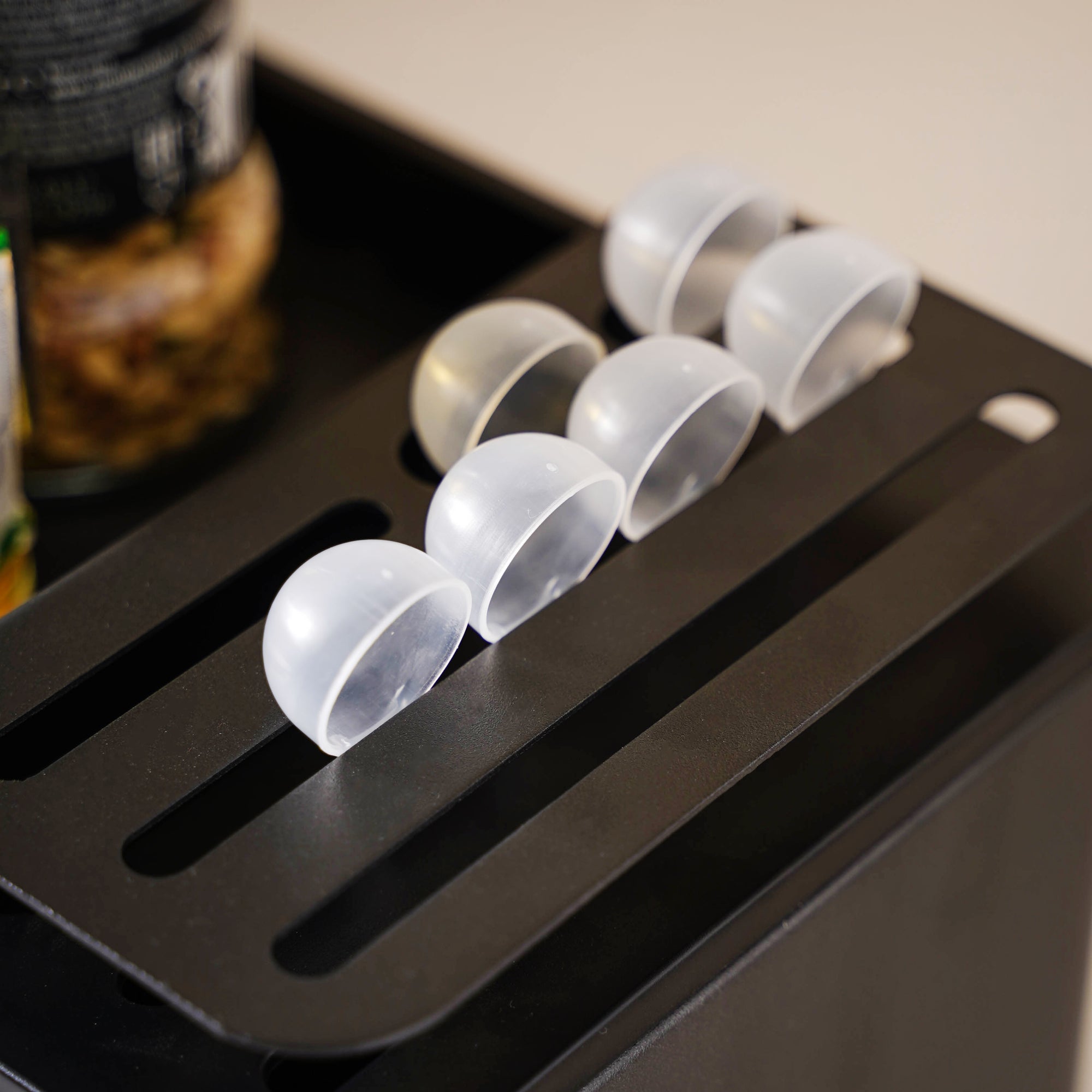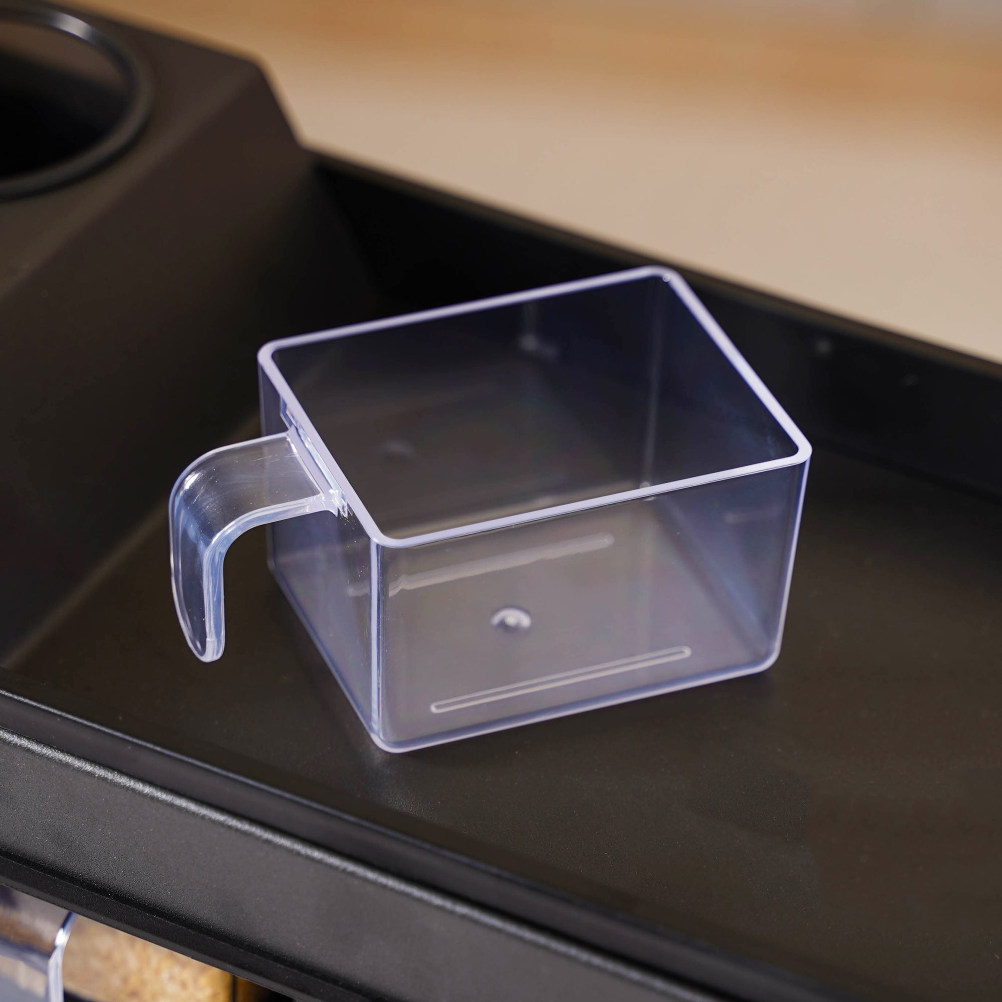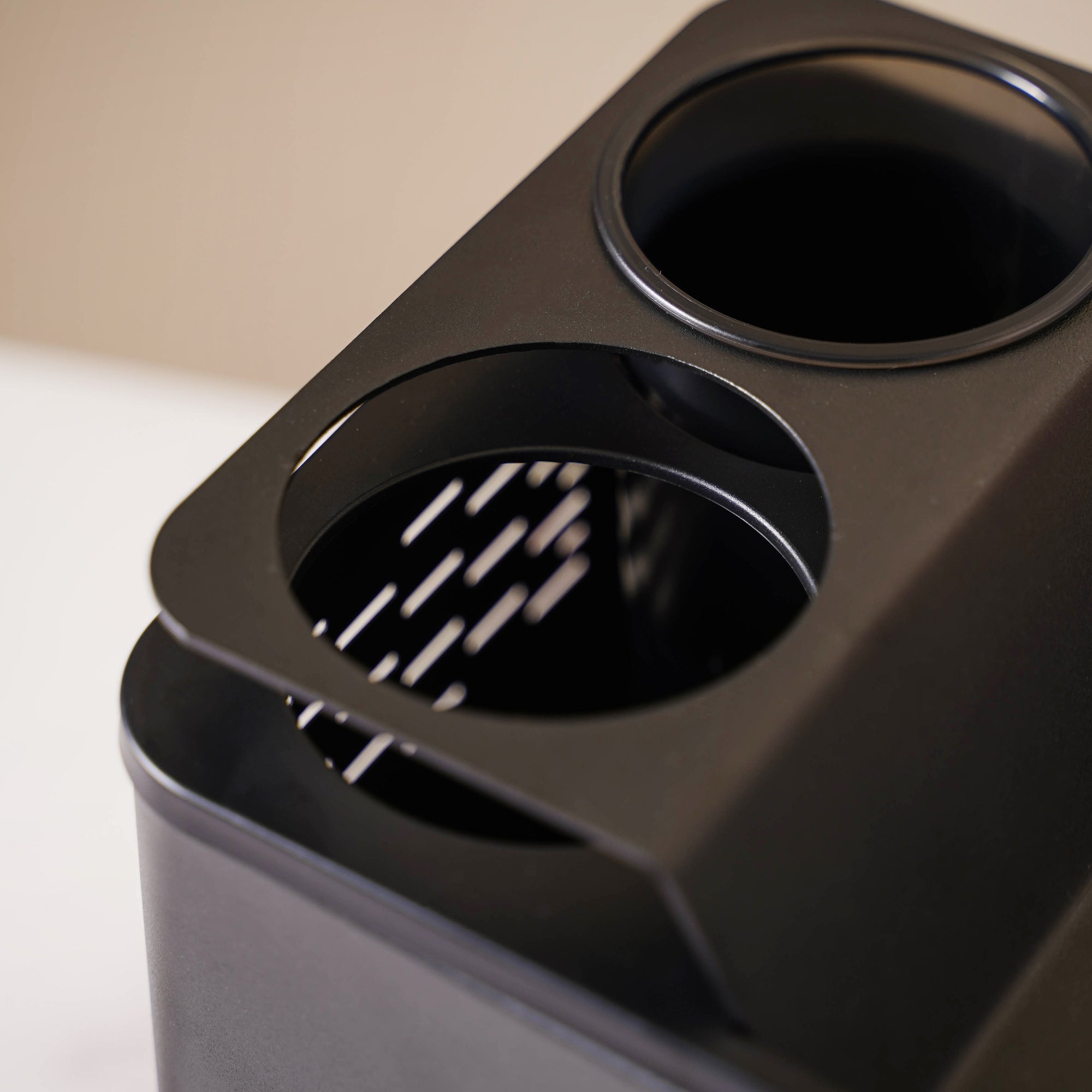 The black ventilated kitchen storage rack is crafted in high-quality metal and comes with multiple compartments to store a variety of kitchen utilities. The top rack is equipped with slots for holding spatulas, ladles, or knives. The two perforated tumblers can be used for storing a variety of cutlery such as chopsticks, forks, spoons, and a lot more. The center of the storage rack with a transparent door can be opened to arrange spices in the six PVC containers which are equipped with six tiny spoons. This storage rack is the ultimate space-saver for any modern kitchen. Features: -closed storage for grains and spices-double decker storage with top rack for condiments and sauces-side storage for cutlery, knives, spoons-easy pull out container for spices with spoons -suitable for the kitchen, dresser, bathroom or garden -removable shelves for hassle-free cleaning -perforated racks for easy drainage -racks can be disassembled for storage when not in use-durable and space-saving -easy and effortless to assemble -innovative design -stable and strong base Nestip: Gift this space saver storage kit to a friend who is setting up a new home. Size: 43cm L x 18cm B x 25cm H Cup- 8.5cm L x 7cm B x 5cm H Glass- 7cm D x 11cm H Spoon- 9cm L Color: Black Material: PVC and metal Products included: 1 set of storage racks Style: OMG114KU05