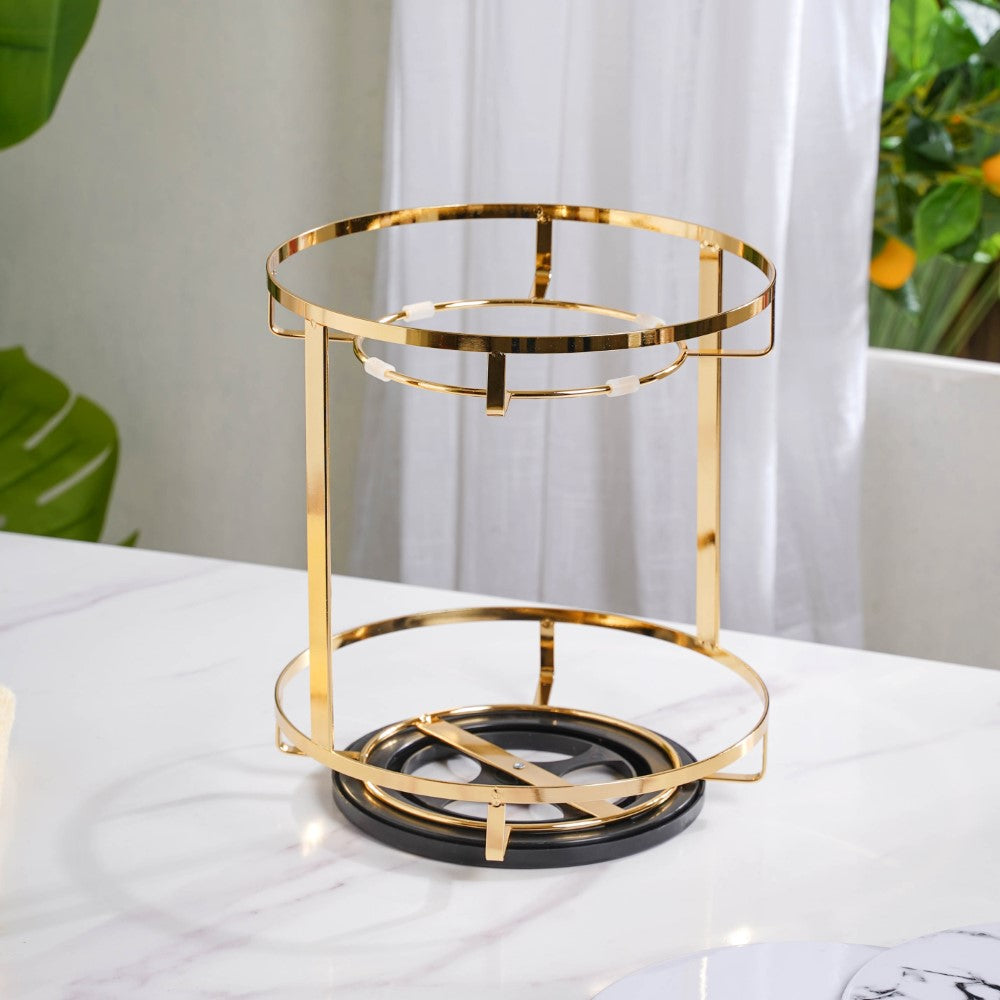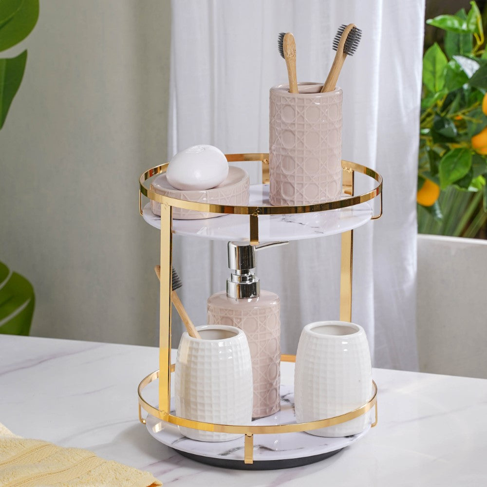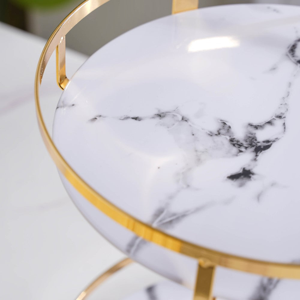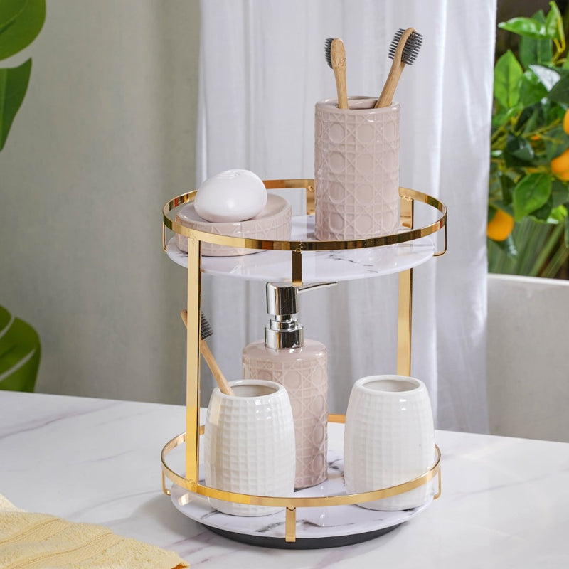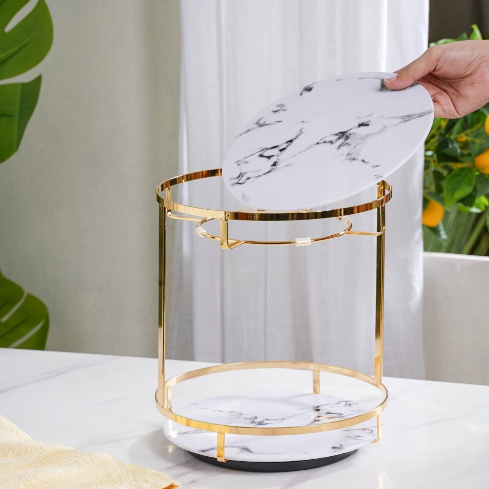The extravagant yet sleek round tray table when placed on a vintage dressing table will elevate the overall appeal of the contemporary room. The two-tier rotating rack with a gold finish structure and marble print slabs is not only appealing but a great utility object. From make-up to beauty products, the rotating two-tier rack is ideal for accommodating all the essentials. The rotating feature makes all the objects accessible even if the rack is kept in a corner. Features:-aesthetic gold metal rack and marble base -suitable for the bathroom, kitchen, dresser, or garden -rotating base with smooth ball bearing-double decker storage rack for double storage space -removable shelves for hassle-free cleaning-easily access products through -slabs can be disassembled for storage when not in use-durable and space-saving -easy and effortless to assemble -innovative and flexible design -stable and strong base Nestip: One can place the rotating tray on a dining table and arrange cupcakes for a housewarming party. Size: 23.5cm D x 26cm H Color: White Material: PVC and metal Products included: 1 set of 2 storage racks Style: OMG114KU01
