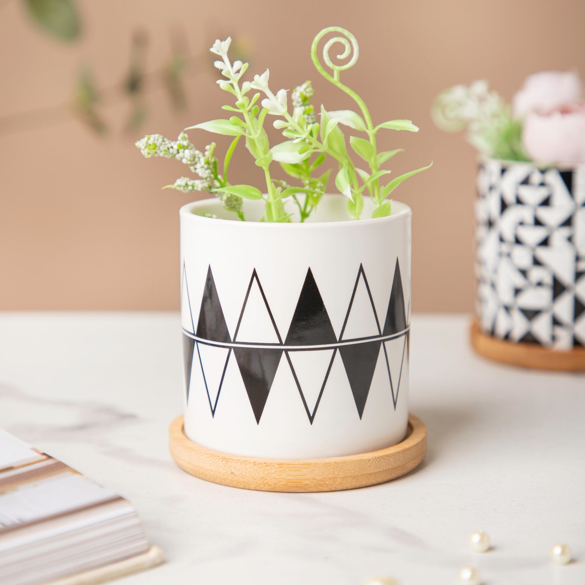 A band of triangles is tied to the white ceramic planter, as a symbol of fondness and unending care. Preserve the affection and nurturing spirit towards the green babies with the Twyla triangle band planter. The planter is made in the right size to fit any corner of the table. The small planter can be kept on a shelf or on a study table with the company of the wooden coaster.