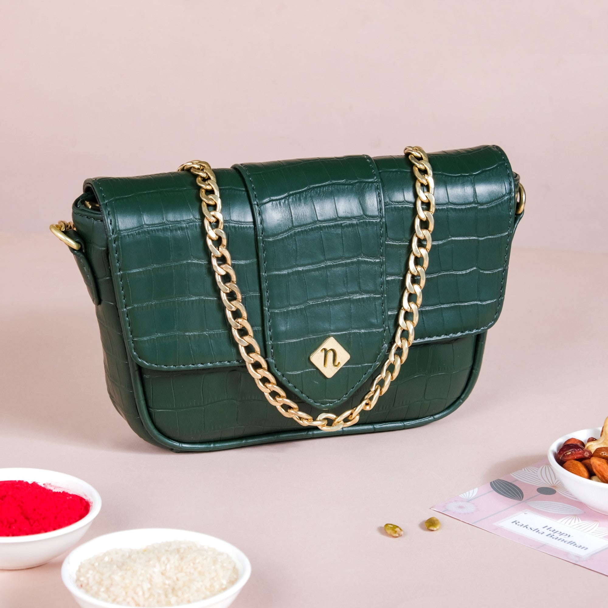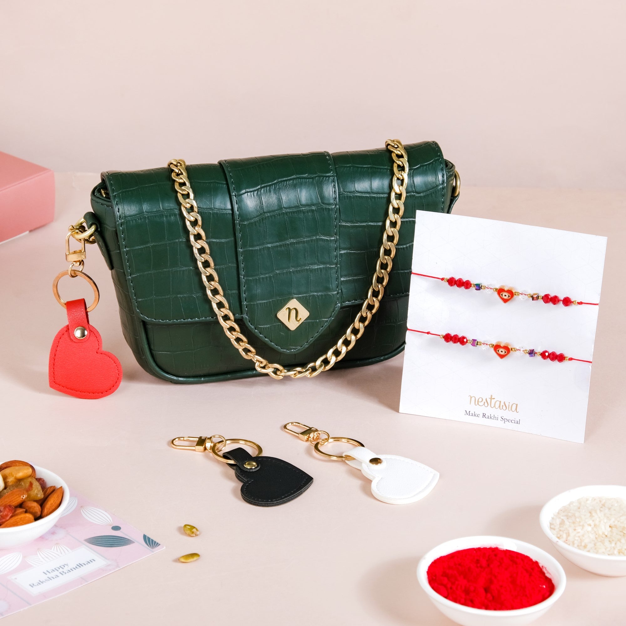 Express your affection with this charming Rakhi gift hamper, thoughtfully curated for your sister. This elegant set includes two beautiful bracelet Rakhis. The stylish green Croco bag with a golden chain handle adds a touch of sophistication. The three heart keychains in vibrant colours are perfect for keeping her keys in style. The hamper also features a roli-chawal set for the traditional touch, a pack of premium mixed dry fruits for a healthy treat, a beautifully crafted gift box, and a heartfelt wish card. Show your sister how much she means to you with this delightful Raksha Bandhan hamper.