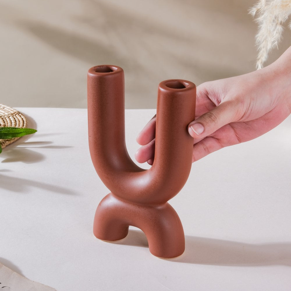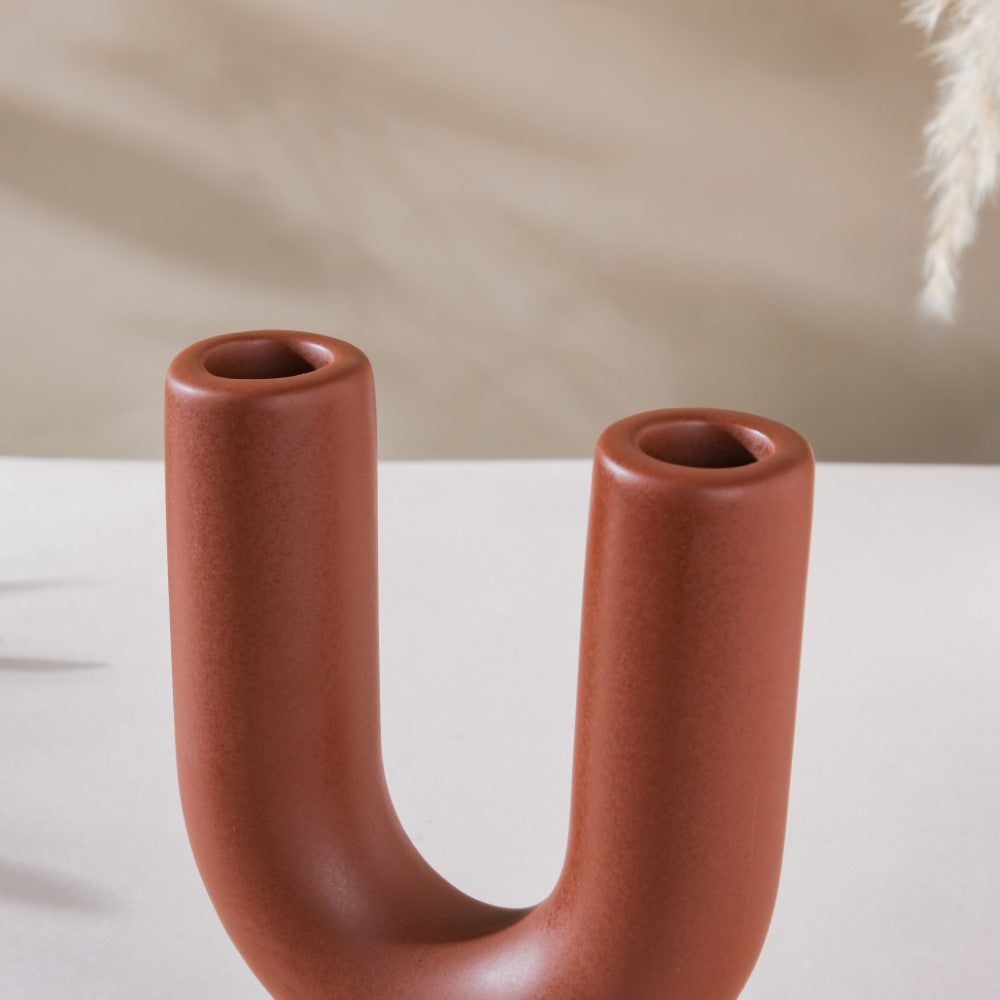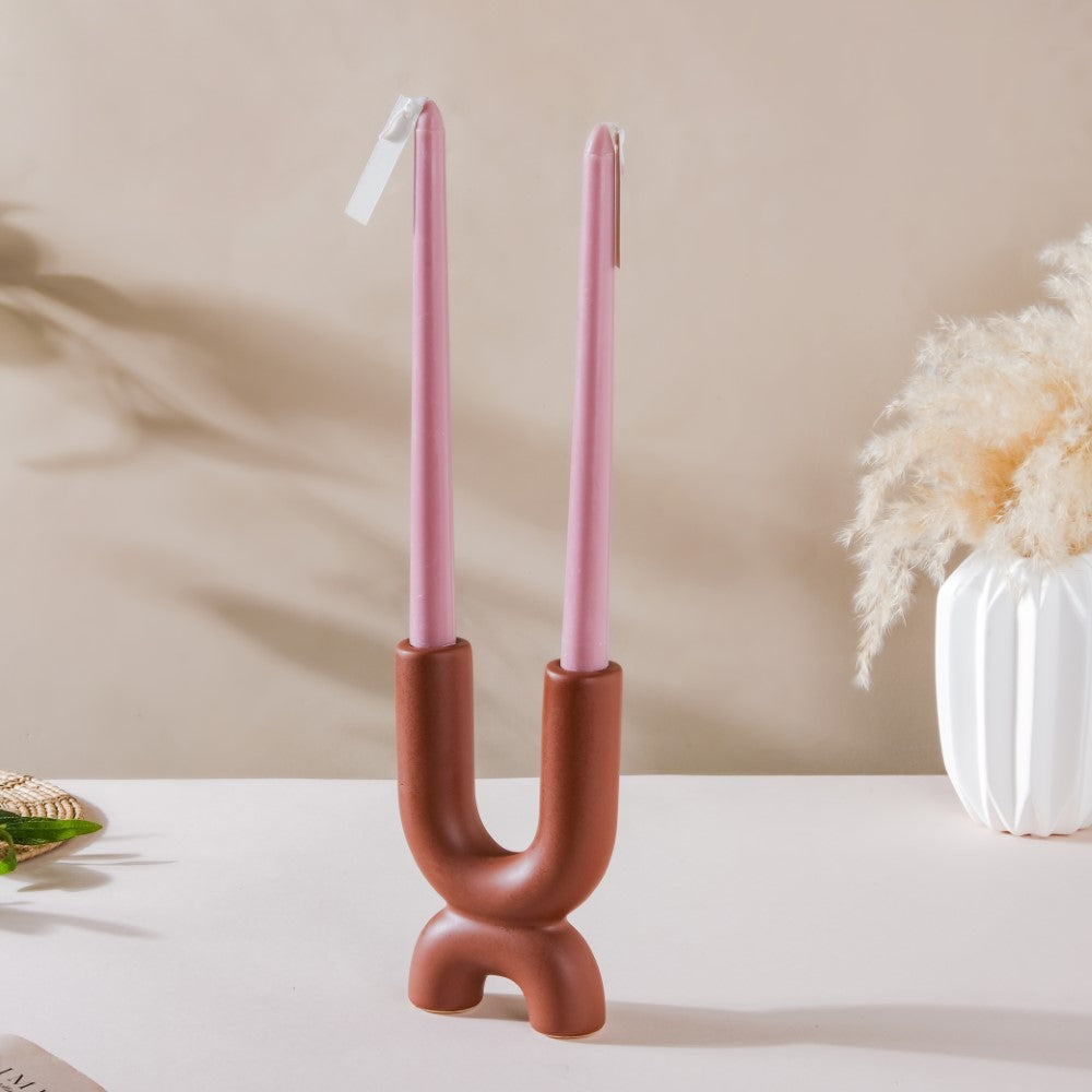 Add luxury and elegance to the space with the stunning candle holder. The candle holder has been handcrafted of ceramic and features a rustic brown colour. The U-shaped candle holder has 2 slots for placing tapered candle sticks with a foam base to prevent any scratches on the table surface. The candle stand can be used as a candle stand for the dining table or can be placed on an elevated area to brighten up the interior.