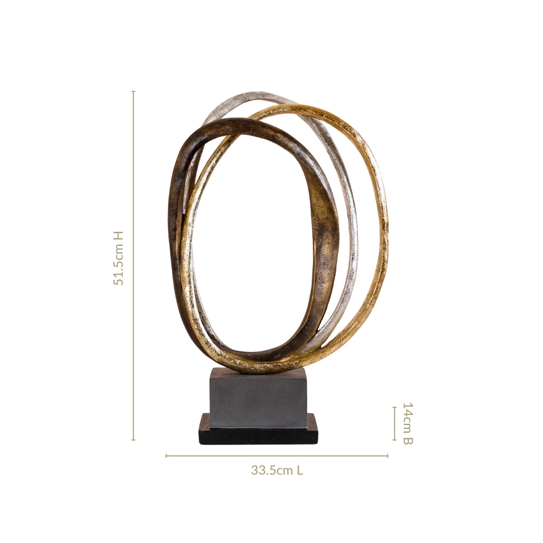 Design: This modern decorative sculpture showcases a striking interlocking ring design in an antique gold and silver finish, mounted on a sturdy black pedestal base. Made from premium resin, its metallic colour adds a shiny sheen along with depth and character, creating a sophisticated yet contemporary look. Its abstract form symbolises infinity and unity, making it a versatile accent piece. Perfect for display on office desks, console tables, or living room shelves, this art-inspired decor blends seamlessly with modern and transitional interiors.