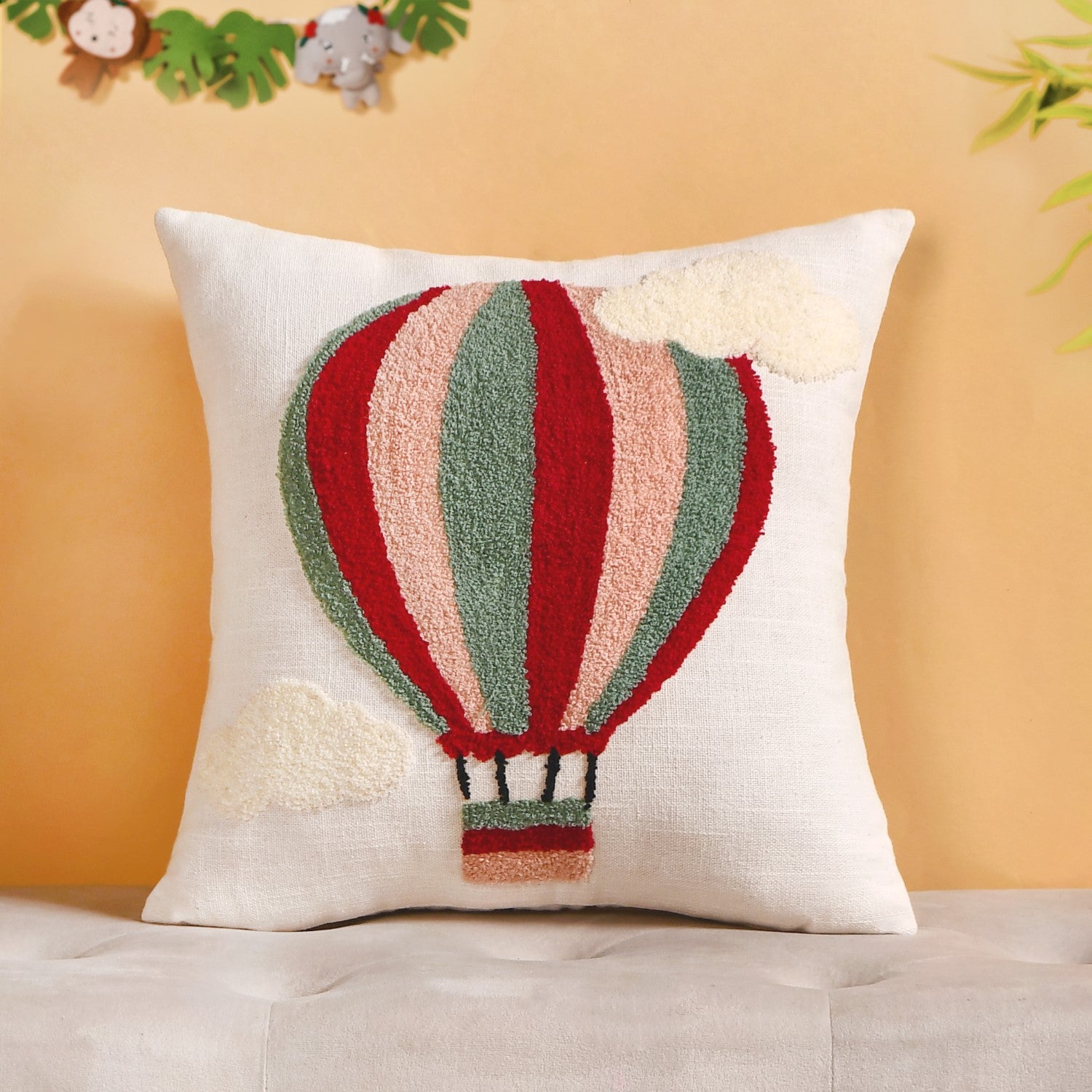 Nestip: Place the hot air balloon cushion near a reading nook or a relaxed corner to evoke a sense of adventure. Pair the rainbow heart cushion with soft, pastel throws in a playful arrangement on your bed.