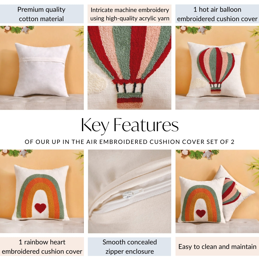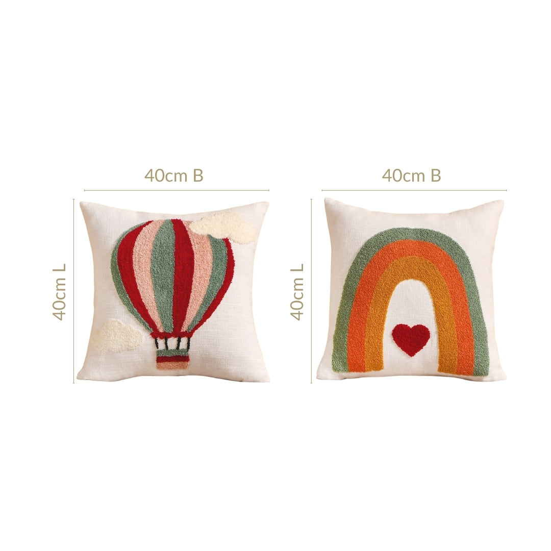 Let your space soar with charm and joy with the ultimate essence of whimsy and joy. The first cover features an embroidered hot air balloon floating high amidst two fluffy cotton clouds, bringing a sense of adventure and serenity to any room. The second cover adds a vibrant pop with a colourful rainbow arching over a heart, spreading love and joy in every stitch. Together, they create a delightful, uplifting atmosphere.
