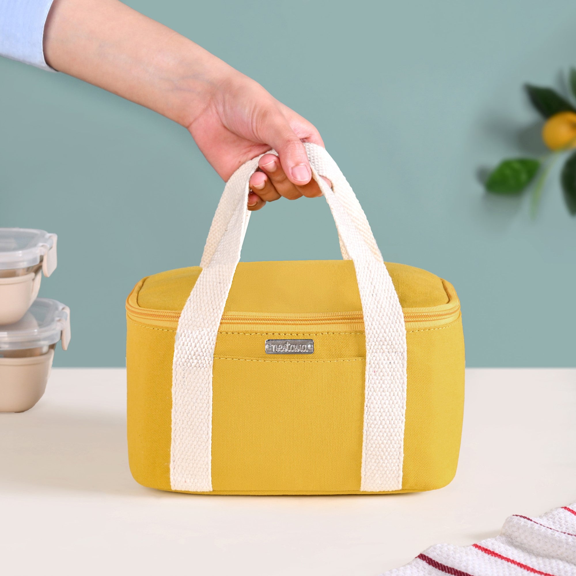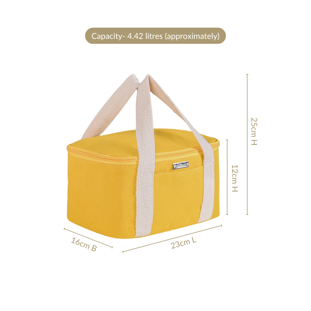 Design: This rectangular, stylish lunch bag for work is made of durable canvas and features a vibrant mustard yellow body with off-white cotton handles. It has a smooth zipper system that opens to a spacious interior lined with a high-quality silver insulation lining. A handy small outer pocket on the front is perfect for holding candies or condiments, while an inner mesh pocket helps keep your cutlery organised. The bag is also equipped with two sturdy off white cotton handles.