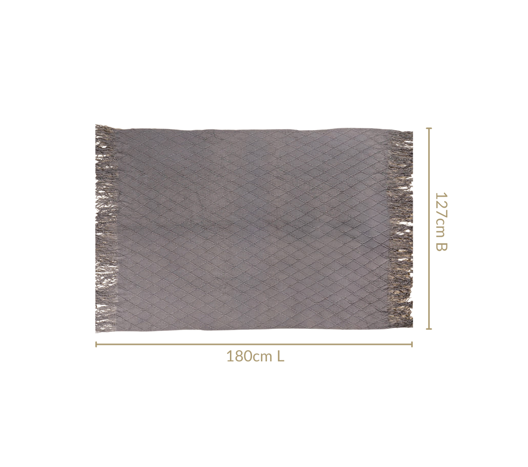 Design: Dressed in a sophisticated, cool dark grey, this piece is crafted from acrylic yarn. The design features a classic quilted diamond pattern with a raised, textured finish that creates wonderful visual depth. It is finished with an elegant fringe edge that adds a touch of contemporary charm to its look.