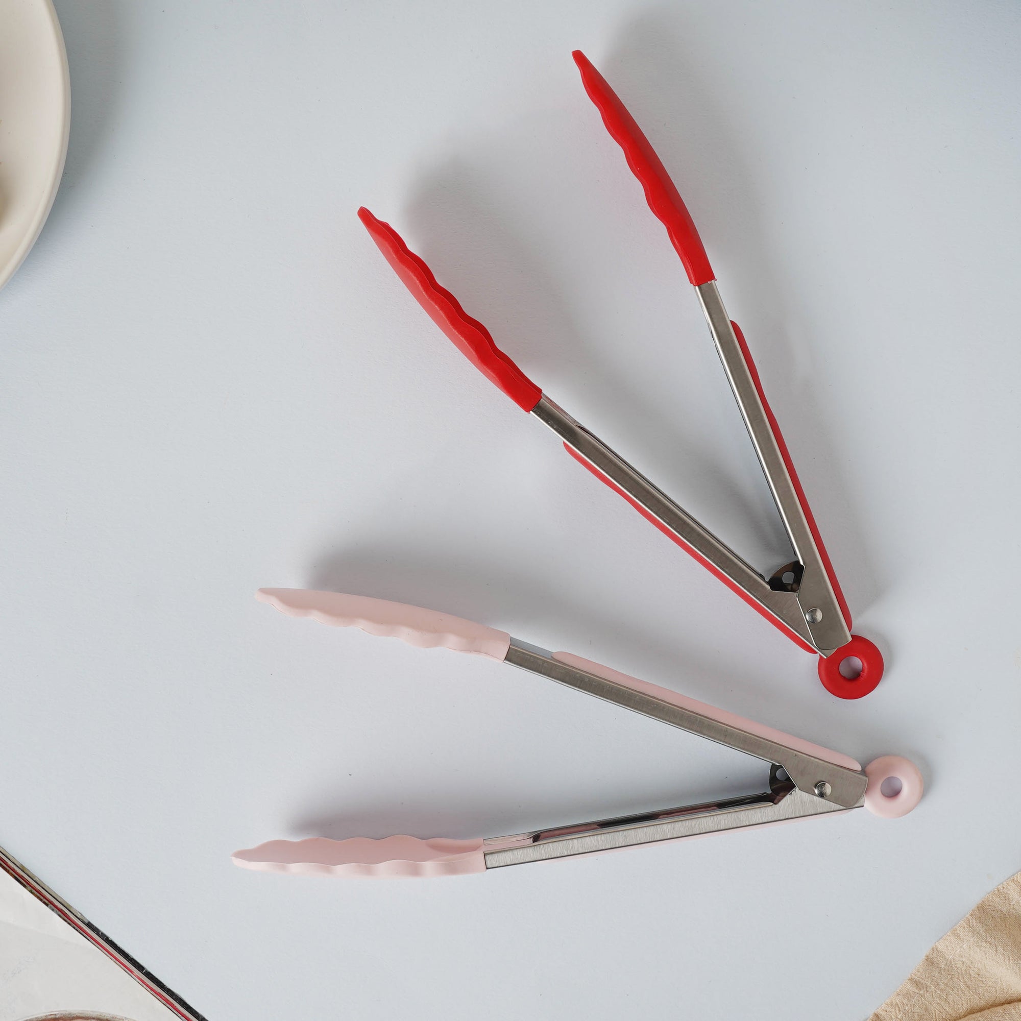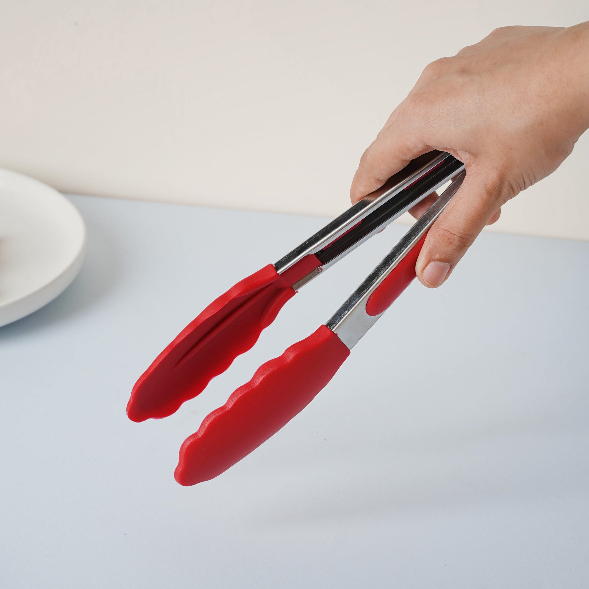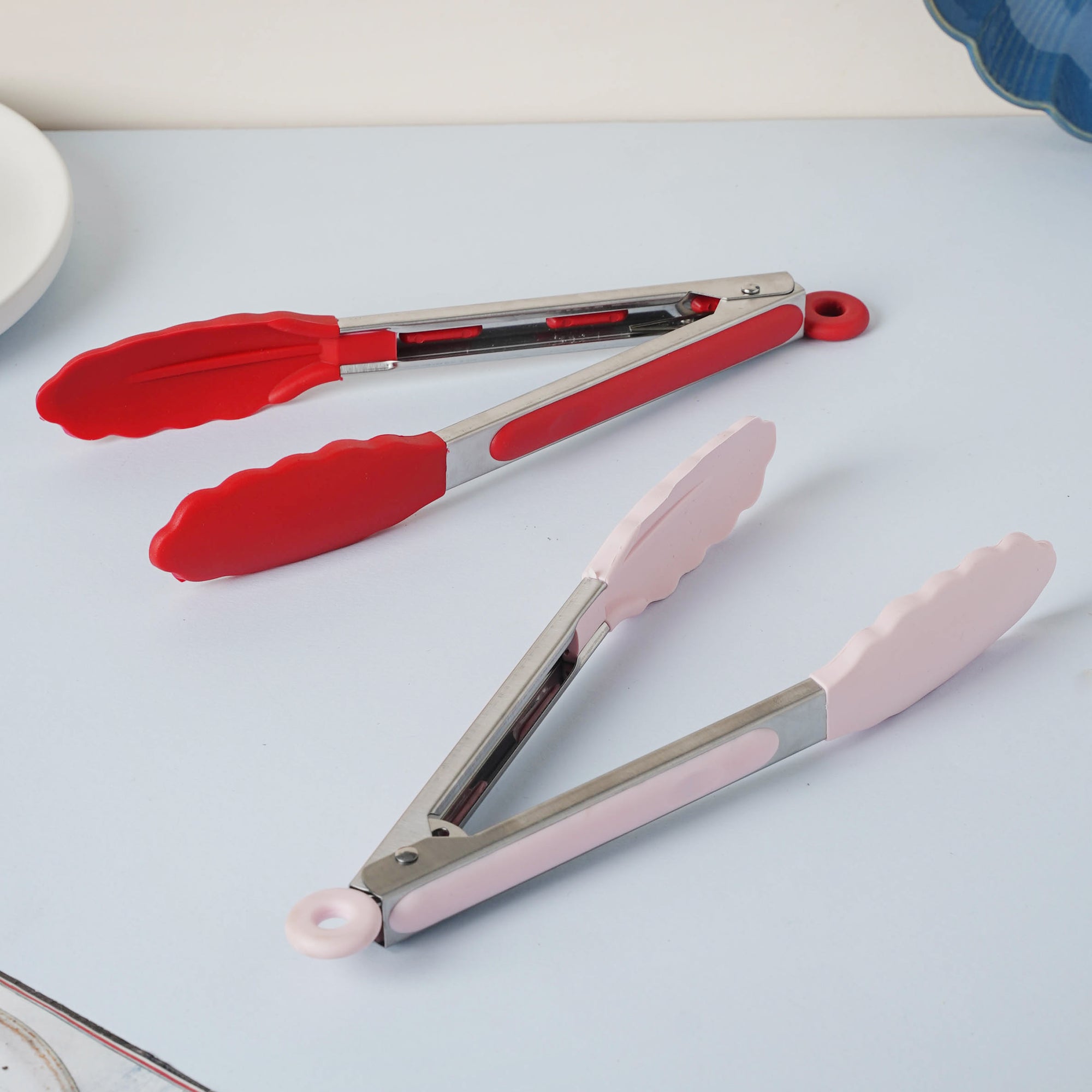 The utility tong made of PVC and metal is used to pick up food items at the dinner table. The metal tong comes in 2 color variants - pink and red to choose from. The pair of tongs can also be used to toss salad and mix spices into a bowl.